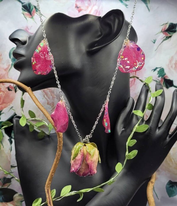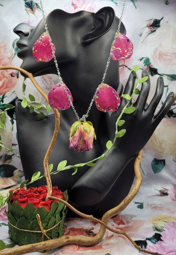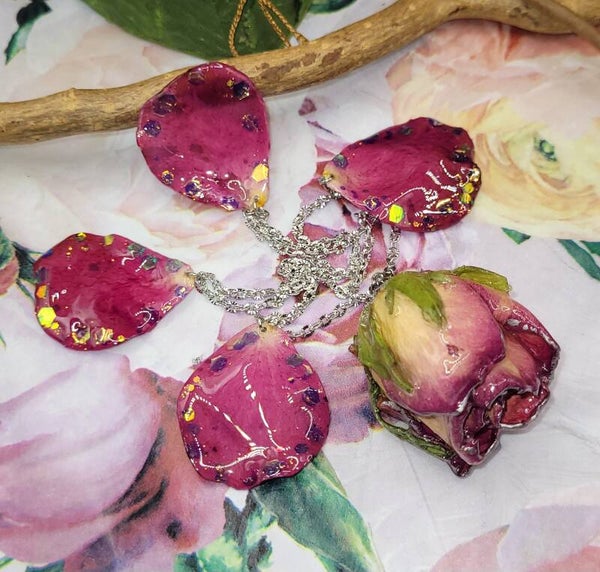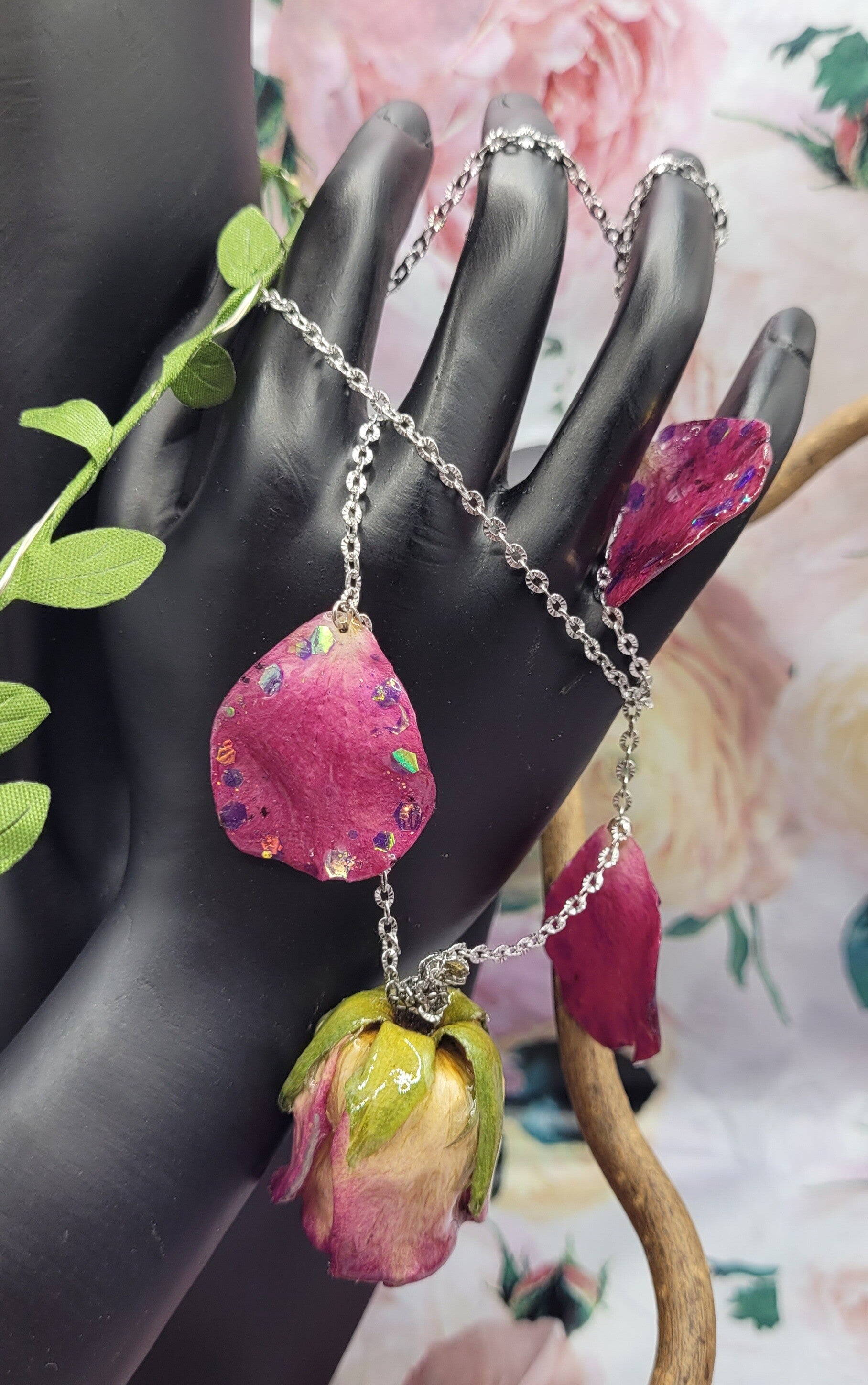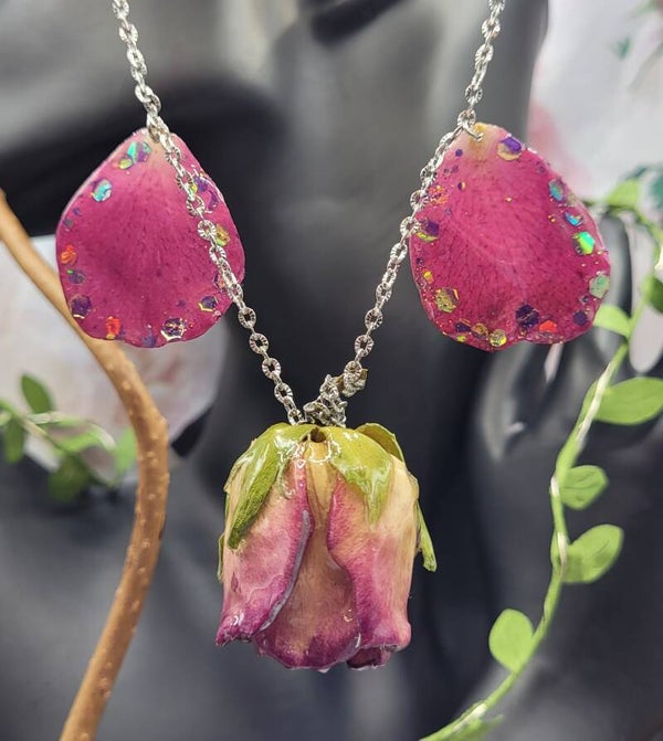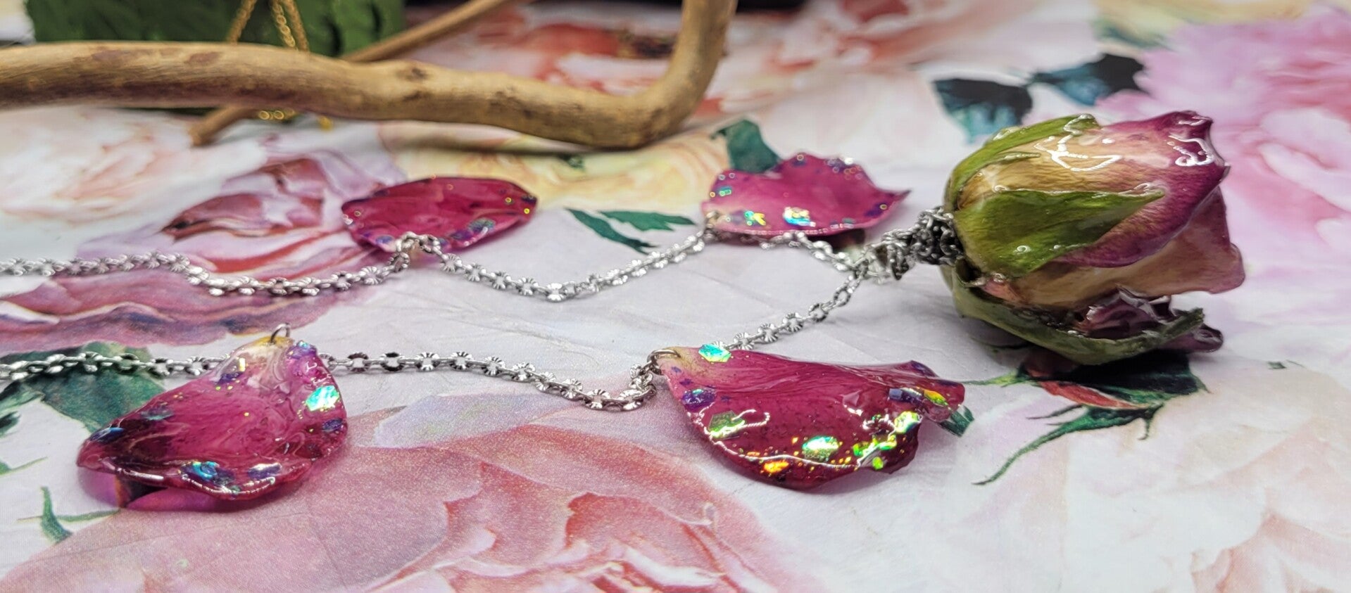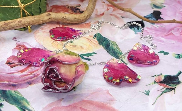 4 pétales couleur fuschia , avec des paillettes sur les bords , sont installés en pampille sur les côtés de la rose