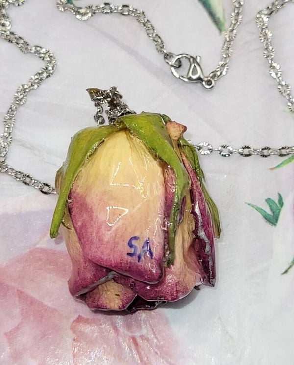 Collier composé d'une belle rose entière de couleur crème et fuschia qui est placée au centre du collier .