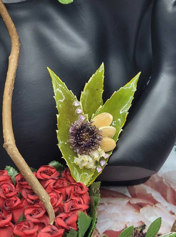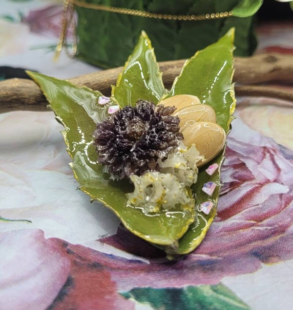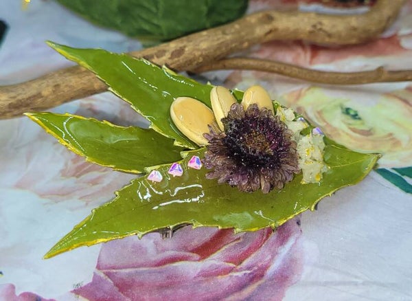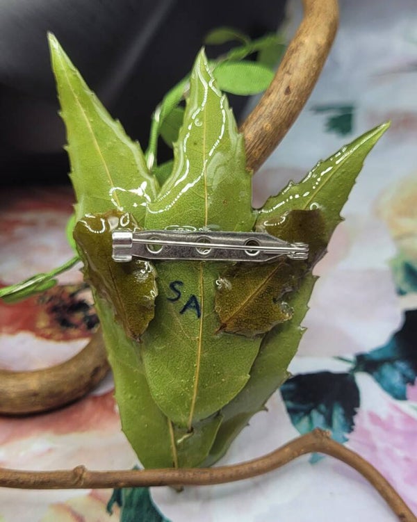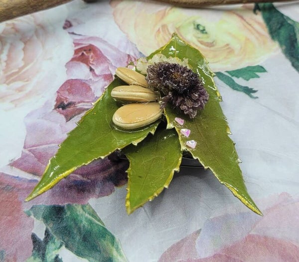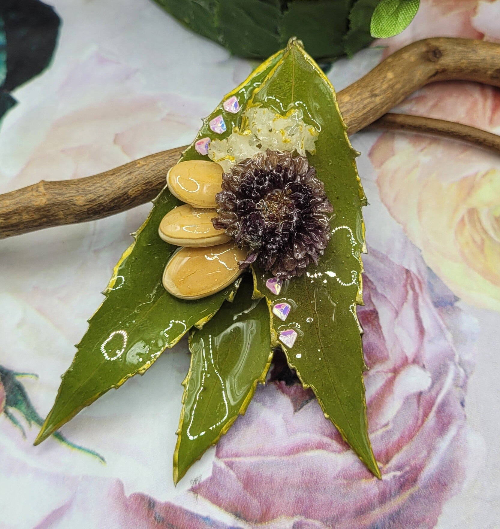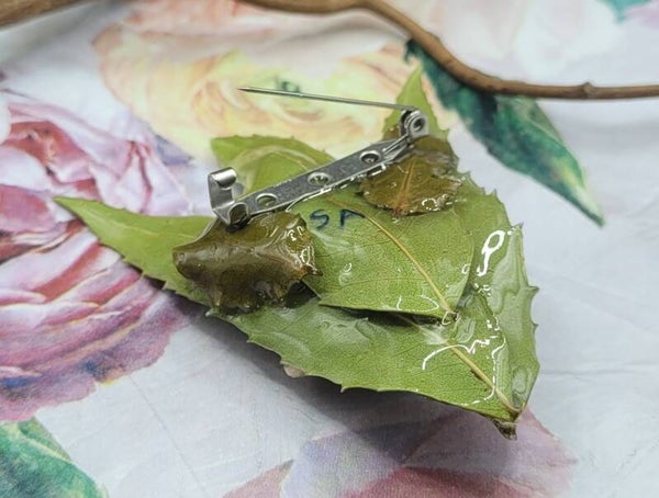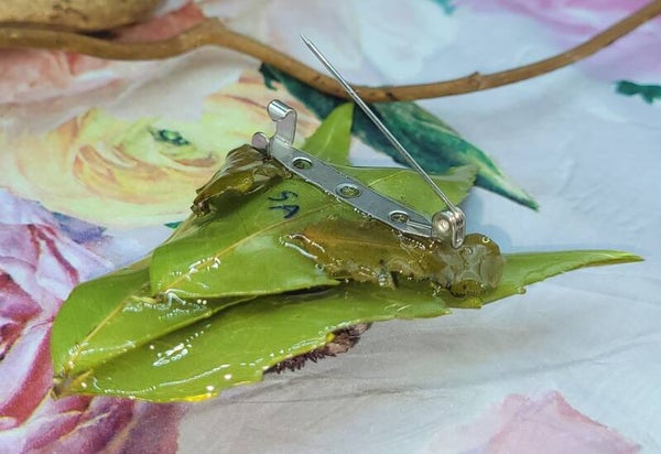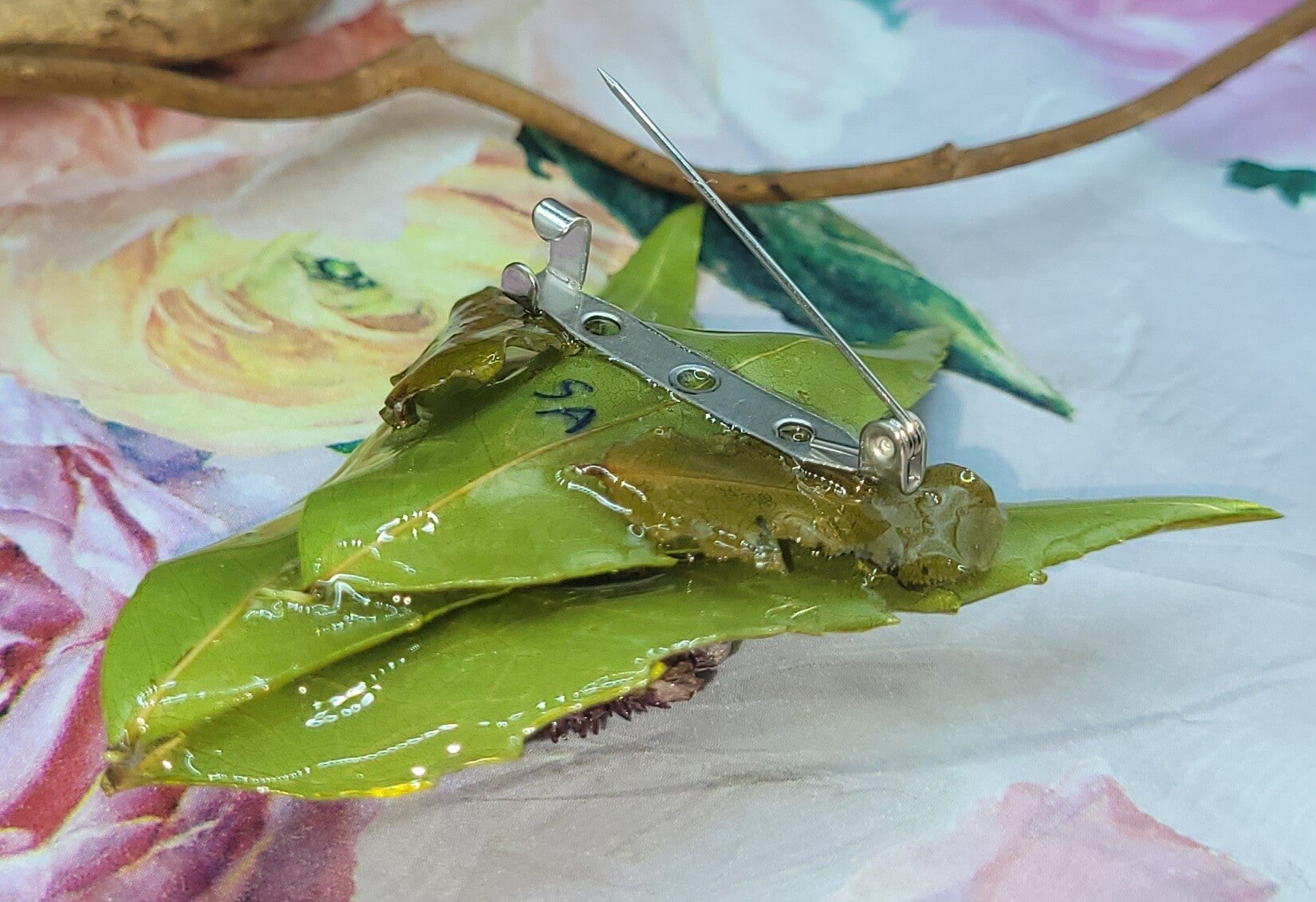 Broche composée de 3 belles feuilles de couleur verte et aux contours tracés en doré