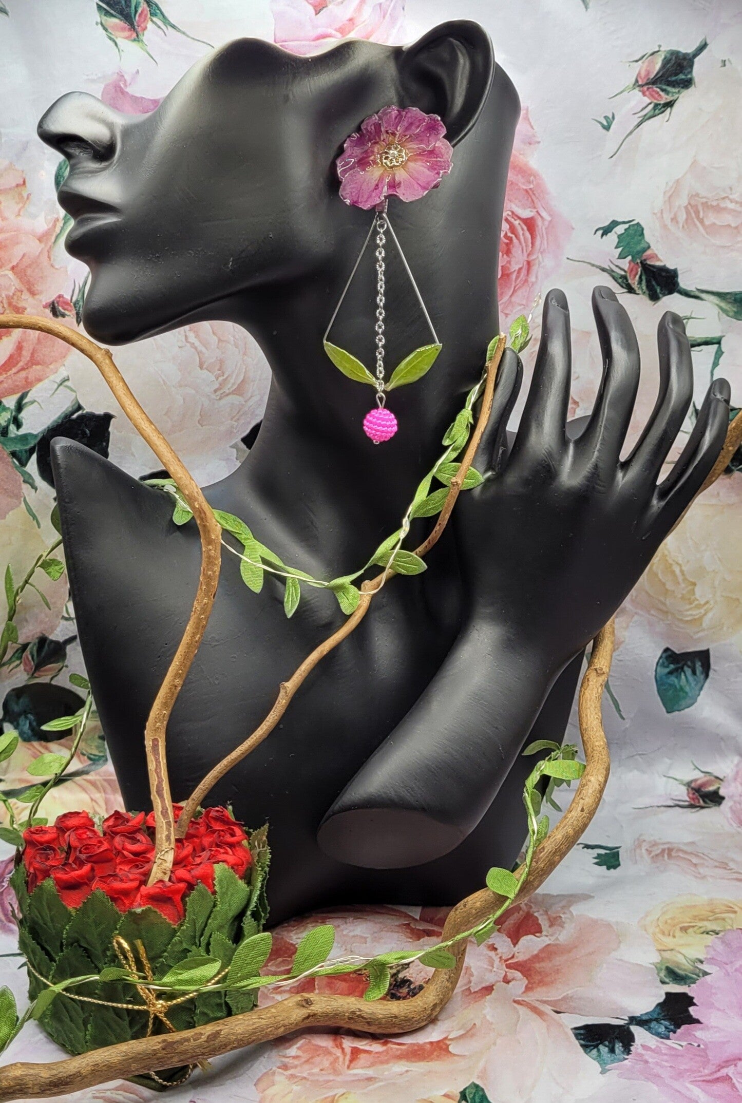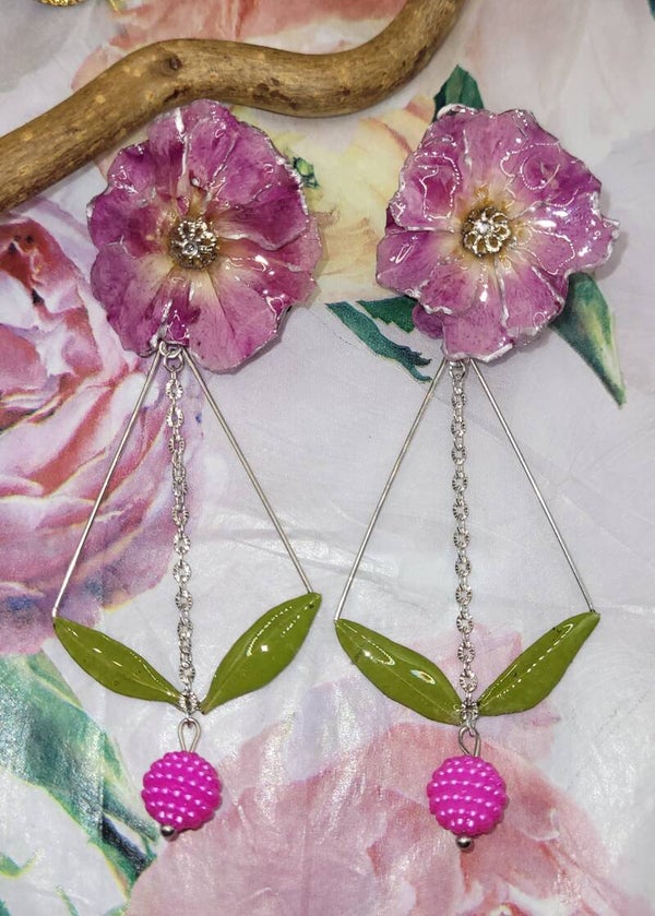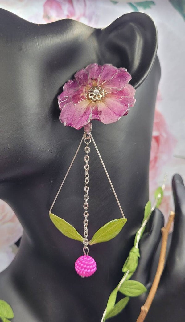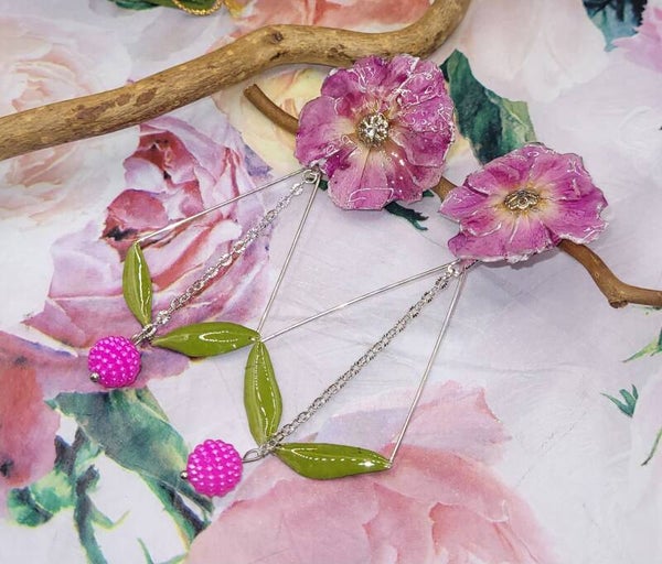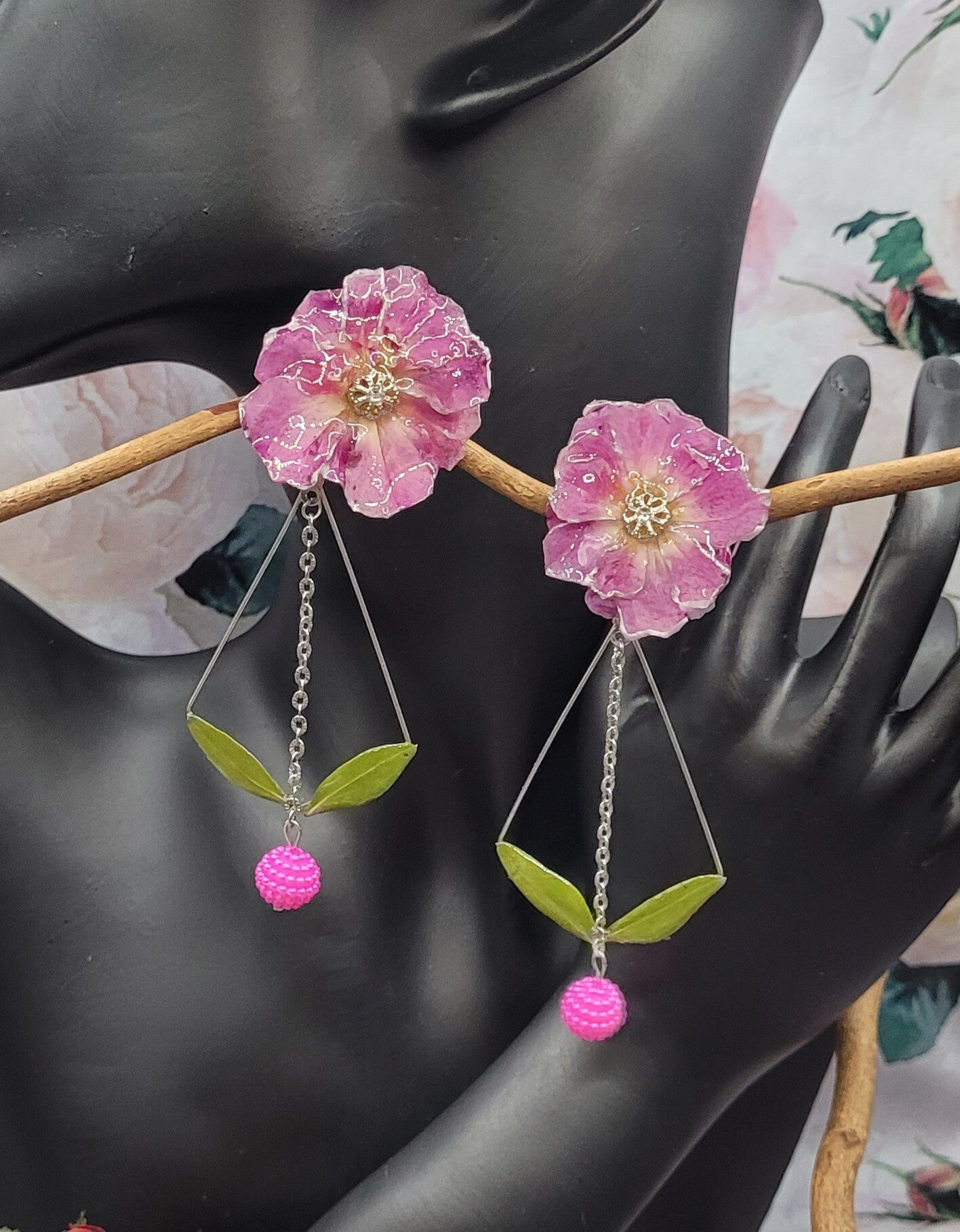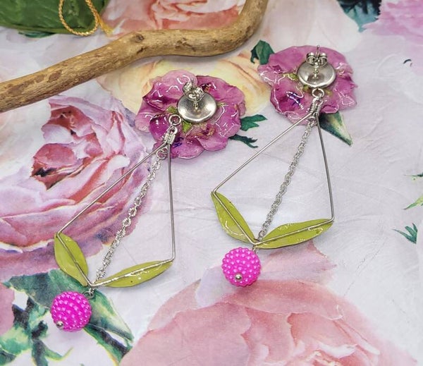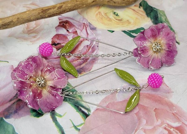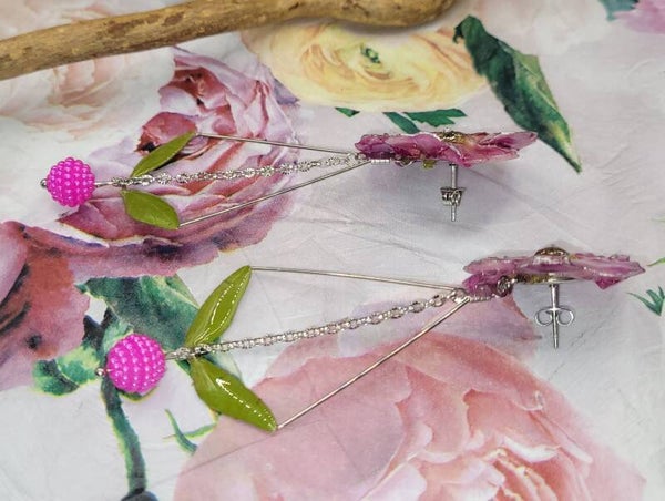 Une perle de couleur rose est ajoutée en pampille entre les 2 feuilles .