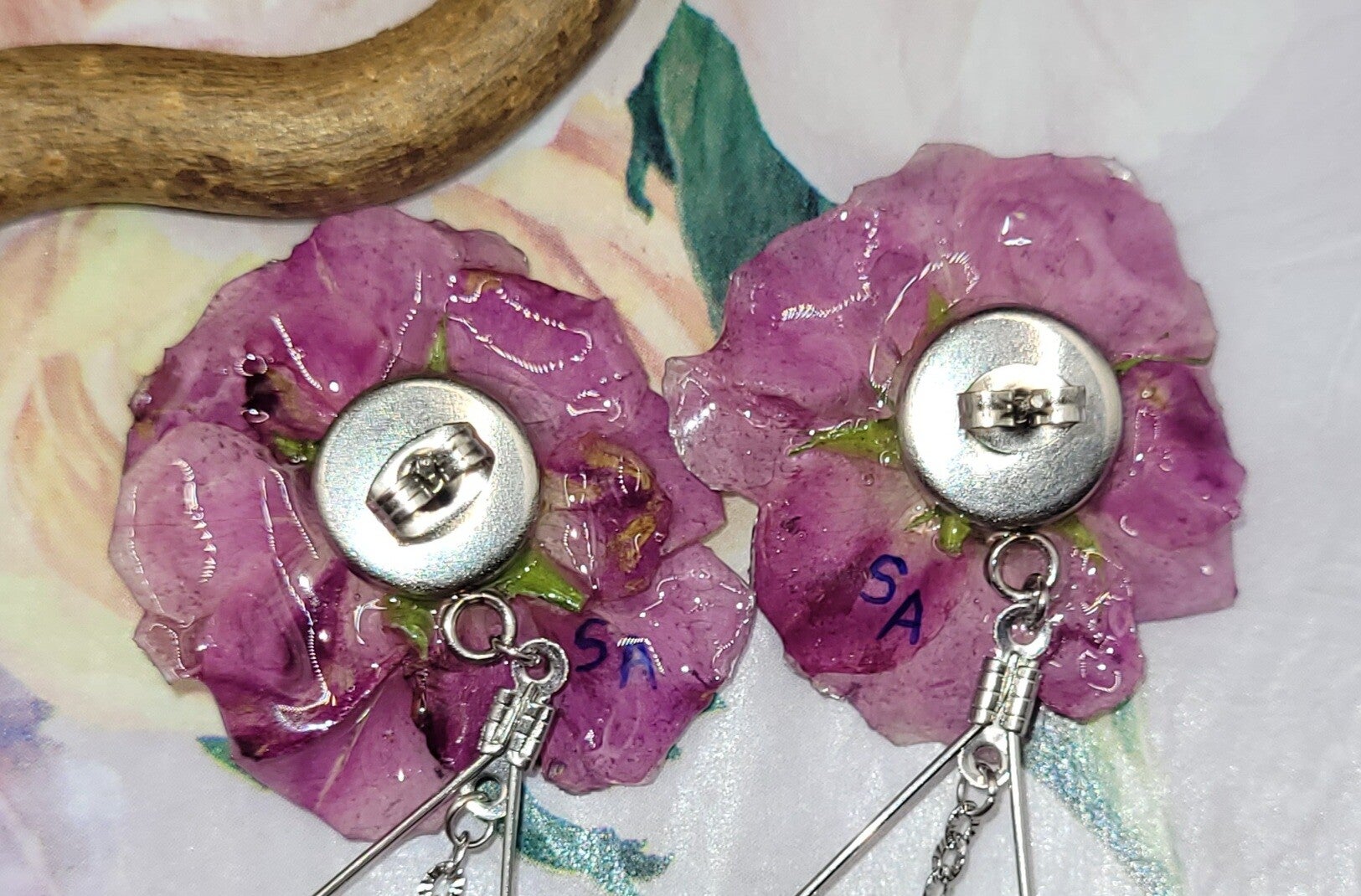 Le tout est scellé dans la résine et monté sur boucles d'oreilles en acier inoxydable