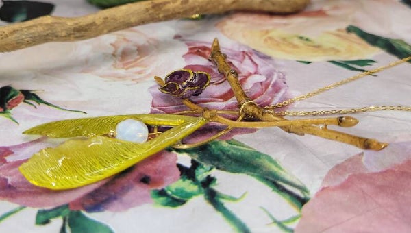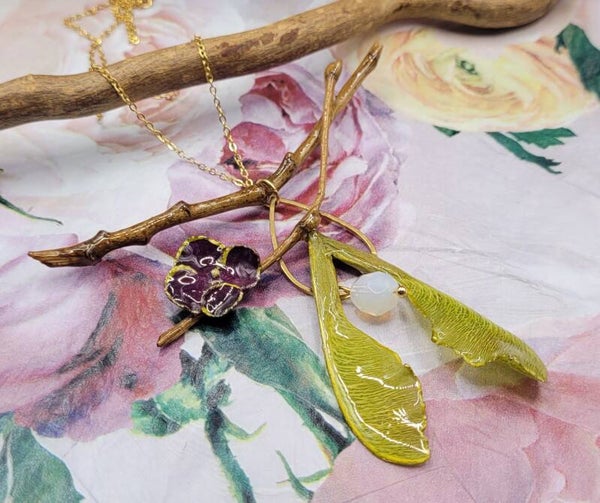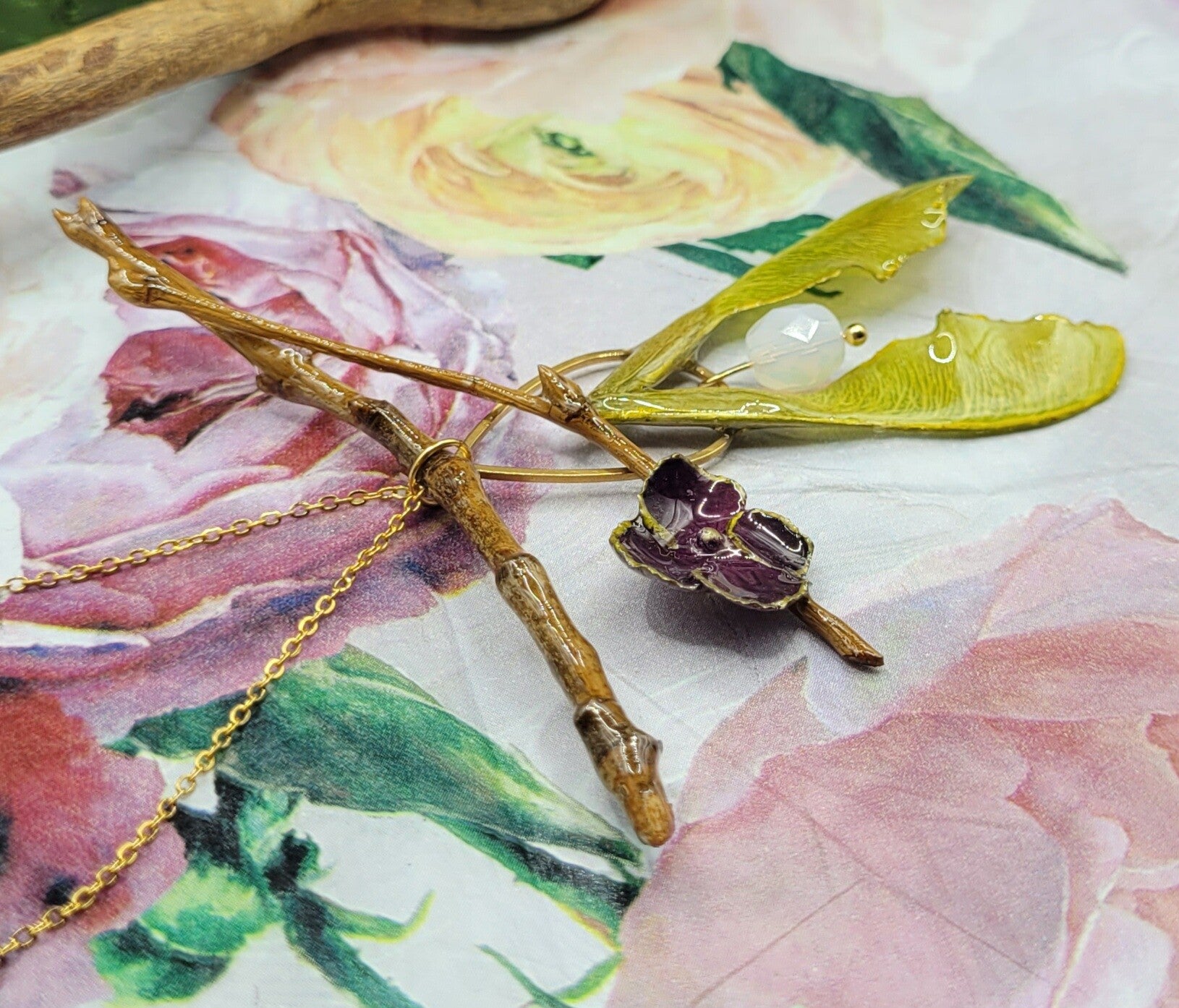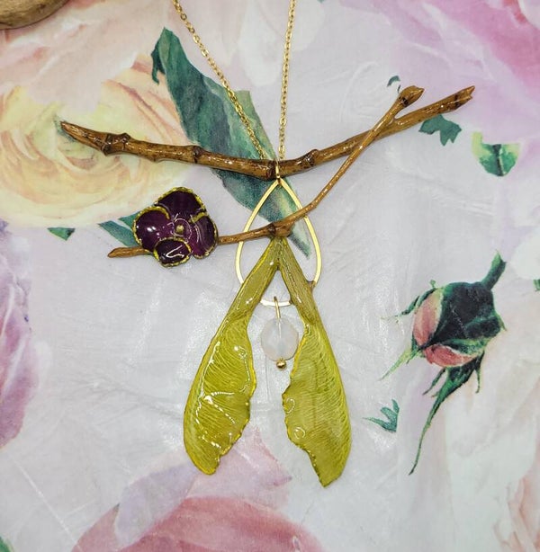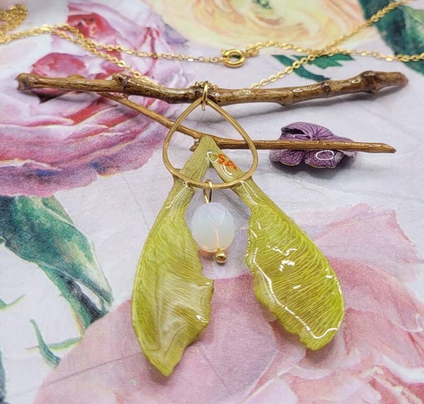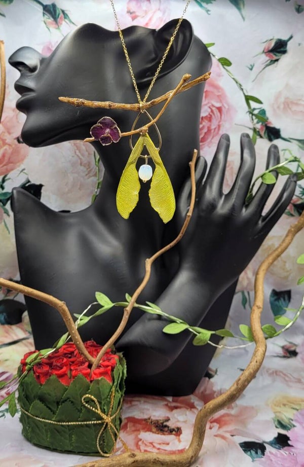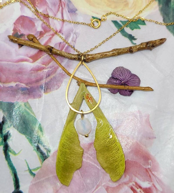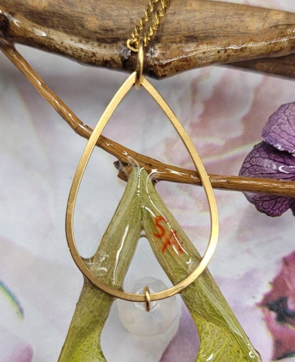 Un apprêt doré en forme de goutte d'eau est ajouté ainsi qu'une jolie feuille d'hélicoptère verte aux contours tracés en doré . Ces belles nervures sont apparentes