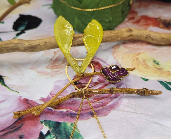 Une fleur d'hortensia de couleur violette et aux contours tracés en doré est déposée sur une des 2 branches