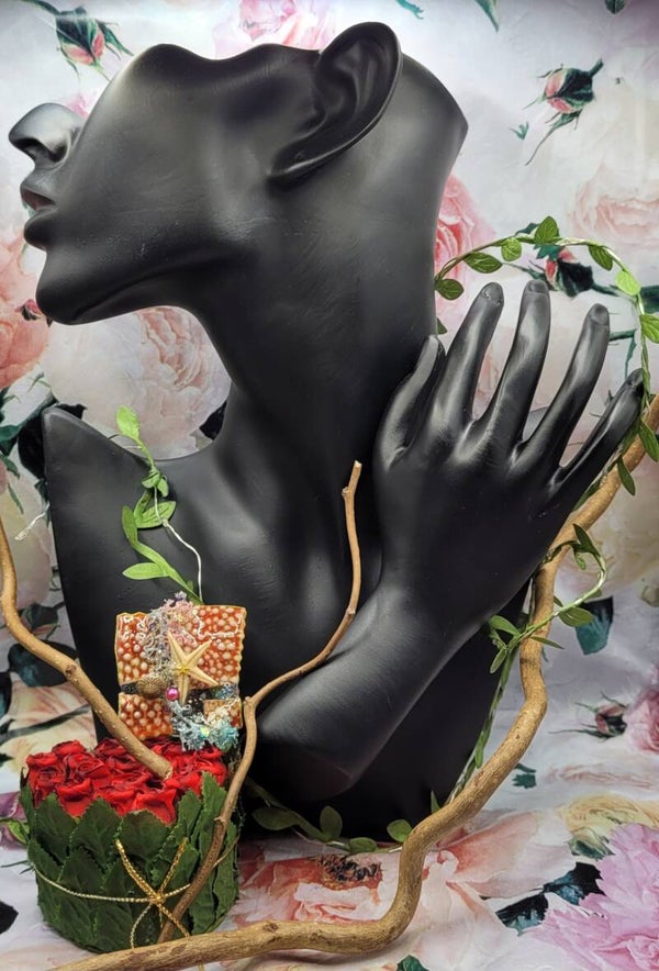 De la mousse végétale bleue et rose est ajoutée ainsi qu'une étoile de mer , un petit coquillage escargot et une petite fleur blanche