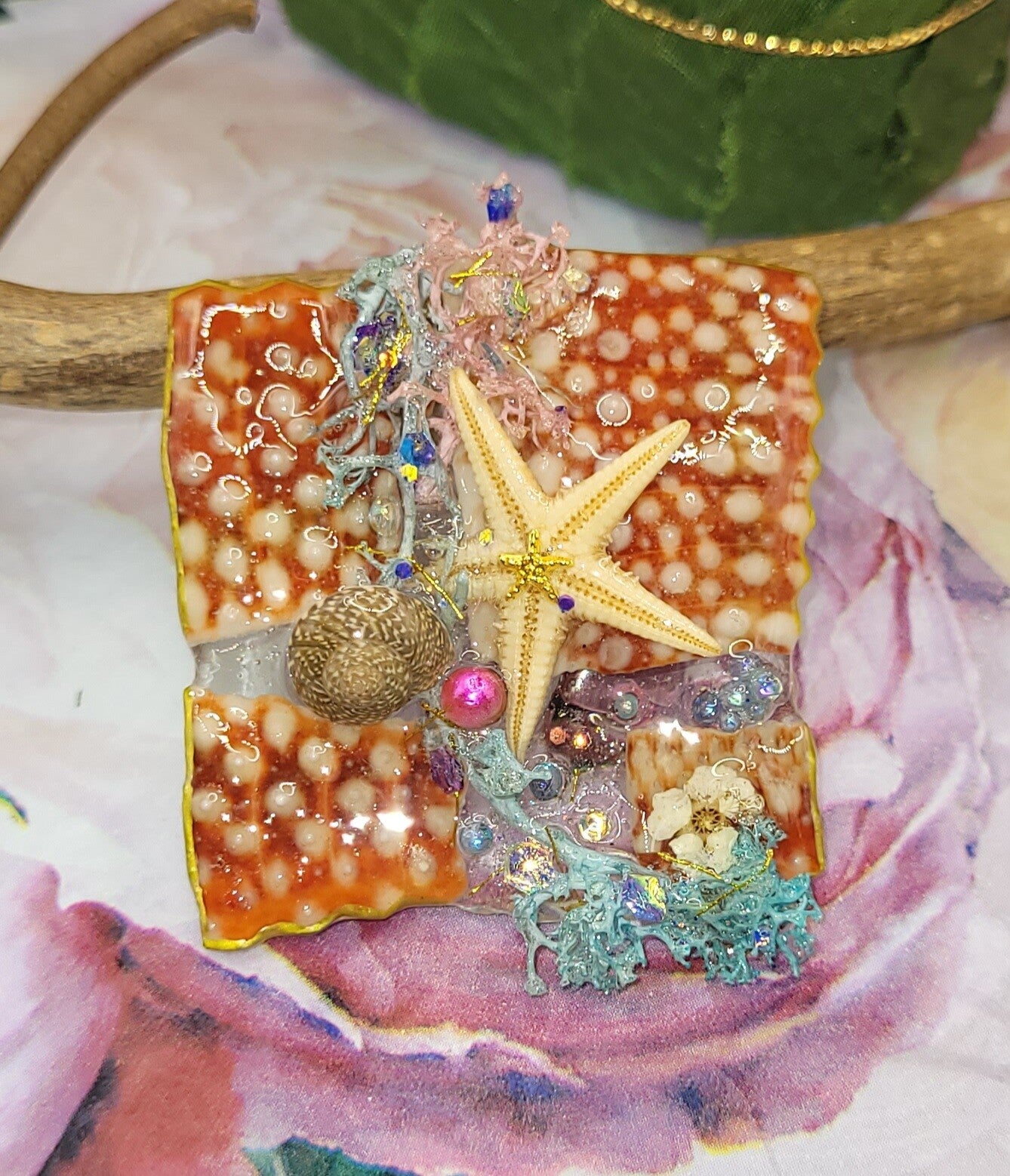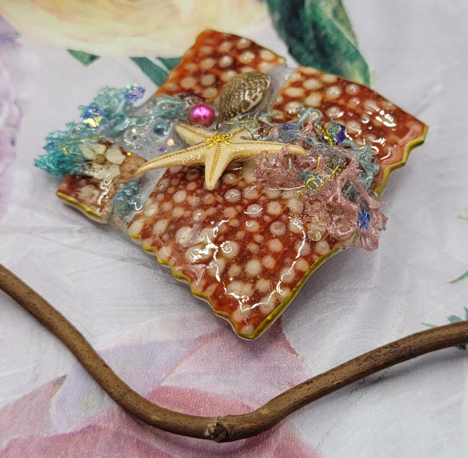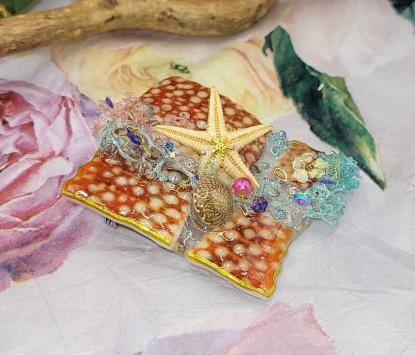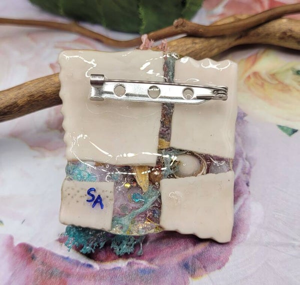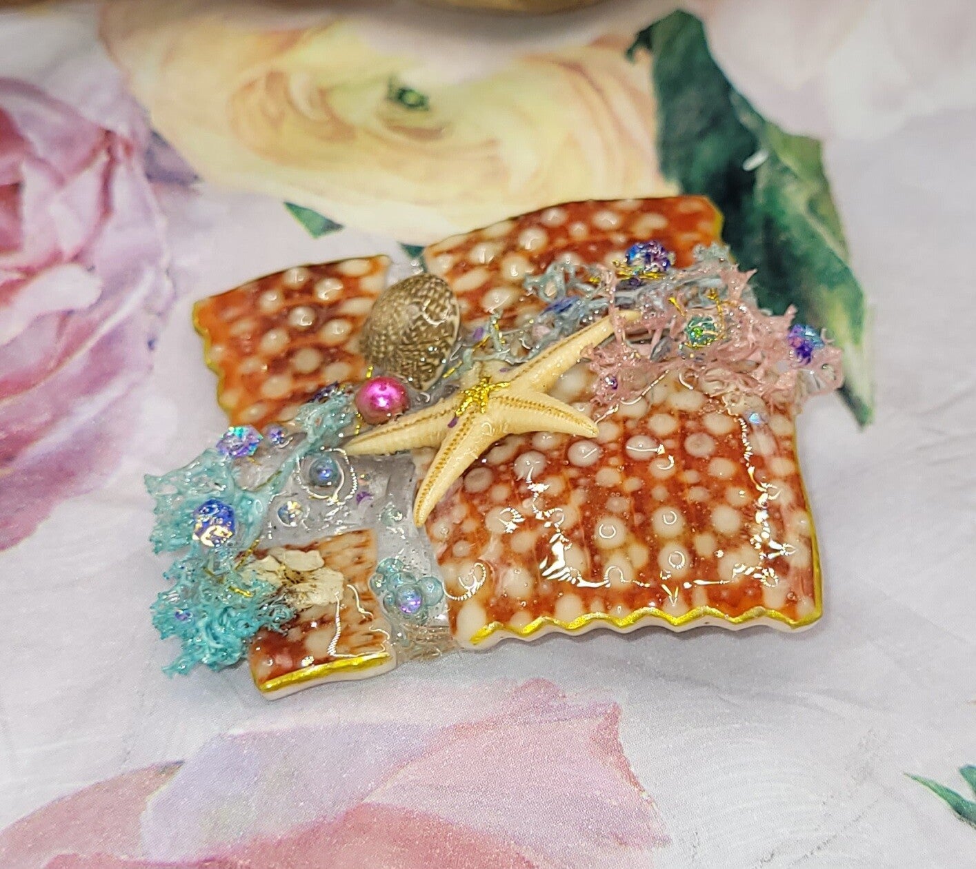 Broche composée de 4 morceaux de coquillages qui ont été rassembler sur un fond de résine , laissant la transparence entre chaque morceaux