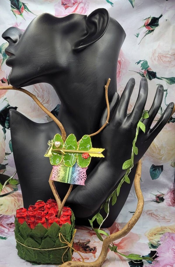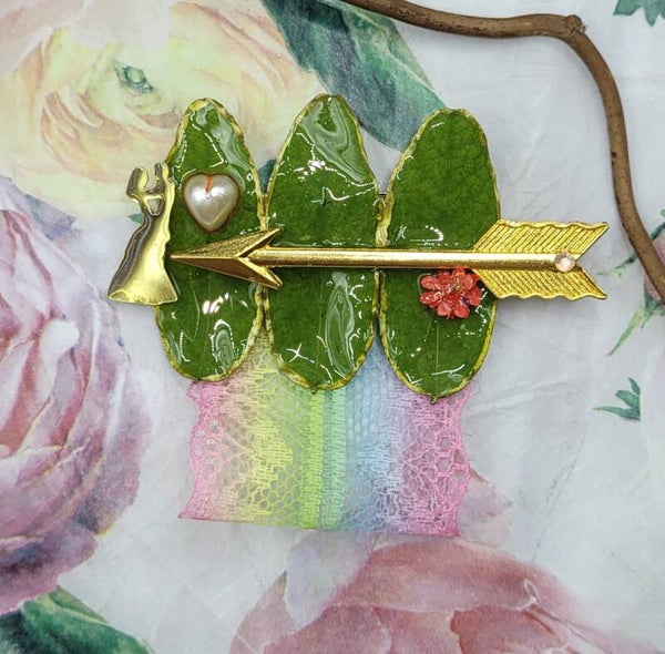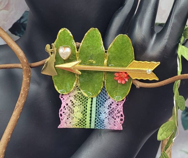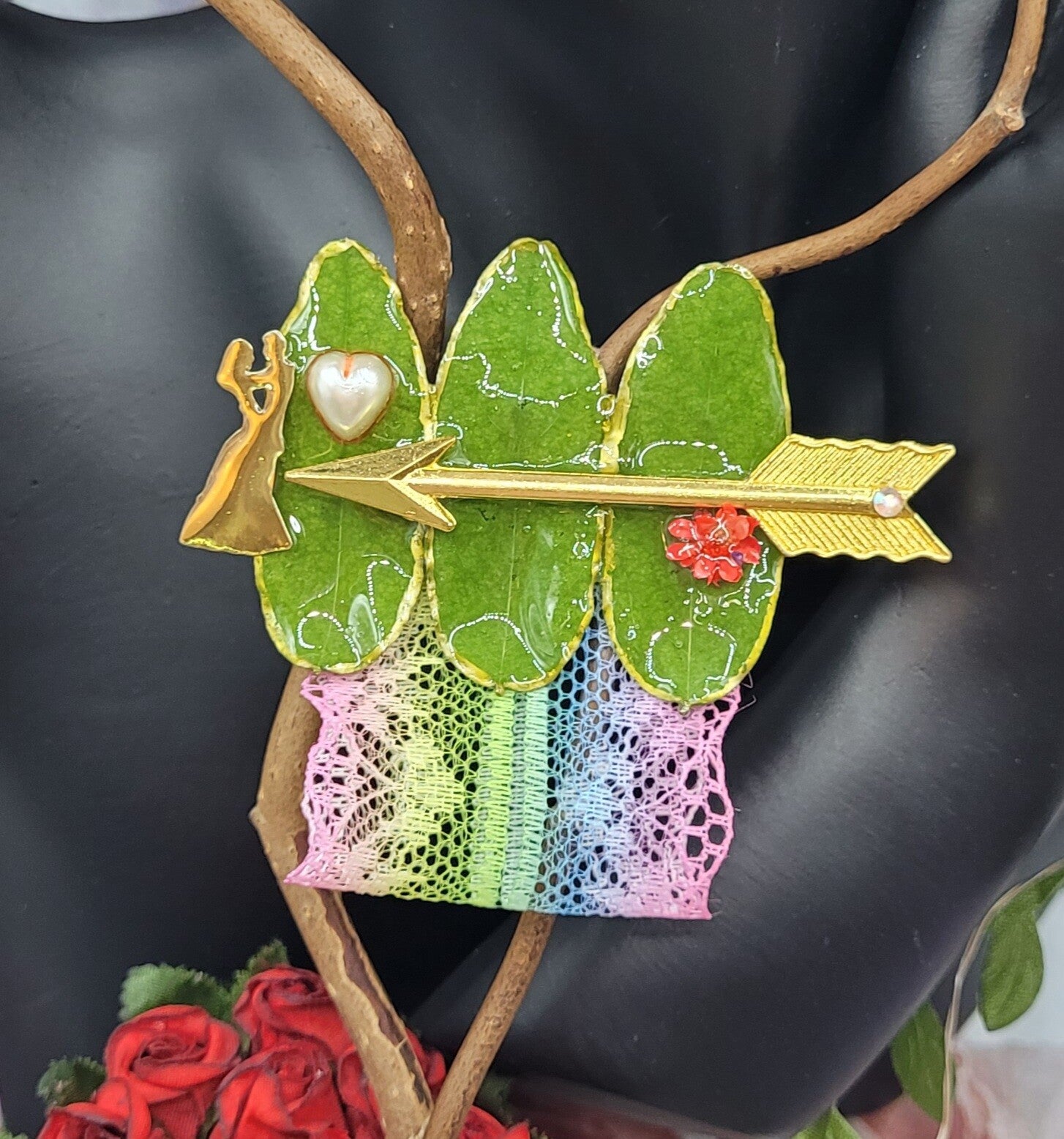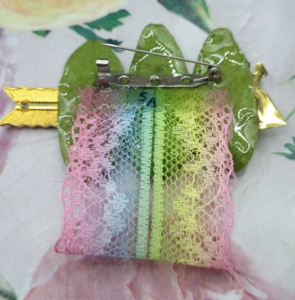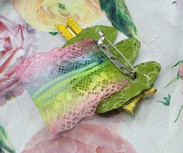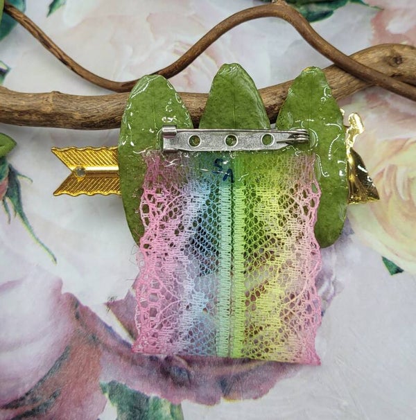 Un beau ruban en dentelle et aux couleurs de l'arc en ciel agrémentent cette broche , qui est placé sur le bas des feuilles