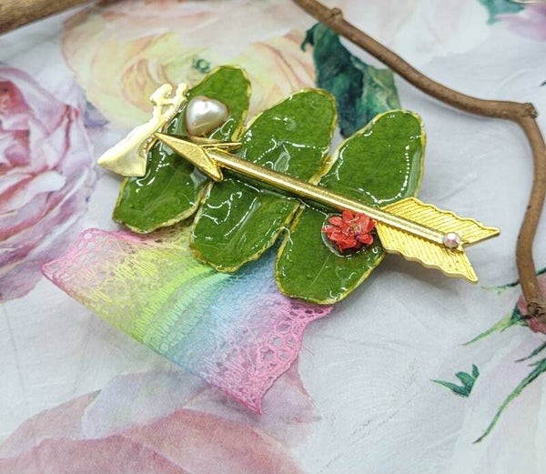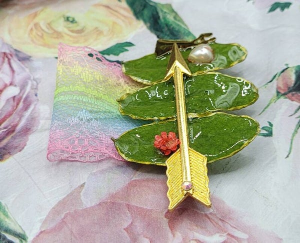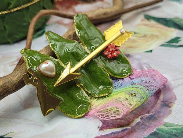 Broche composée de 3 feuilles de couleur verte , aux contours tracés en doré