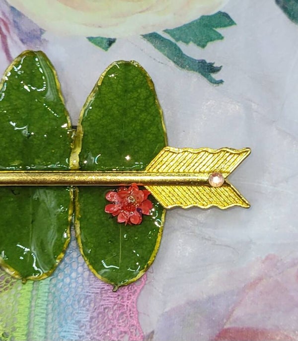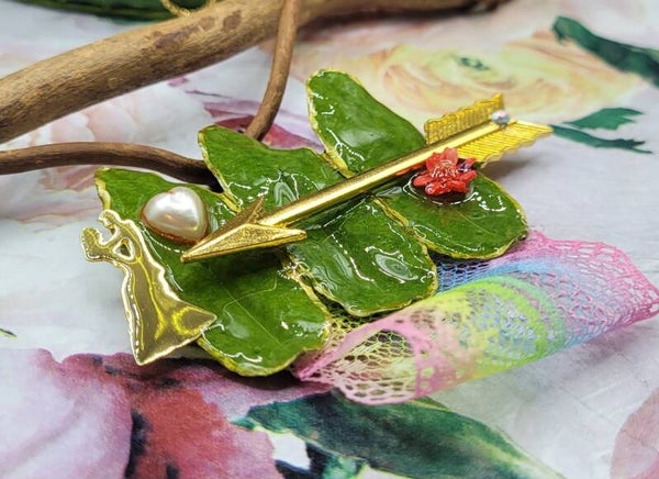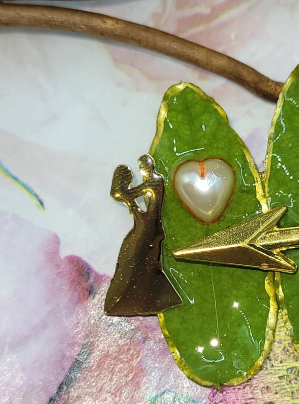 Un bel apprêt doré représentant une flêche est ajouté au dessus des feuilles , pointant sur un sequin doré en forme de personnes , un couple .