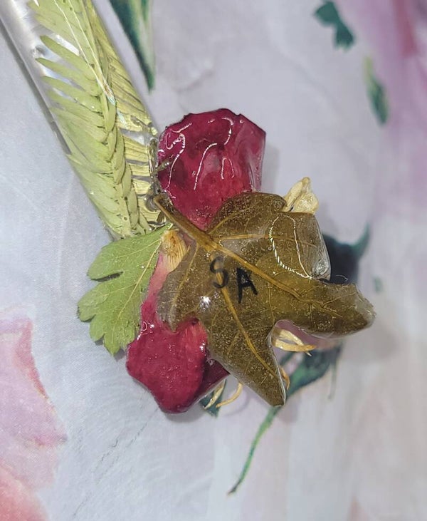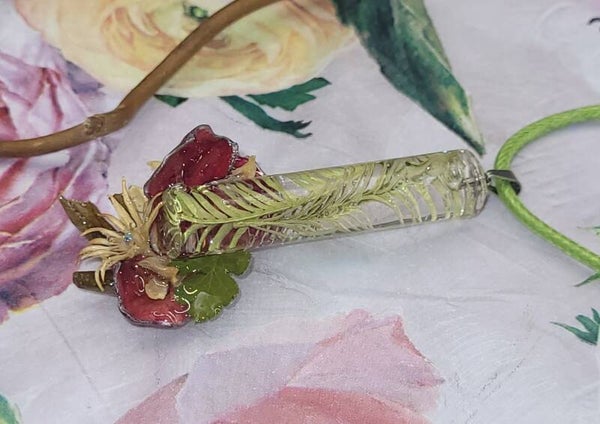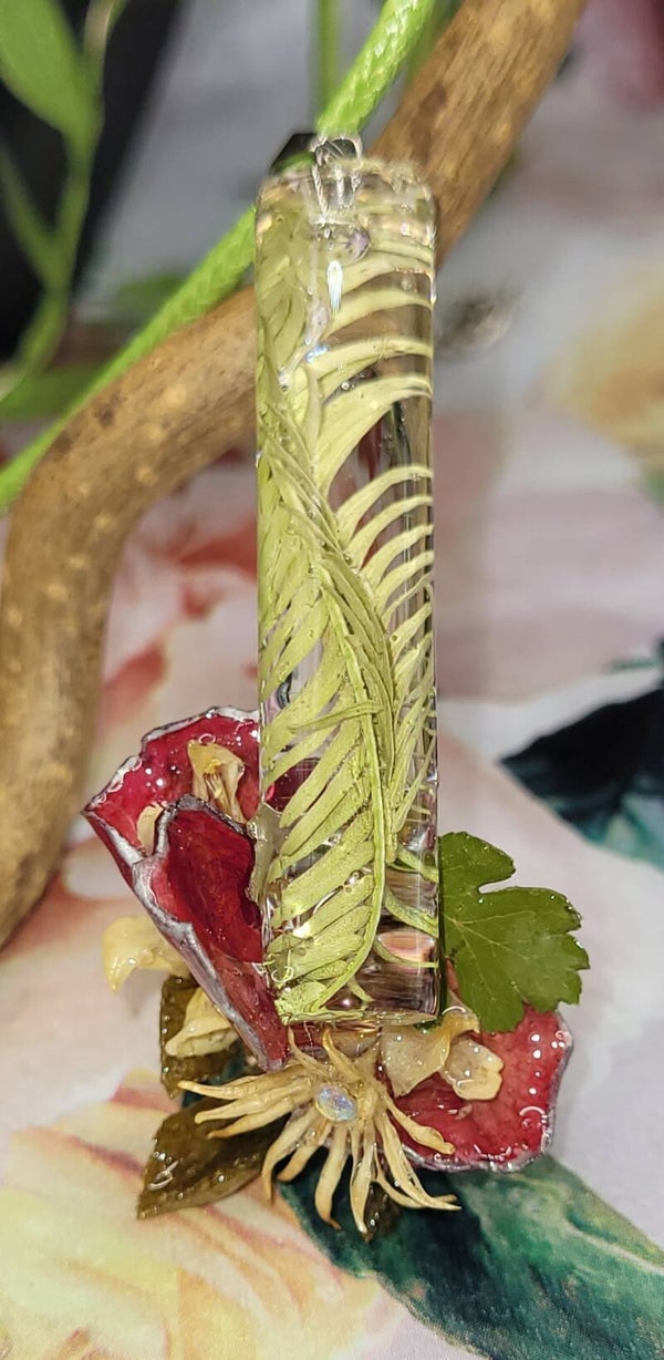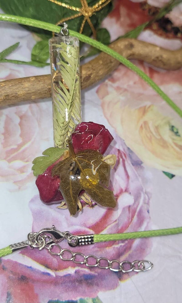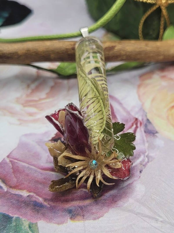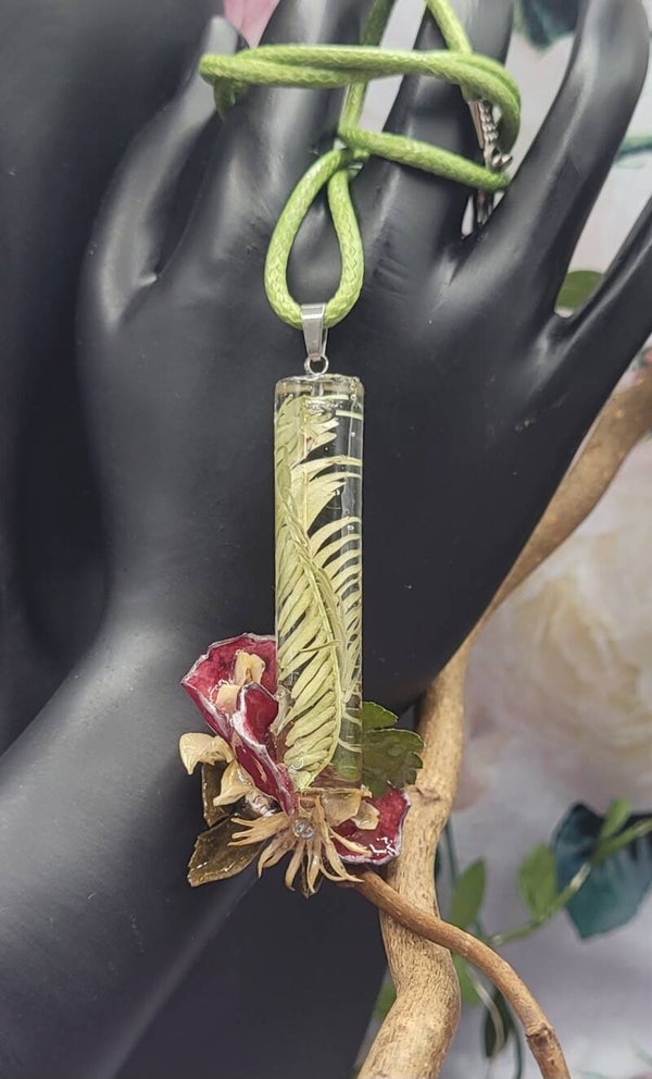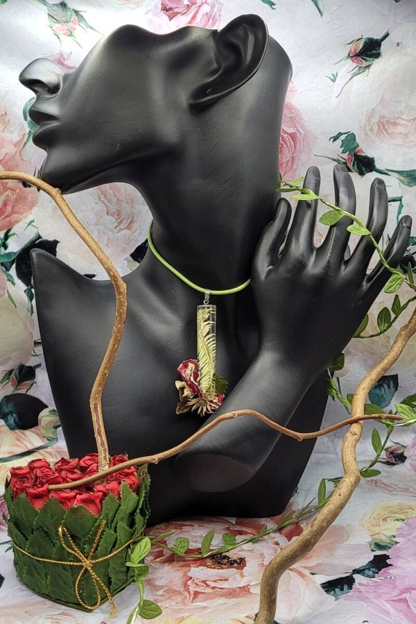 Collier composé d'un cylindre de résine rempli de feuilles vertes