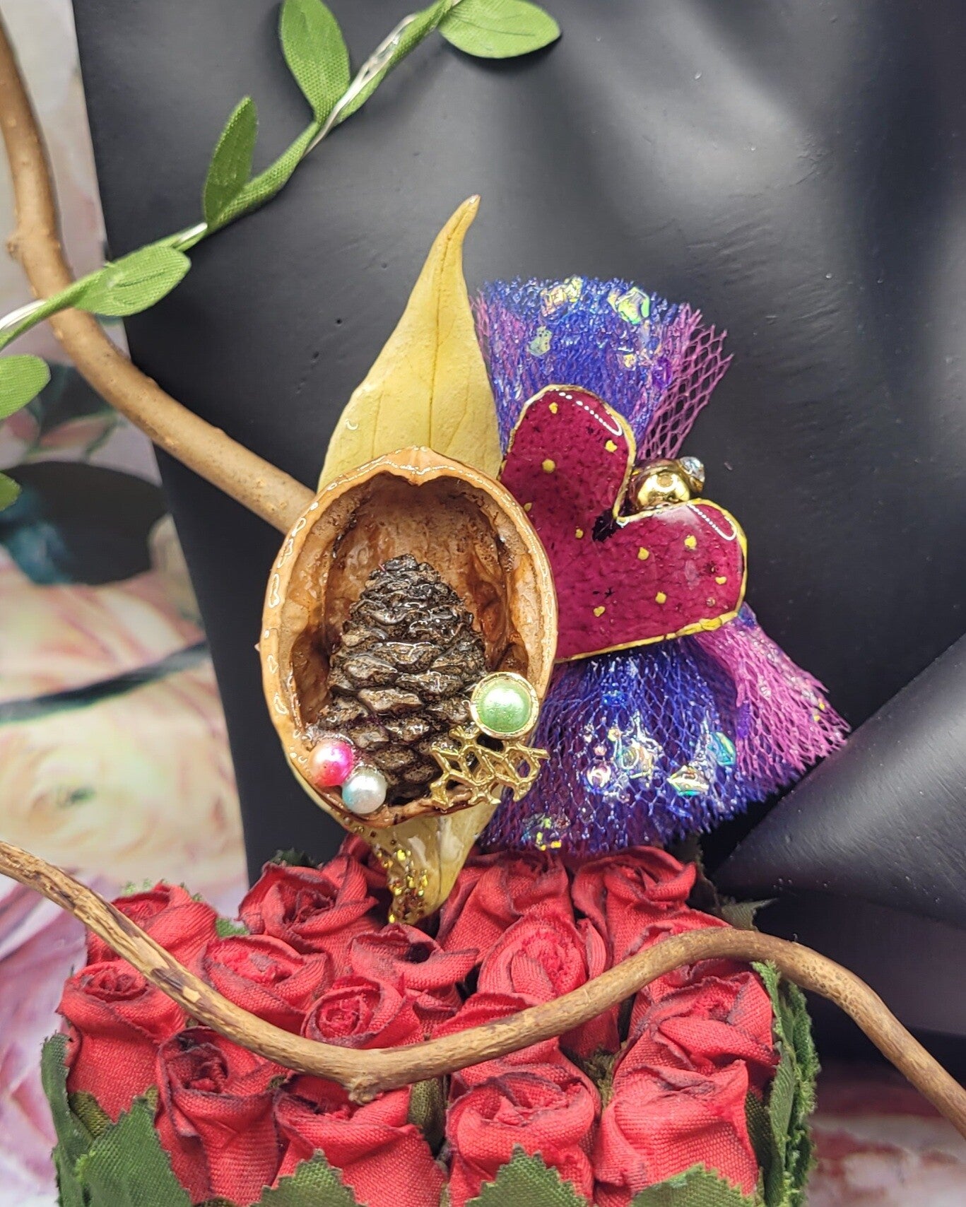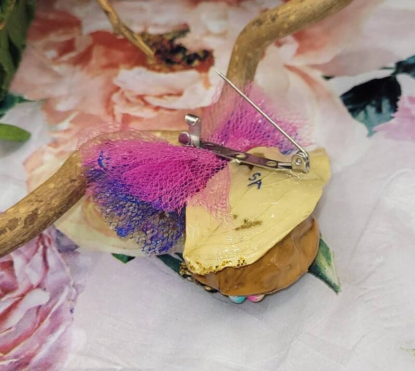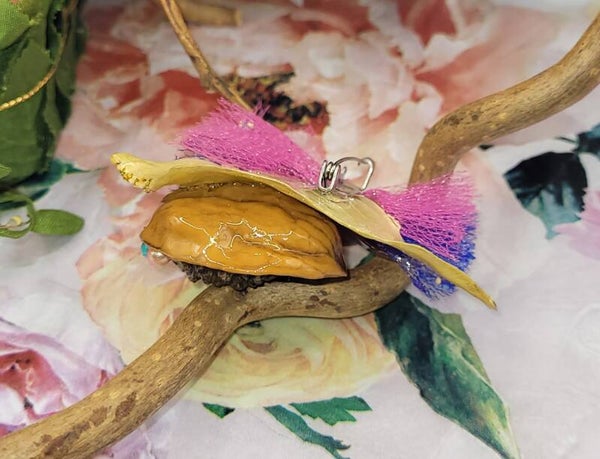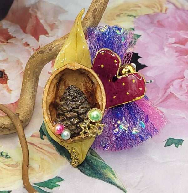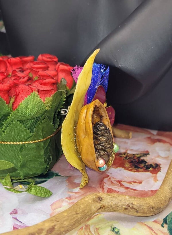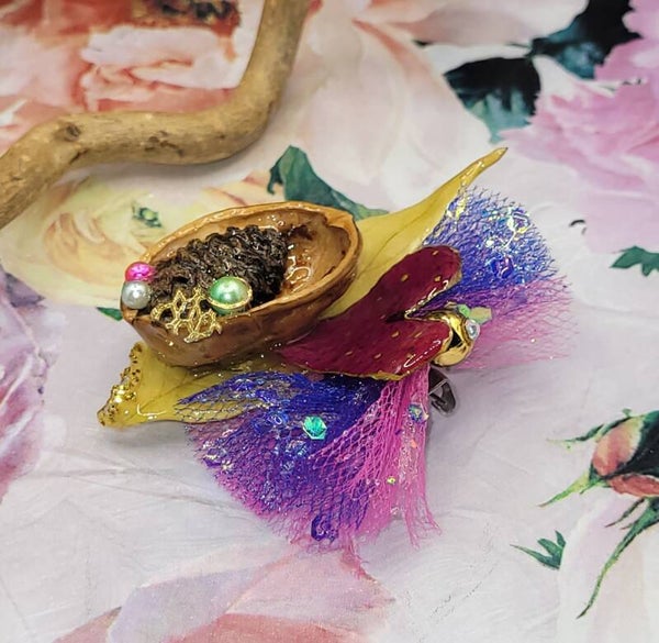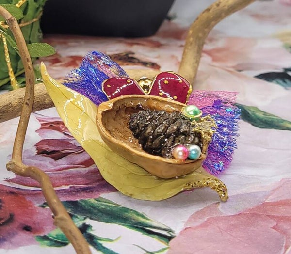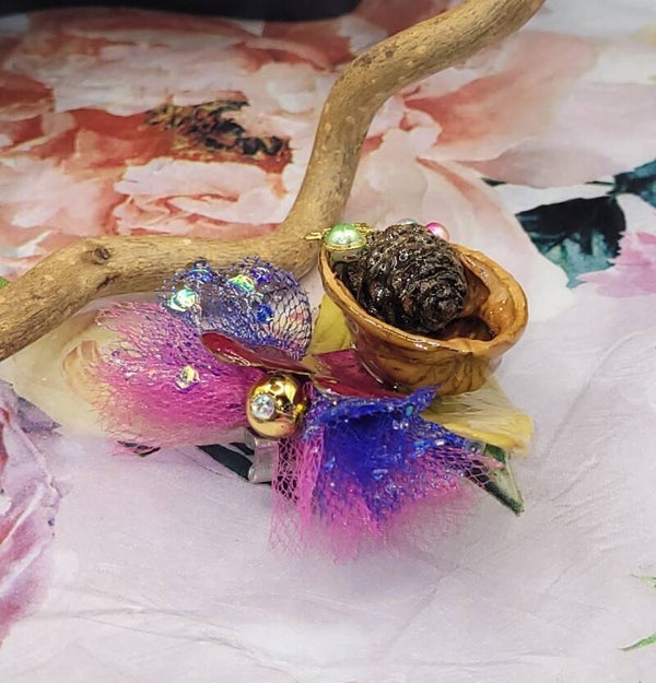 Broche composée d"une coque de noix évidée , dans laquelle une petite pomme de pin a été placée au coeur , accompagnée de perles de différentes couleurs et autres décorations dorés