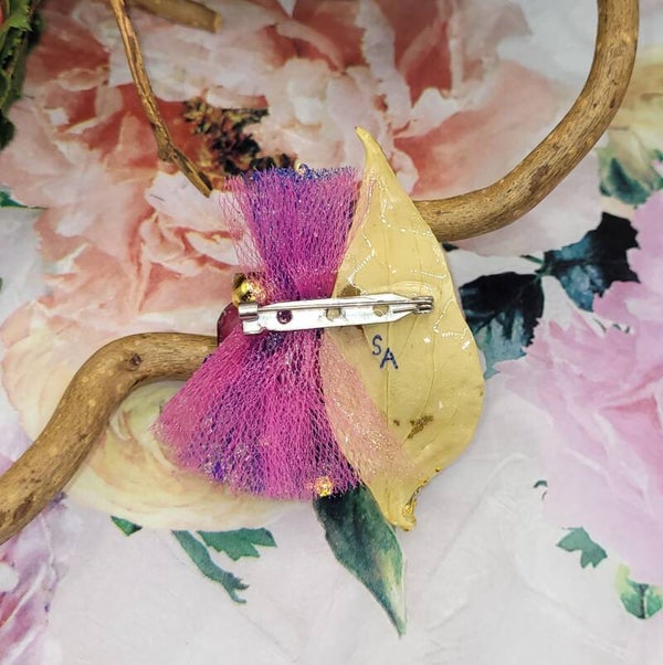 La noix repose sur une feuille de couleur jaune aux nervures bien apparentes , la pointe est pailletée en doré
