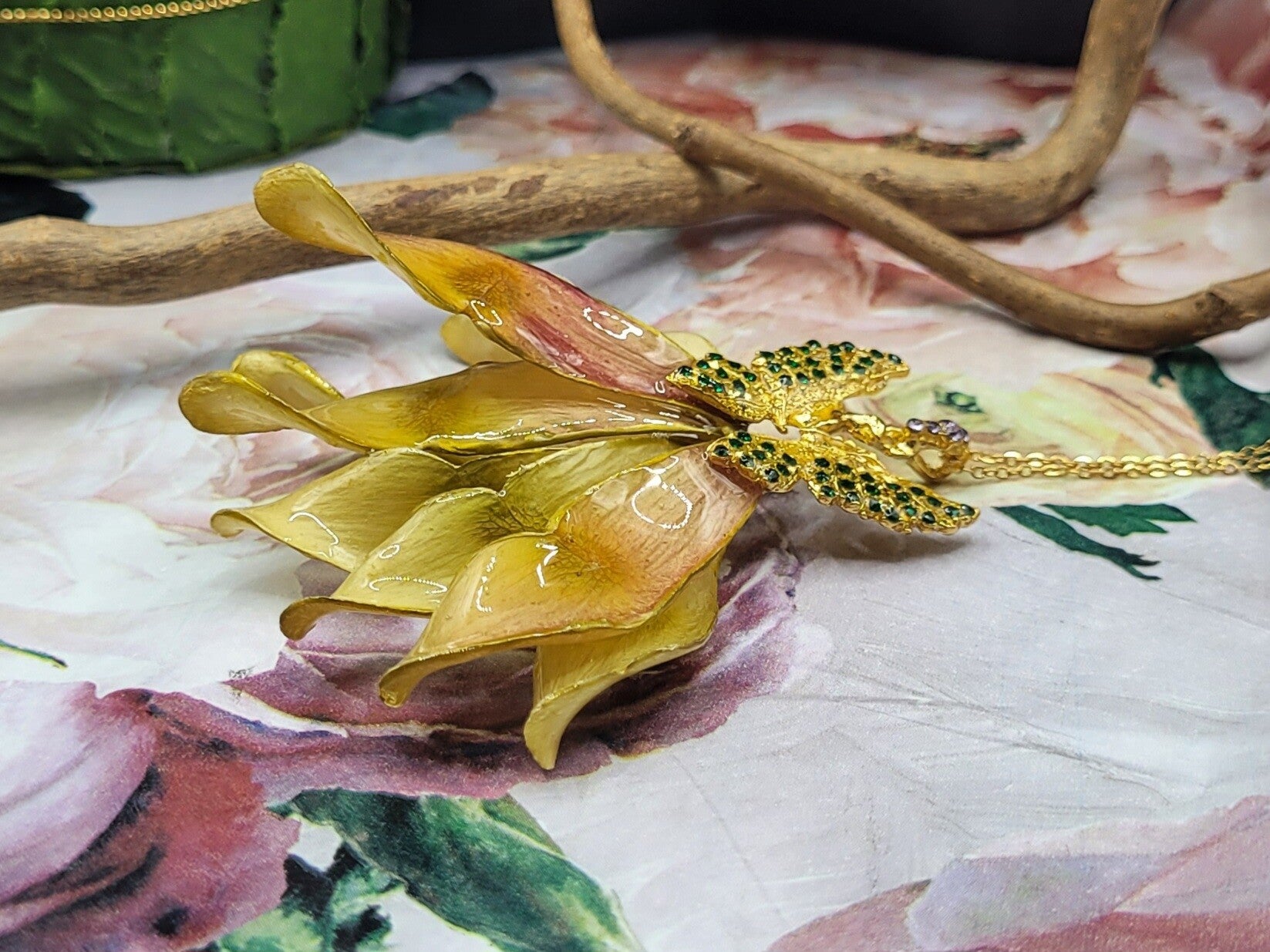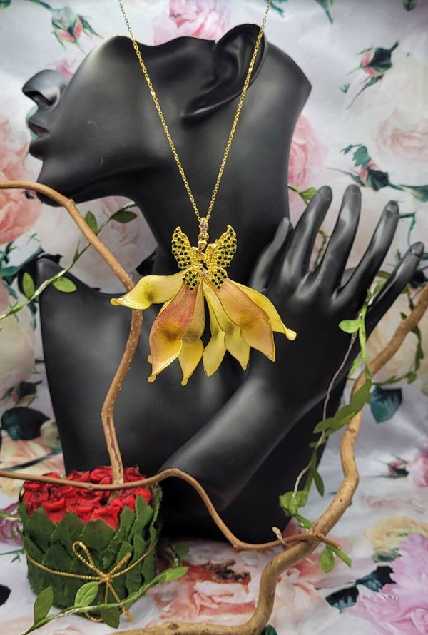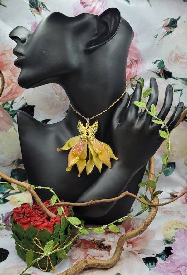 7,5 cm de haut sur 8 cm de large pour la totalité du pendentif (papillon + feuilles)