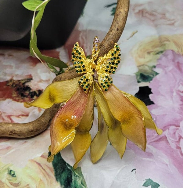 Ce joli papillon est posé sur plusieurs feuilles provenant de l'ailante glanduleux , qui varient entre le vert clair et le rouge . Les contours sont tracés en doré . Ces feuilles sont issus d'un assemblage de ma part , 8 au total