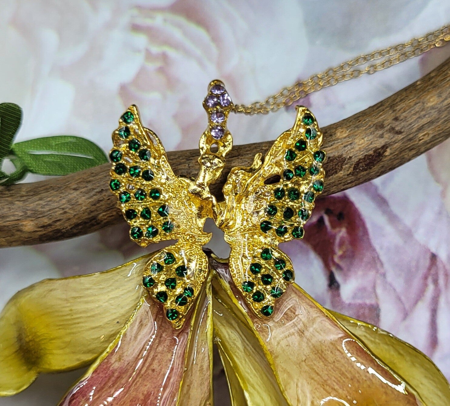 Collier composé d'un joli apprêt en forme de papillon doré , un homme et une femme sont représentés au coeur de ce pendentif . Les ailes sont remplis de strass vert emmeraude et la bélière contient des strass violet