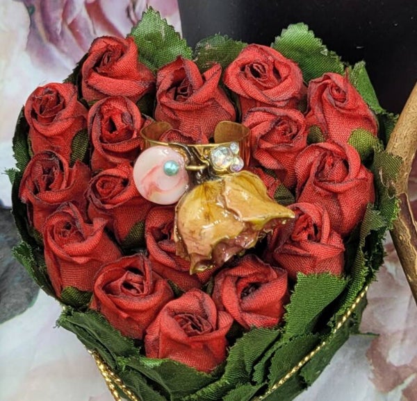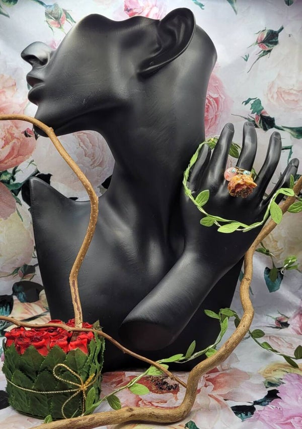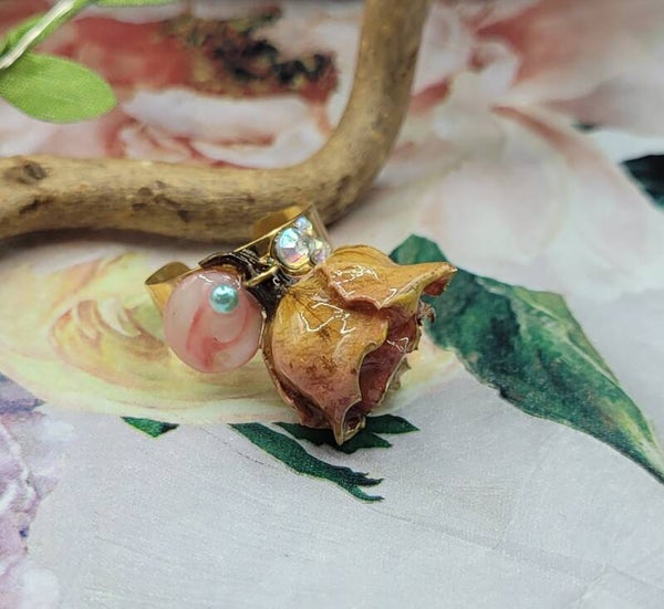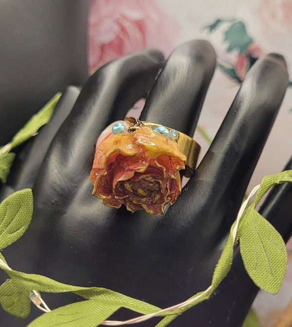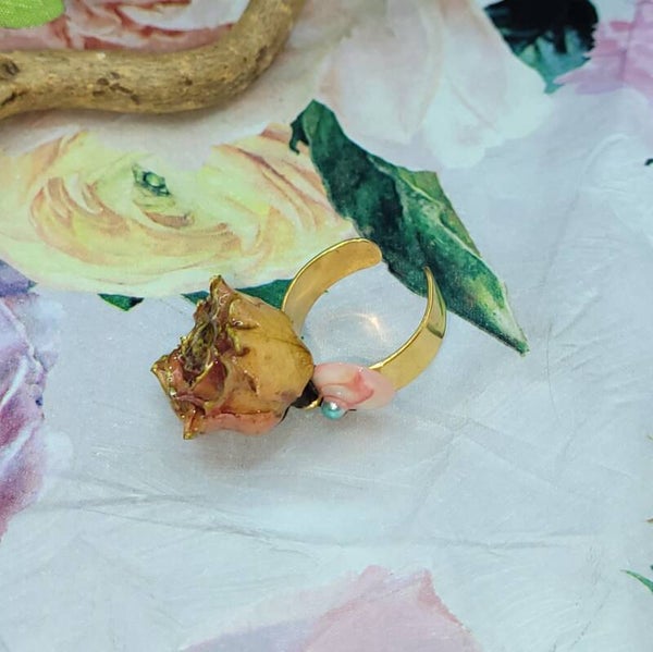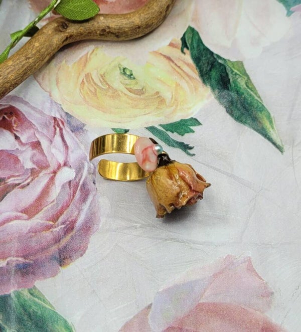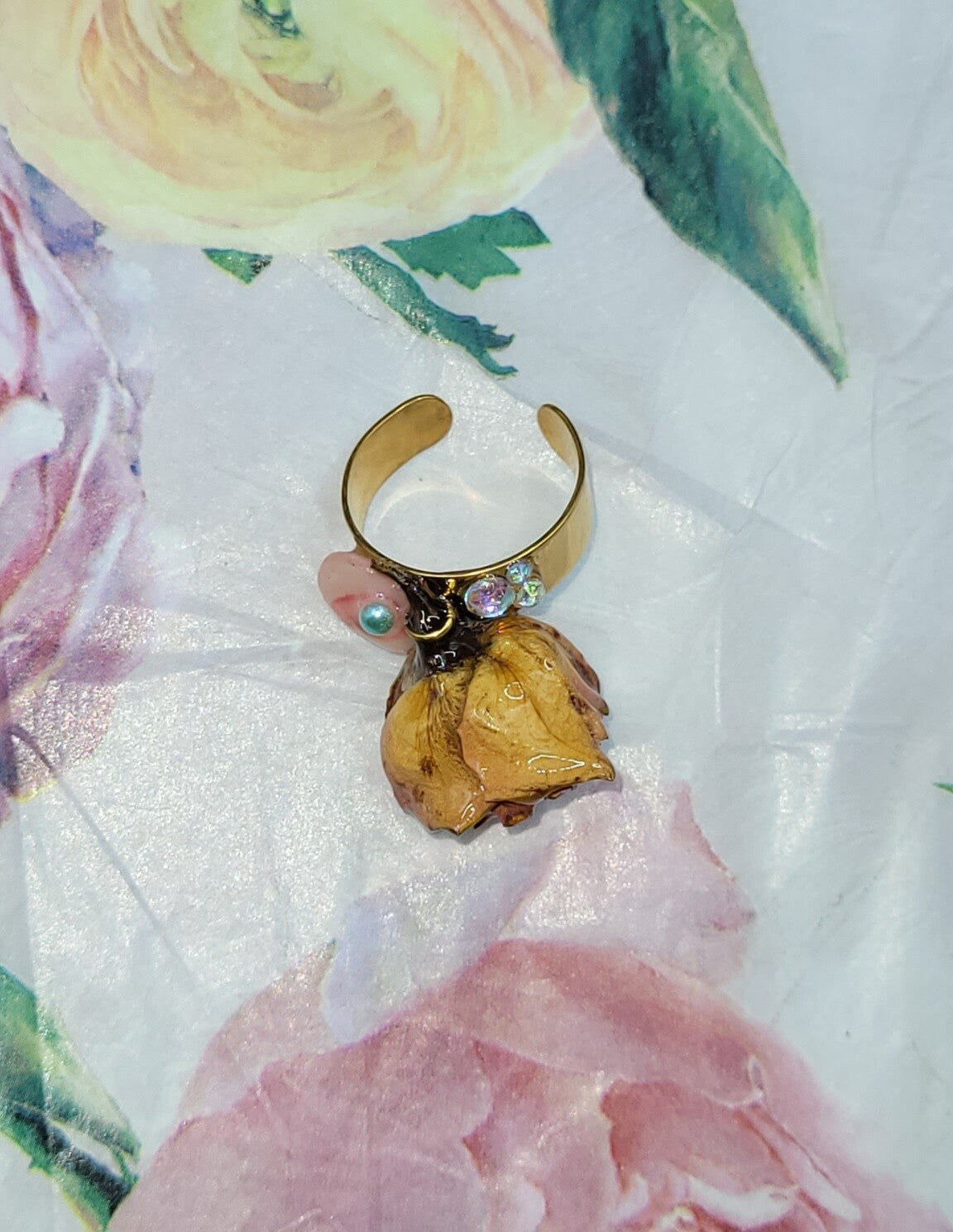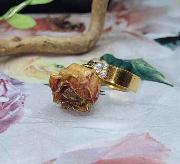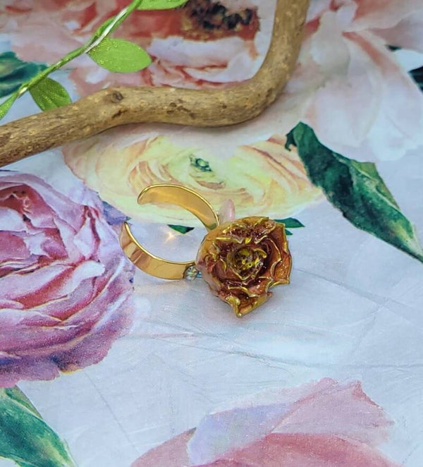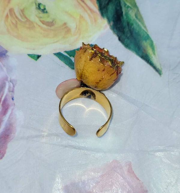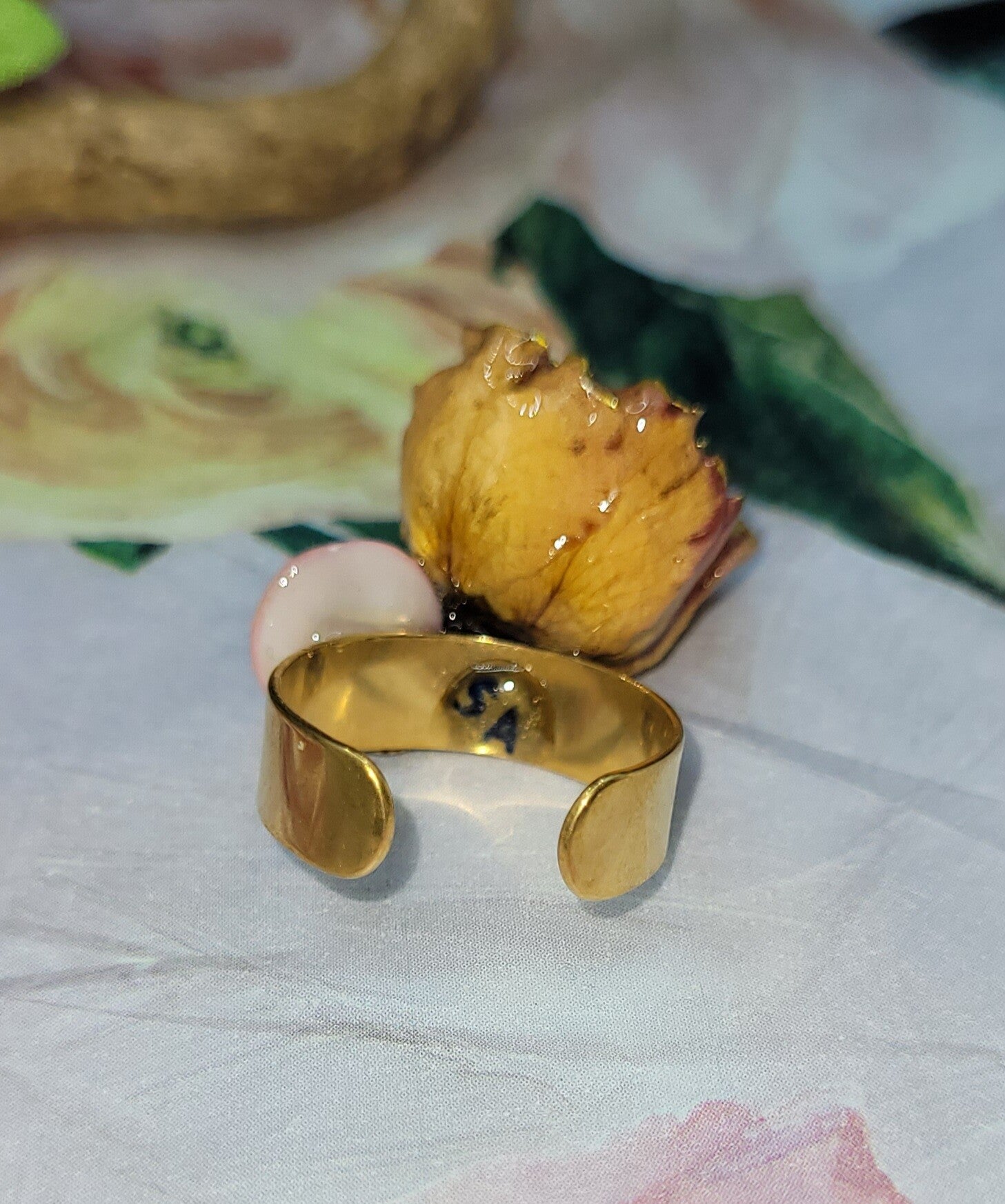 Le tout est scellé dans la résine et monté sur bague ouverte en acier inoxydable doré