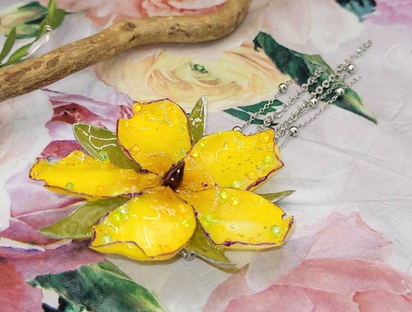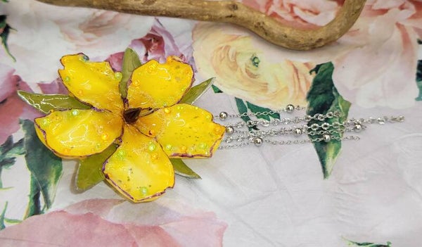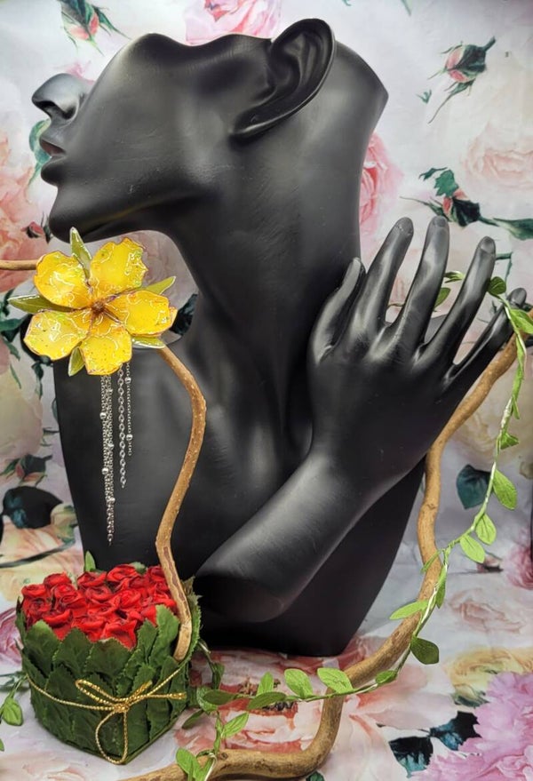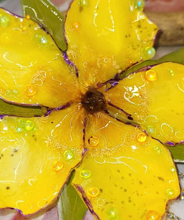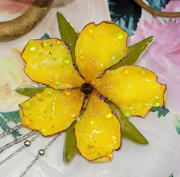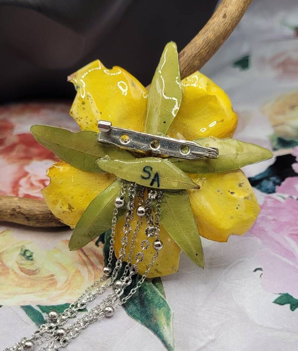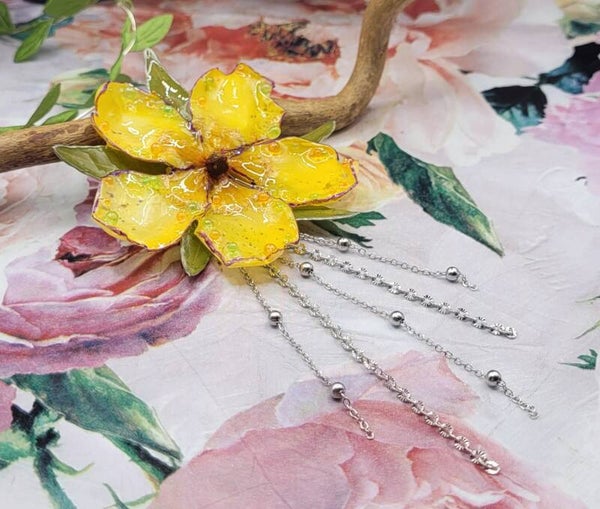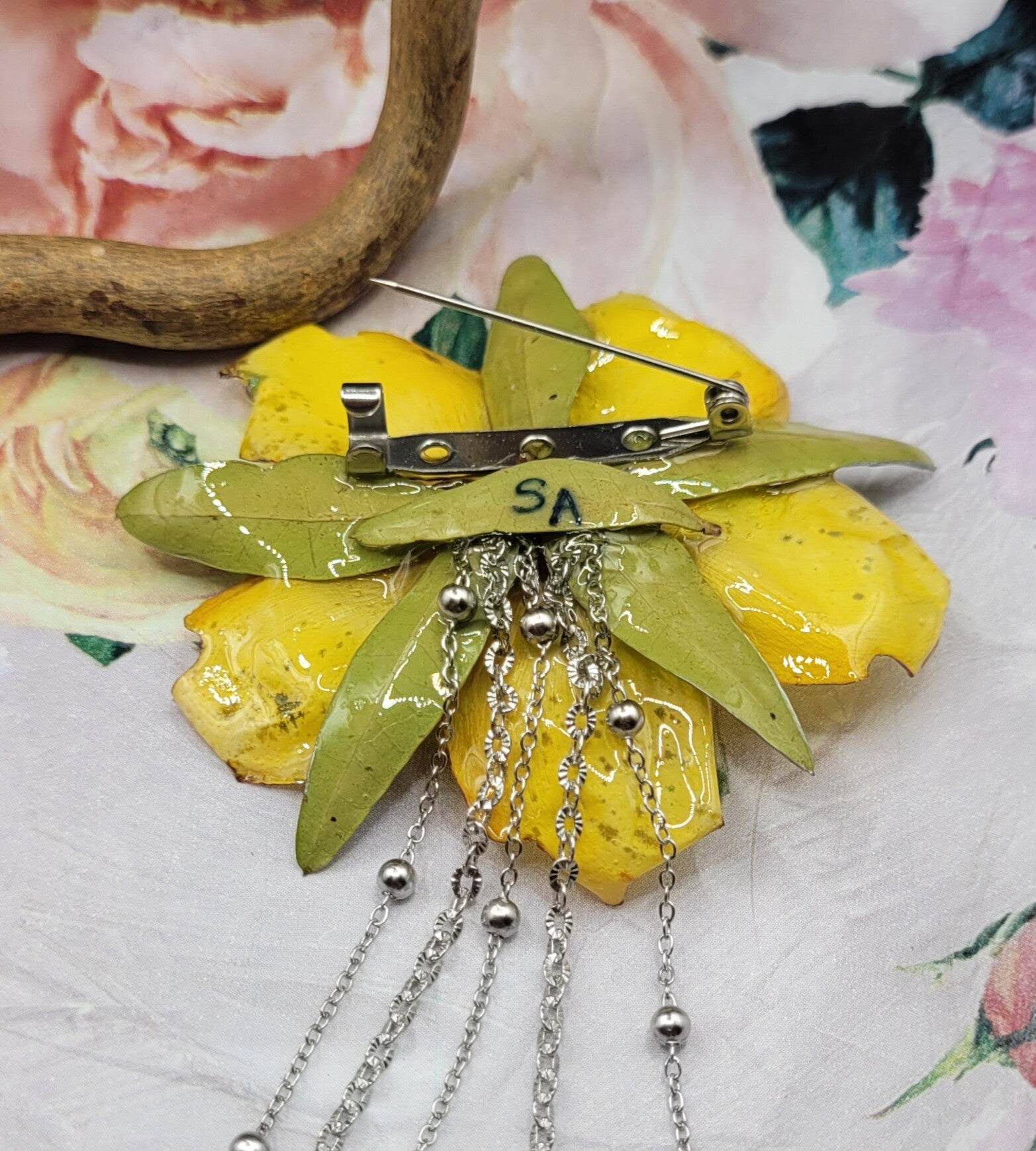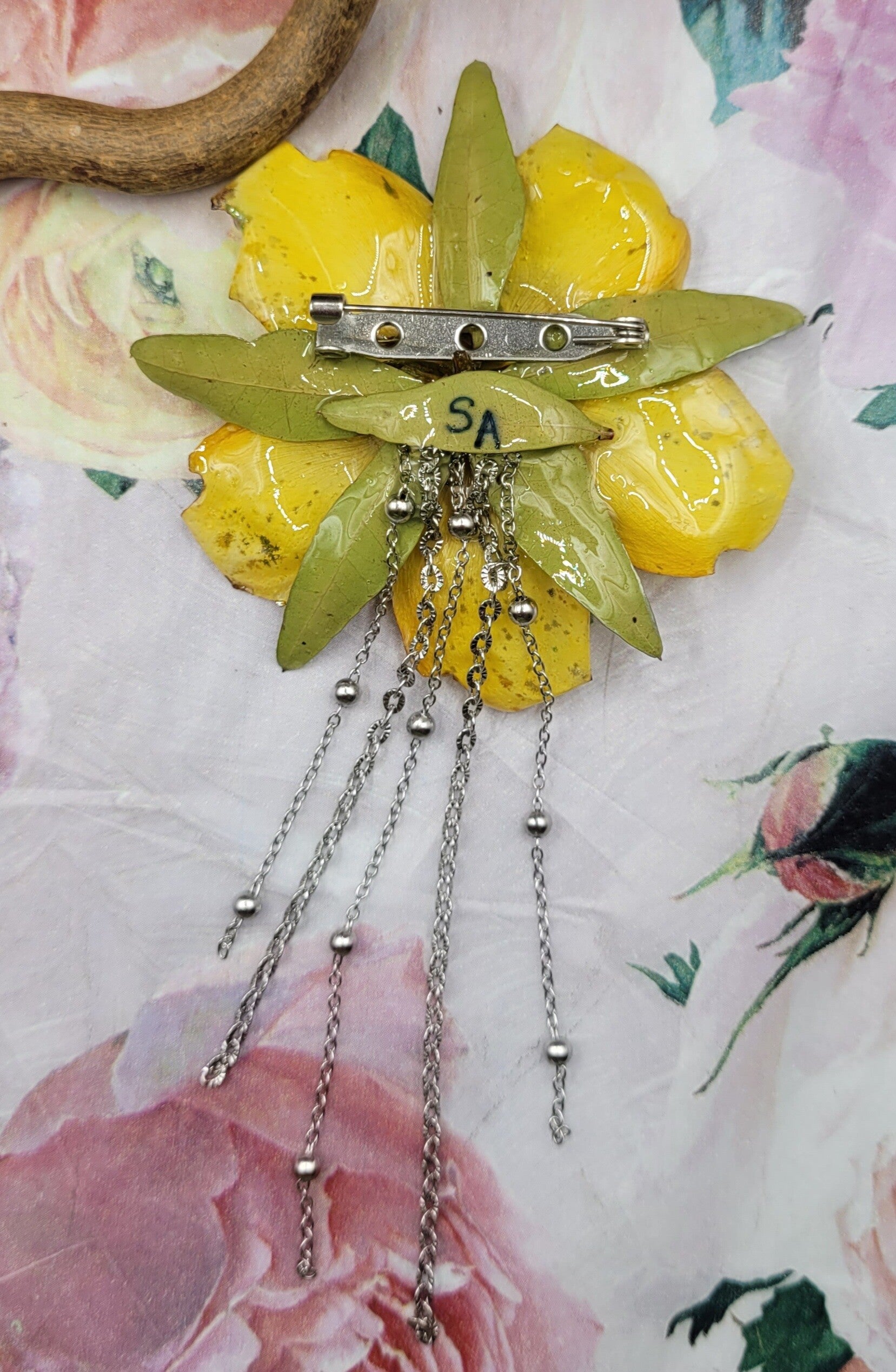Broche composée d'une belle et grande fleur de couleur jaune . Des billes d'eau oranges et verts sont parsemées sur les pétales .