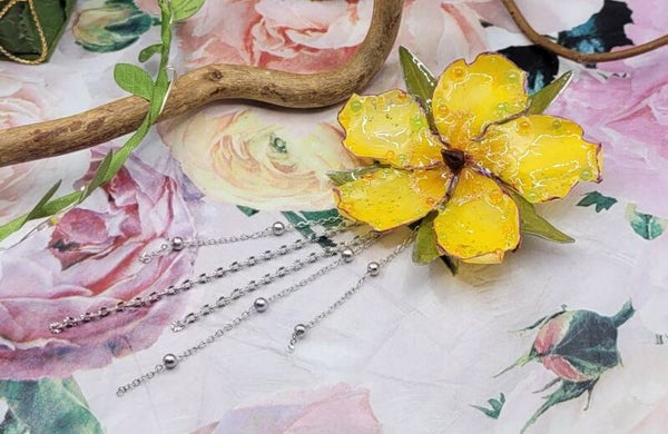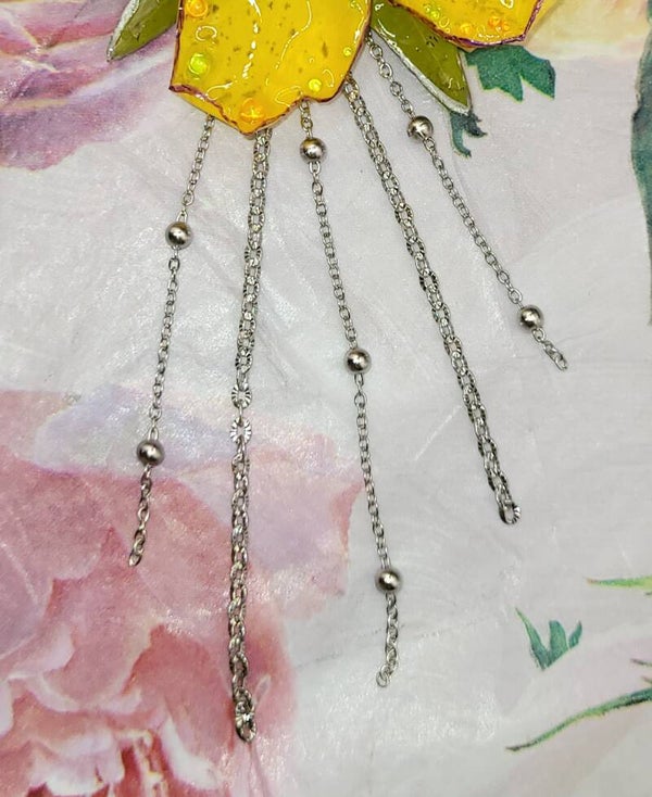 2 modèles différents de chaînettes sont placées en pampille sur le bas de la fleur : L'une est en maille boule , l'autre est en maille ciselée et brille en suivant vos mouvements . 5 chaînettes au total