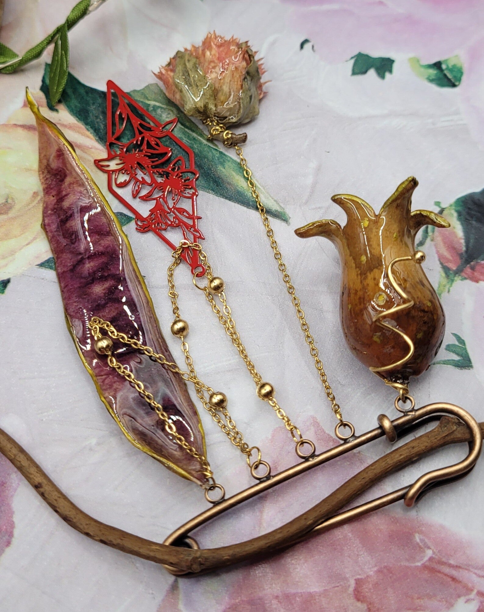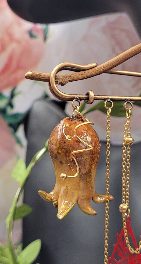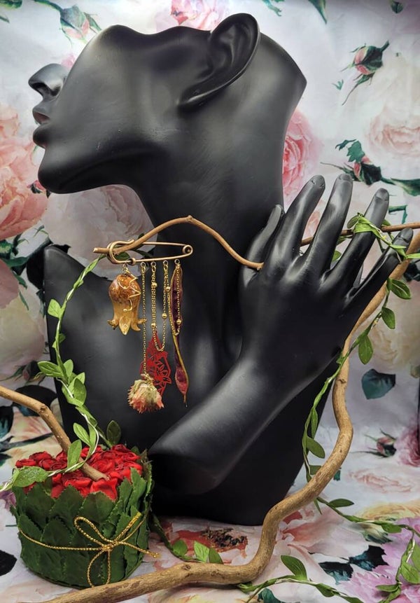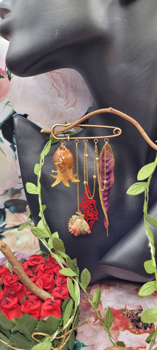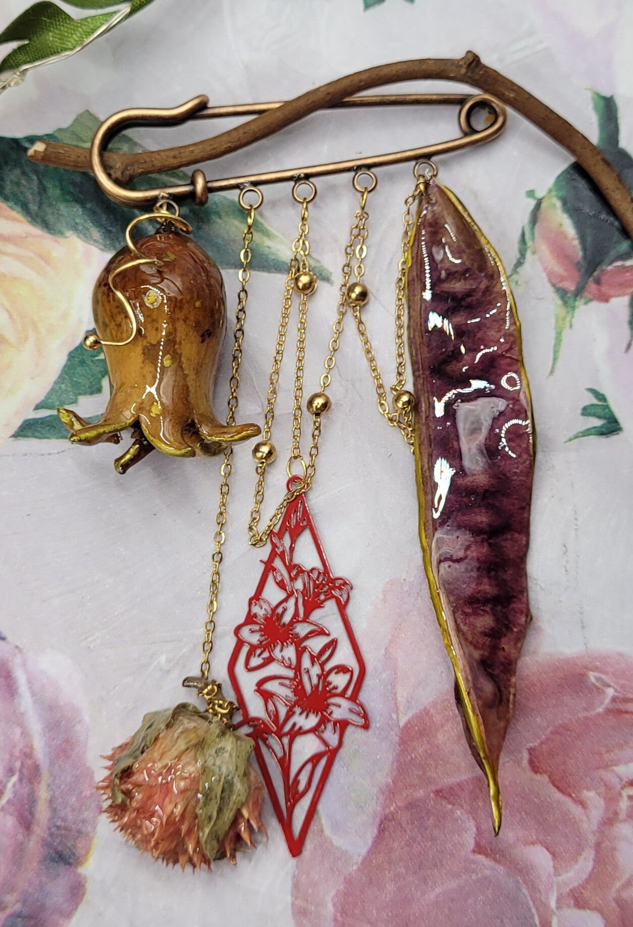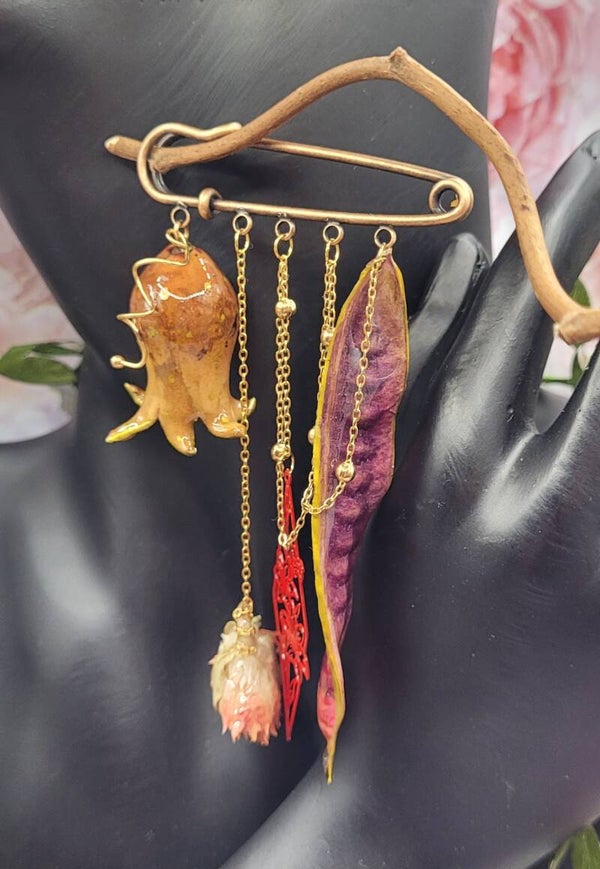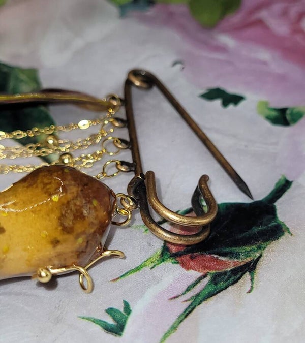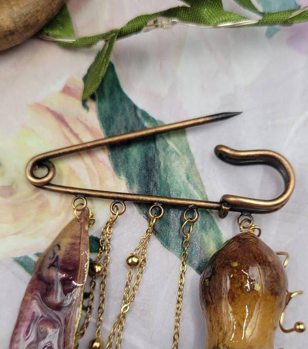 Le tout est est scellé dans la résine et monté sur broche style épingle à nourrice couleur bronze veilli en acier inoxydable