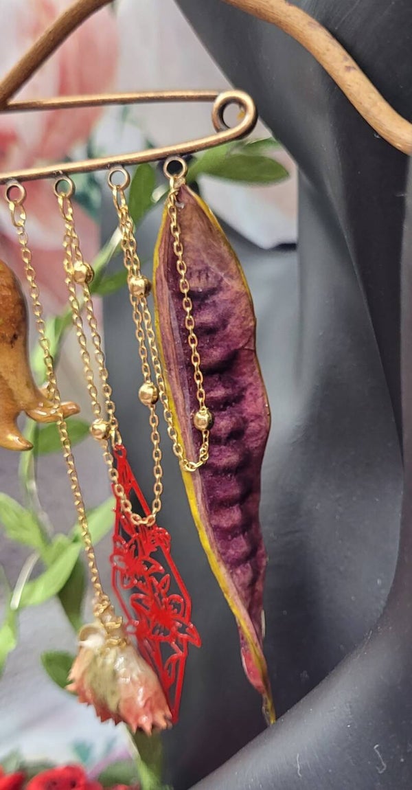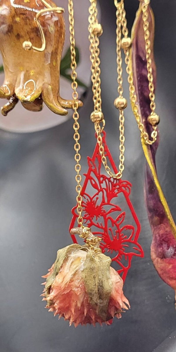 - Des chaînettes dorées en maille boule sont placées avec une décoration en bout . Un losange en métal rouge dans lequel se trouve des fleurs sur fond ajouré .