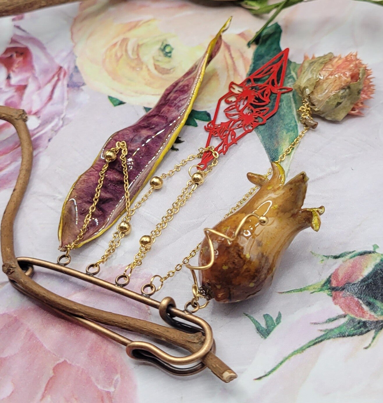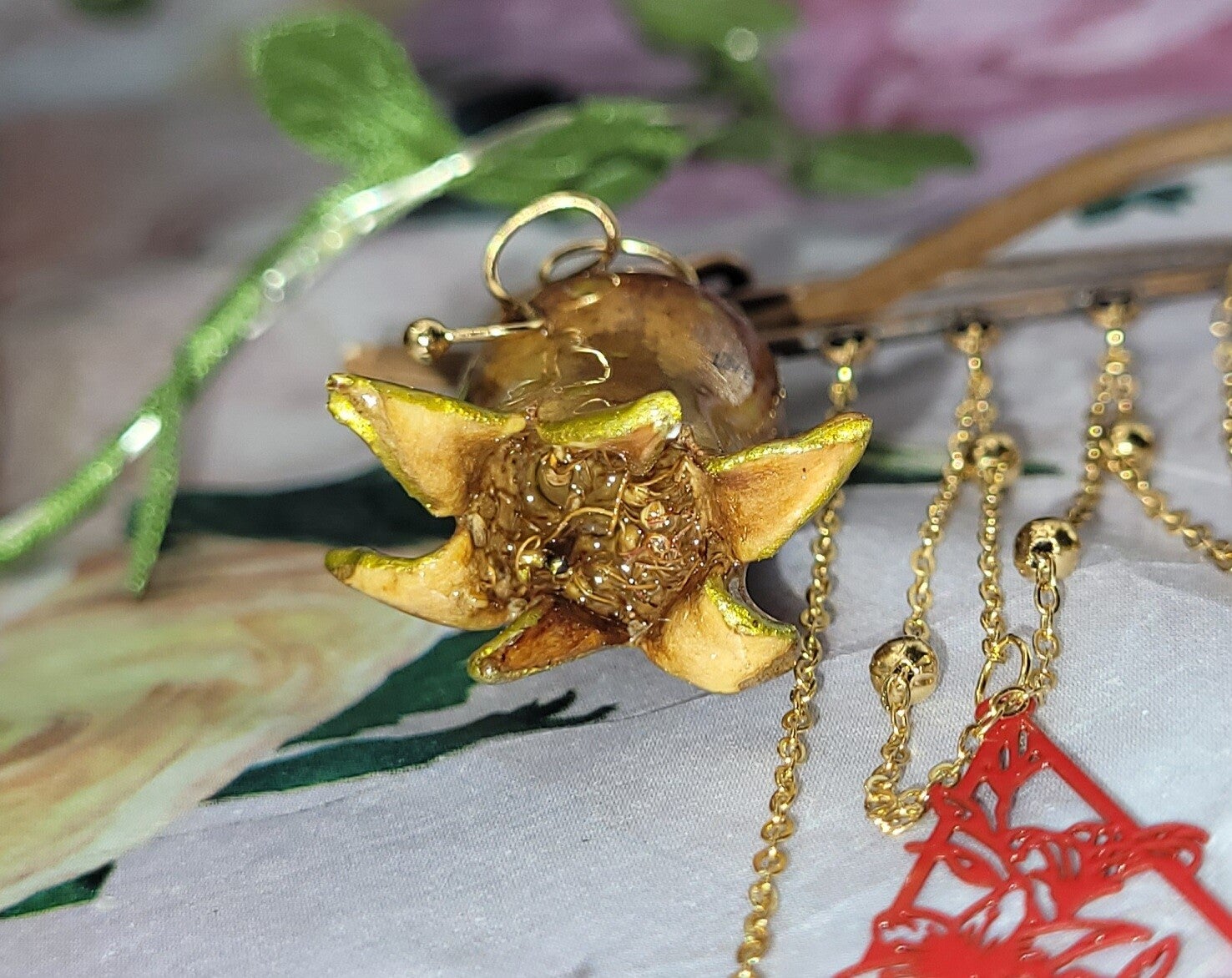 - Une fleur de grenadier qui ne s'est pas développée , la fleur est restée dans sa coque , les pistilles sont visibles . Des petits pois sont tracés en doré , ainsi que les contours . Une décoration dorée et formée en spirale est ajoutée .