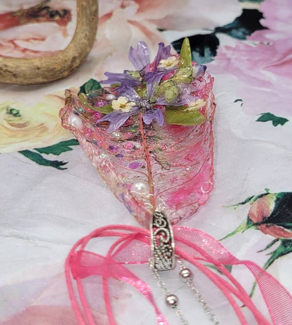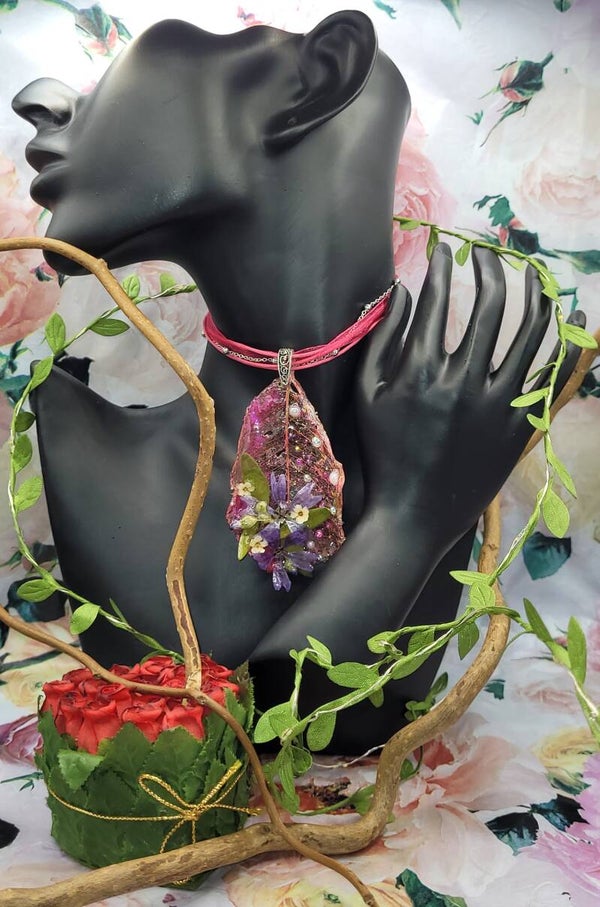 Le tout est scellé dans la résine et monté sur une jolie bélière argentée et collier ruban cordon rose et chaîne en maille boule en acier inoxydable