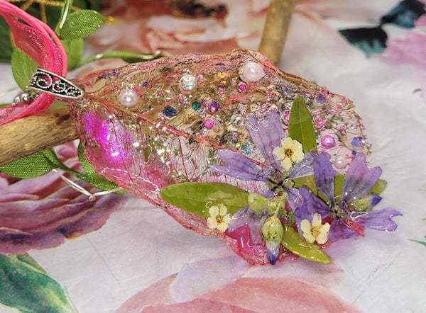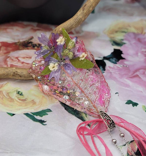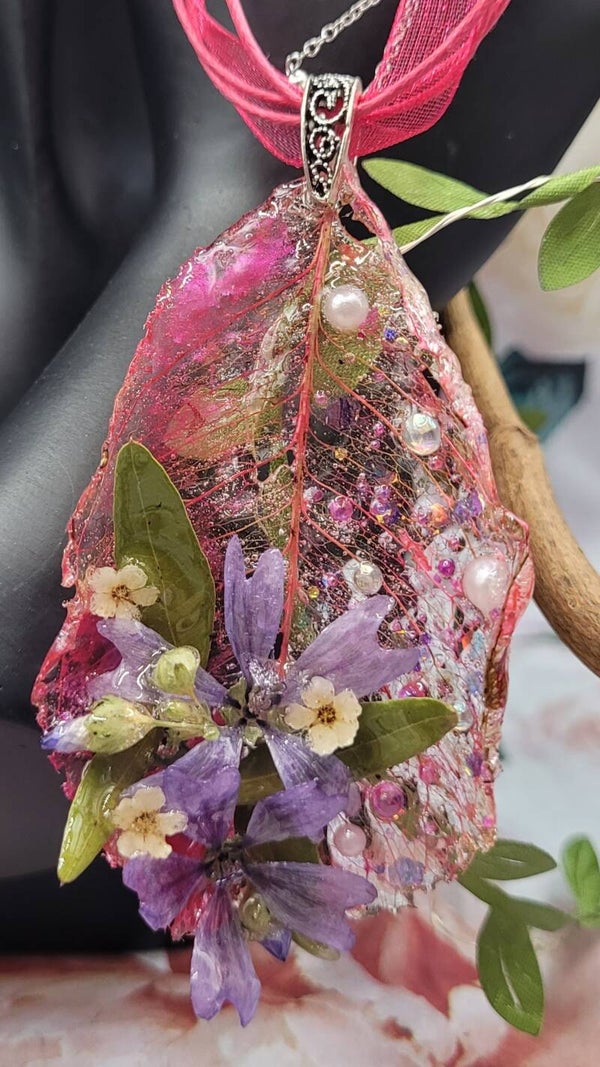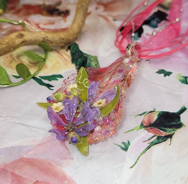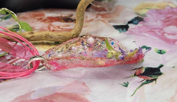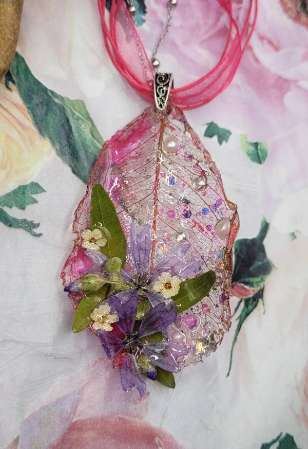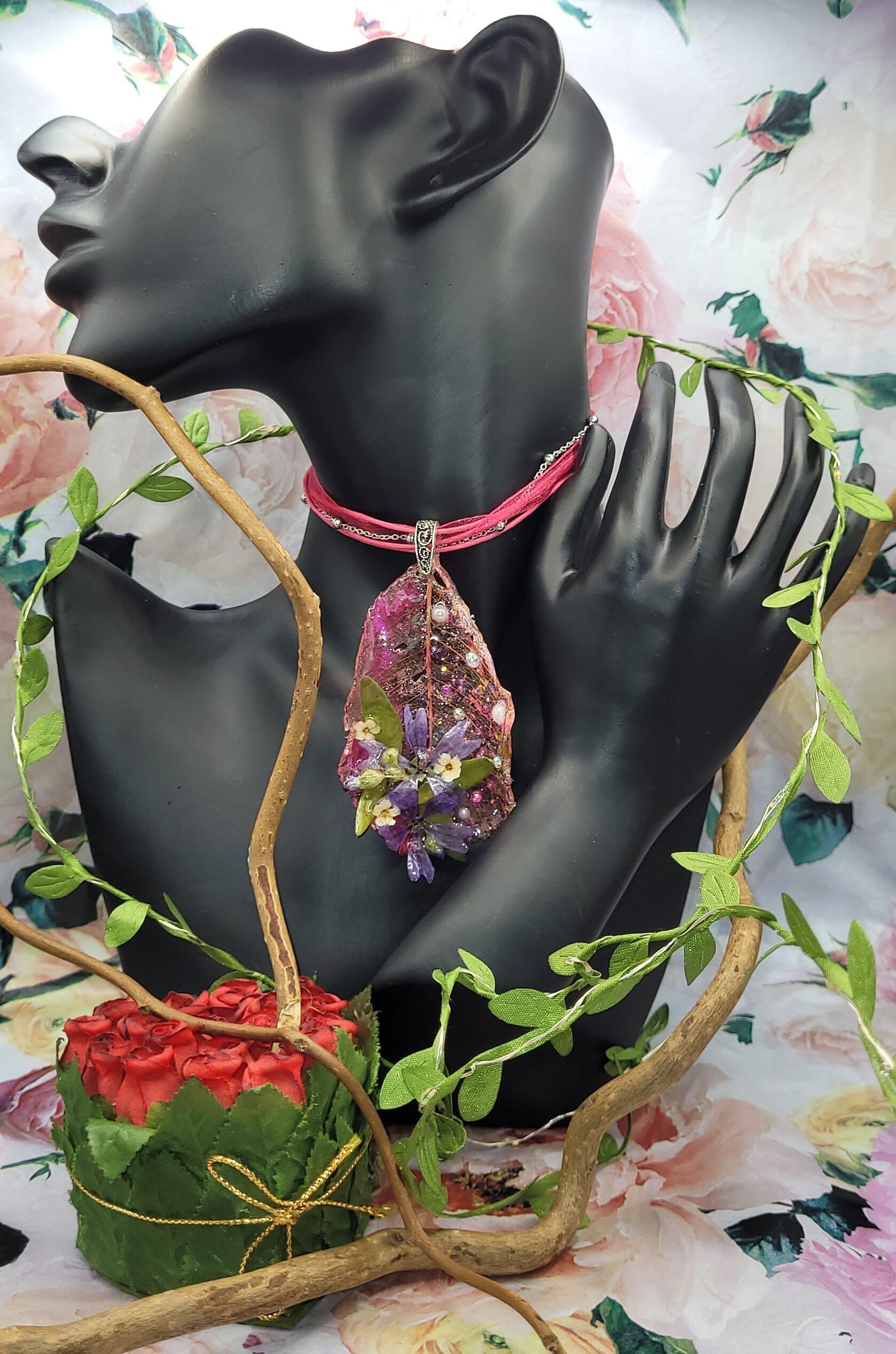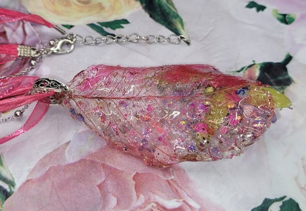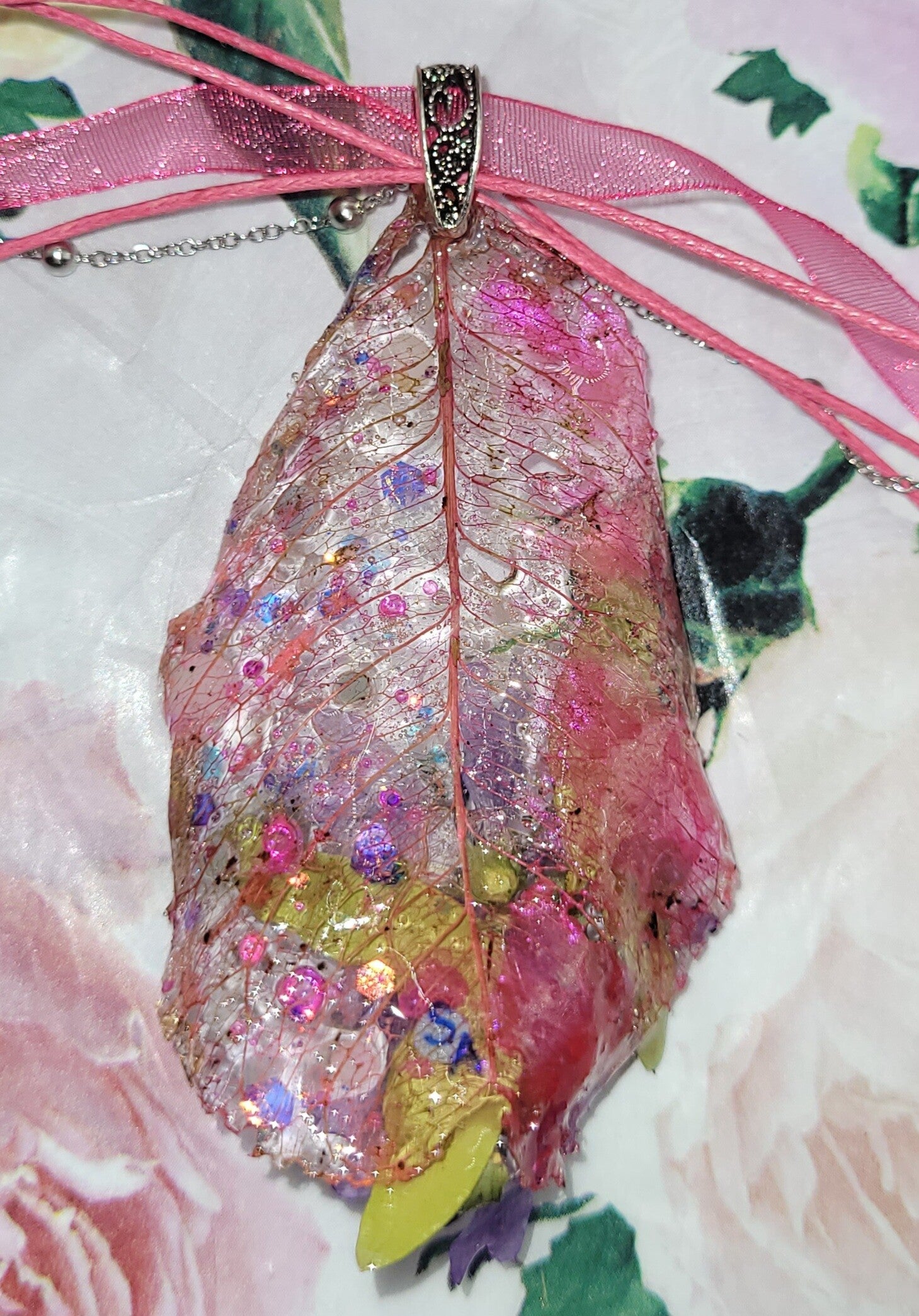 Collier composé d'une feuille en décomposition d'où sa transparence . Les nervures sont apparentes et teintées en rose .
