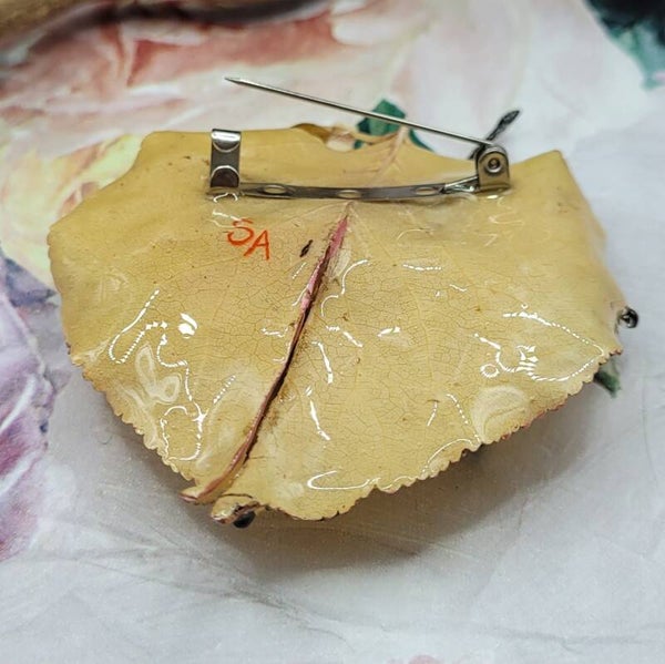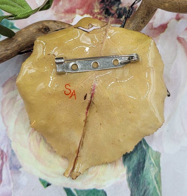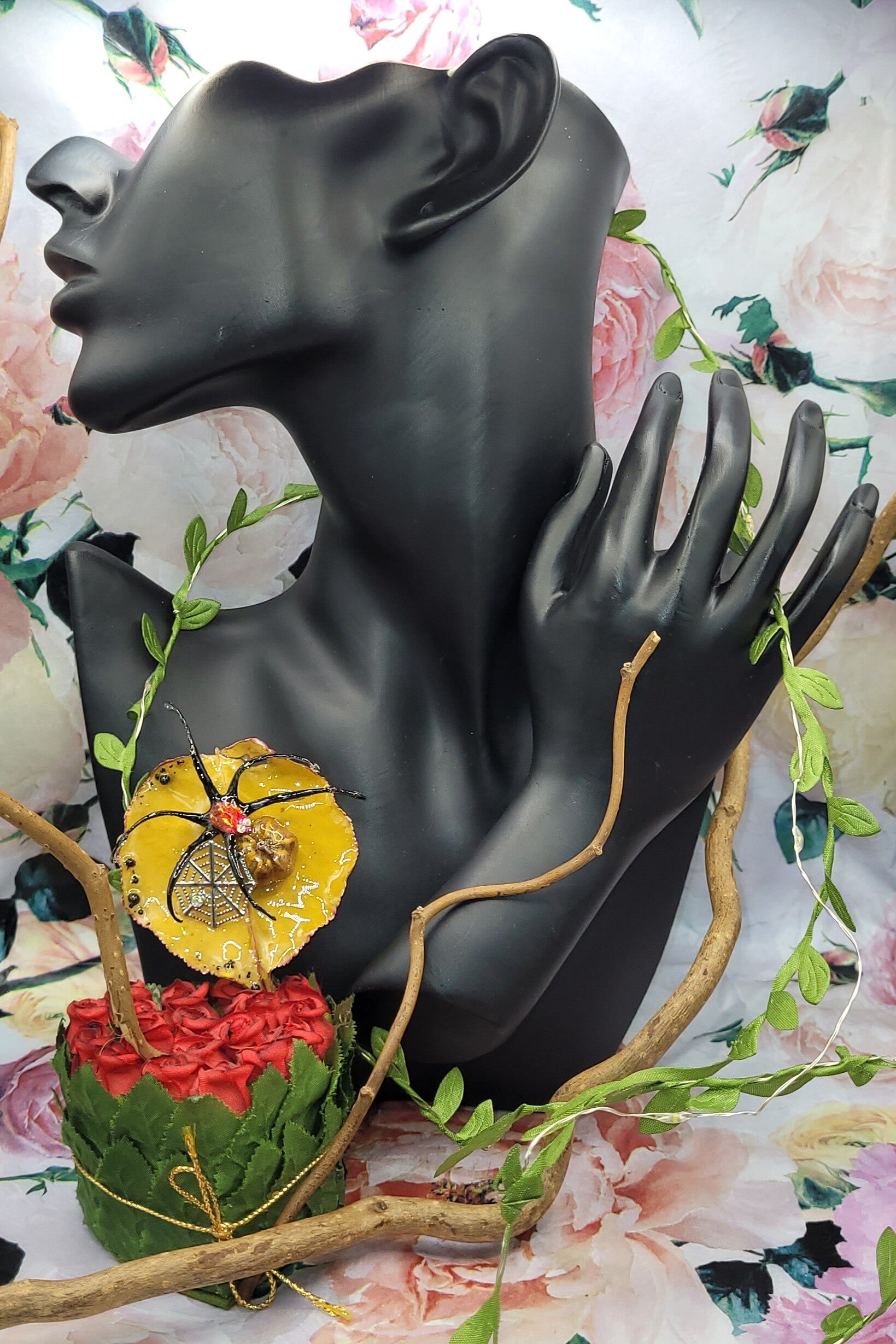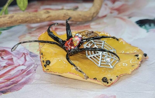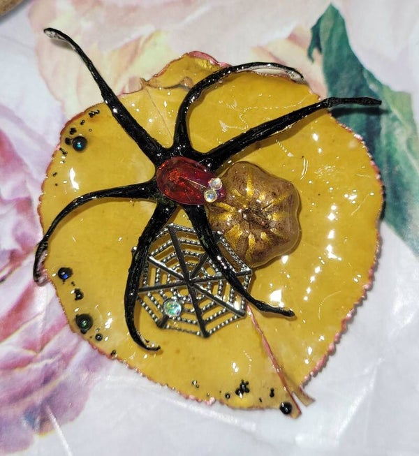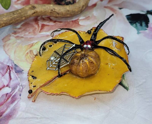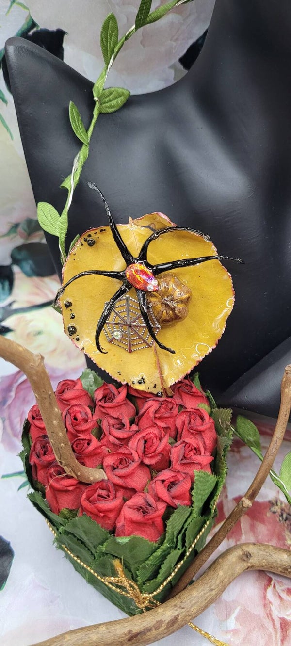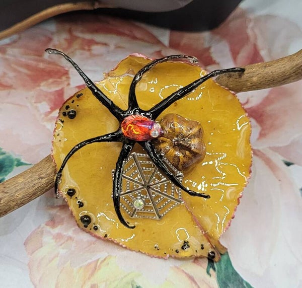 Broche d'Halloween composée d'une jolie araignée faite avec le pédondule d'une tomate . Teintée en noire , strass rouge et blanc ont été apportés pour le corps et les yeux (Promis elle ne mord pas 😉)