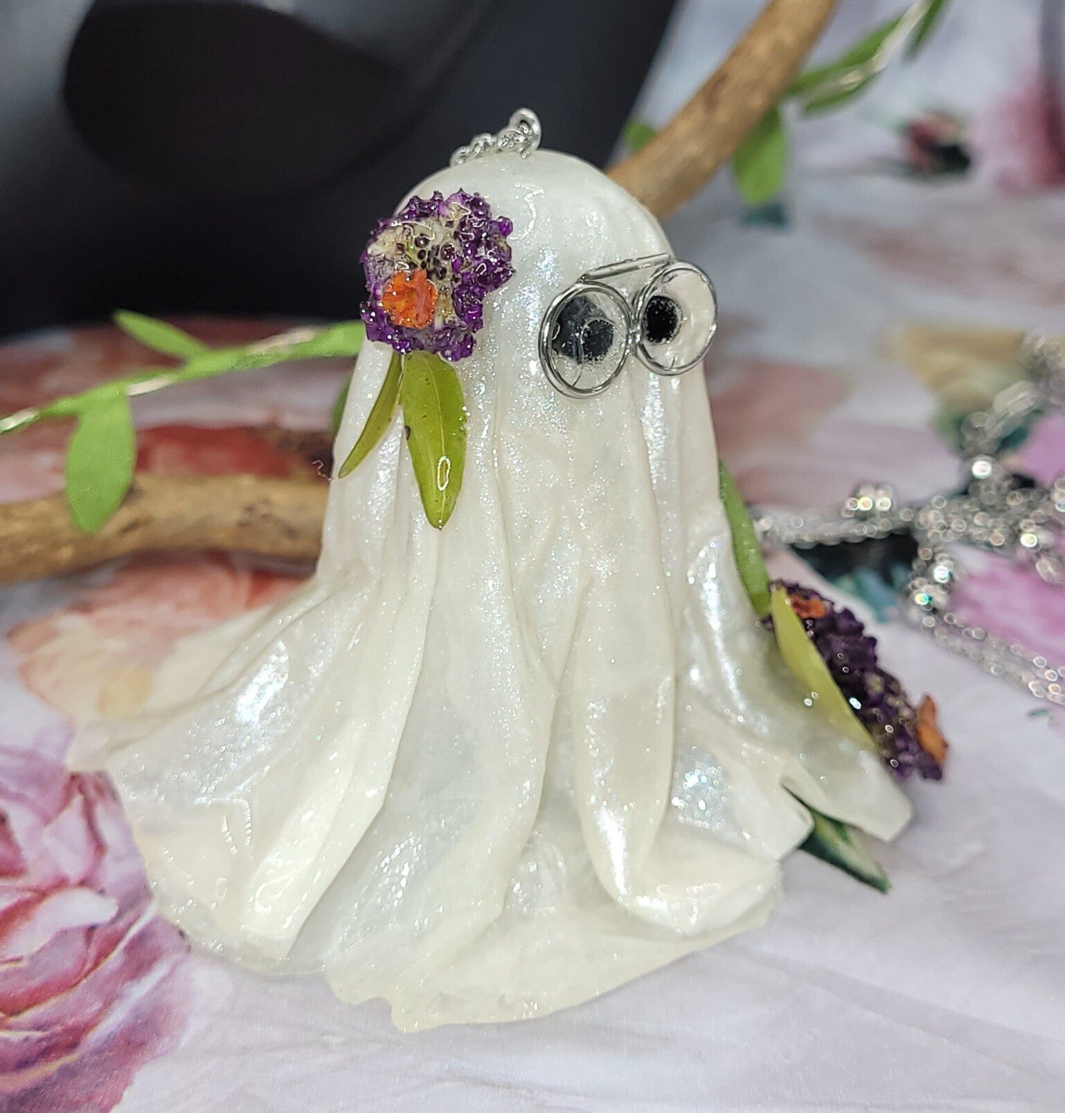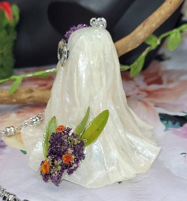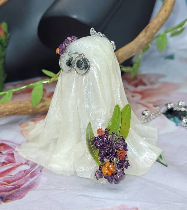 Sur la tête et sur le bas du drapé du fantôme sont placés de minis fleurs violettes et oranges ainsi que des feuilles vertes .