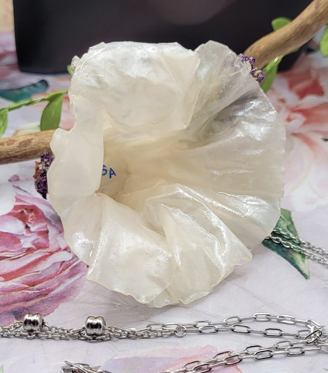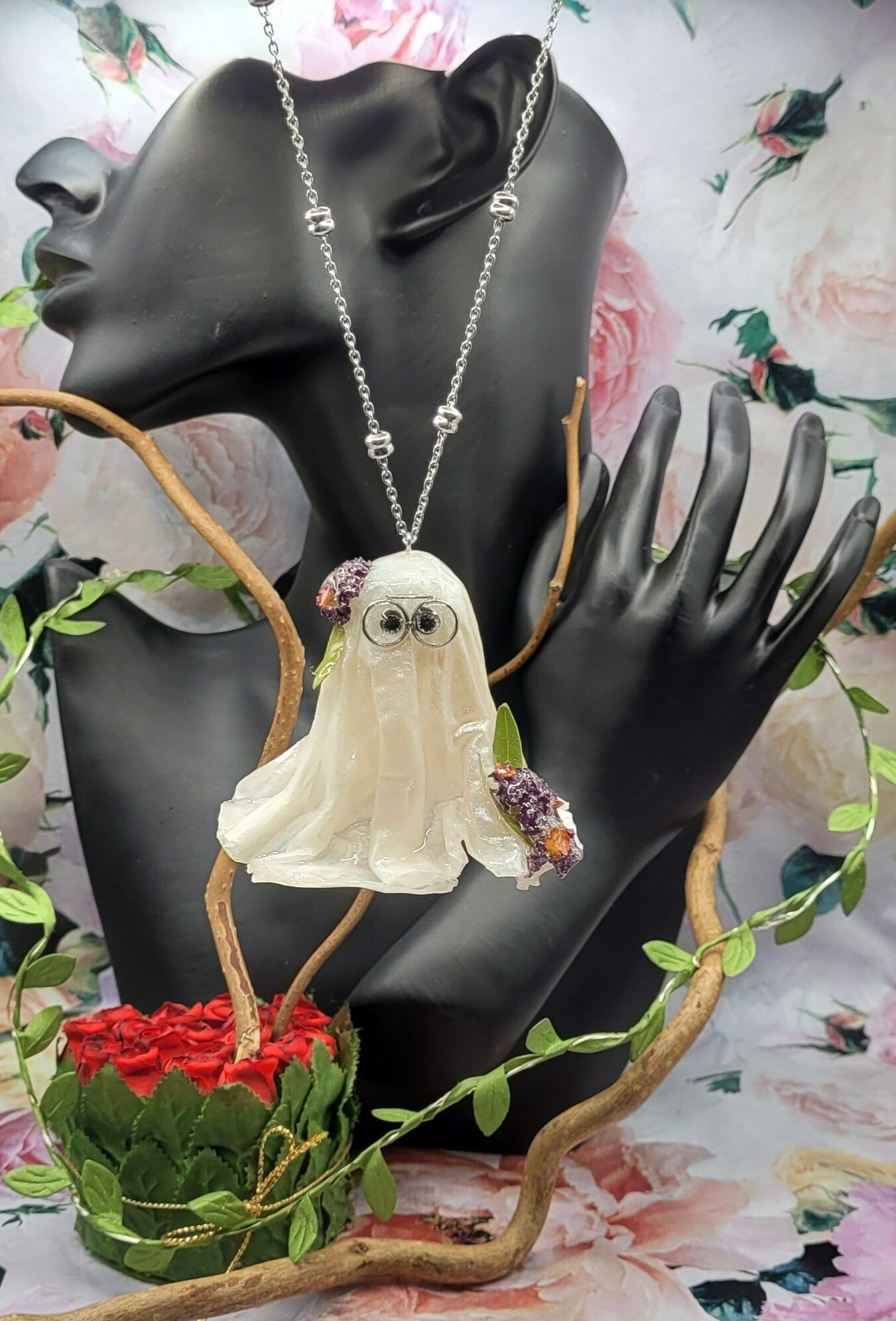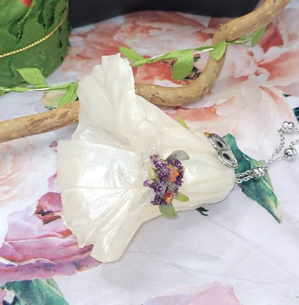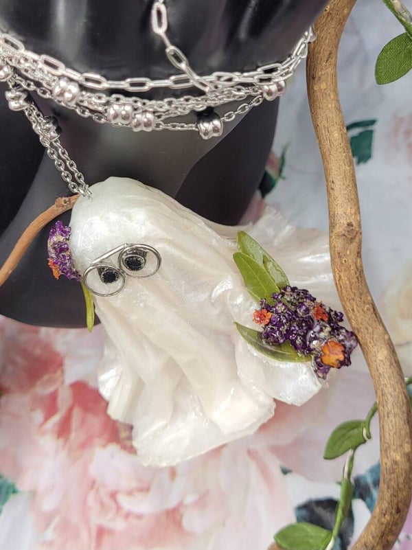 Collier/sautoir composé d'une jolie fantômette fabriquée avec un mouchoir en papier . Formée par mes soins et scellée dans la résine pour garder la forme . Elle est teintée de blanc nacré pour un meilleur rendu