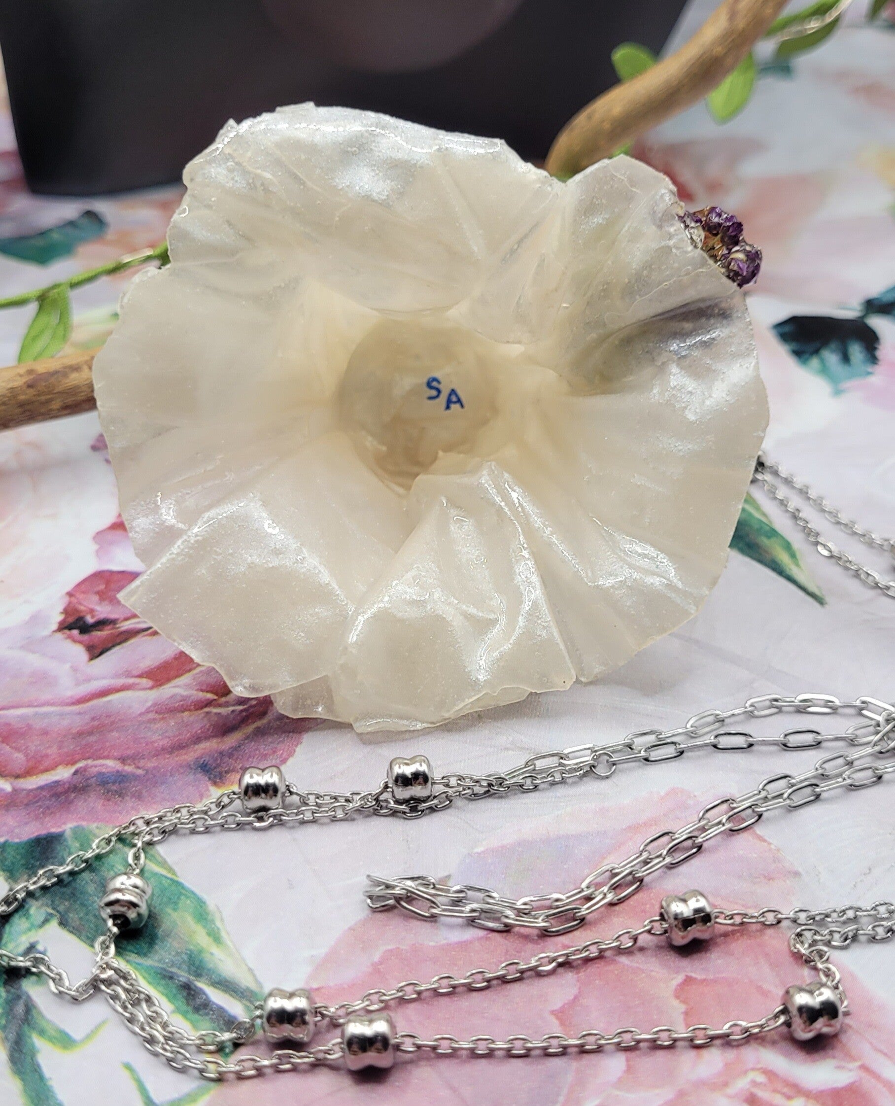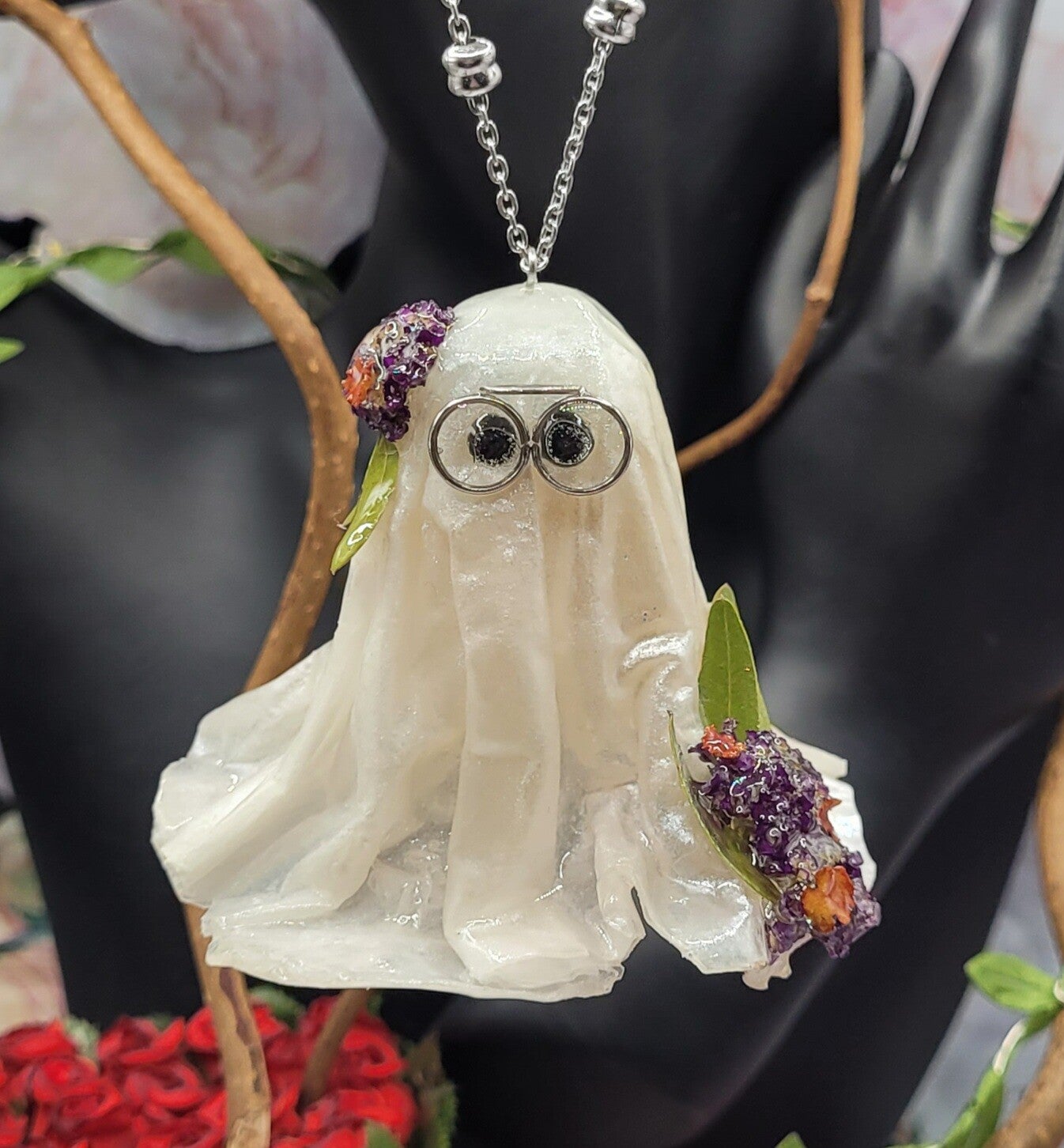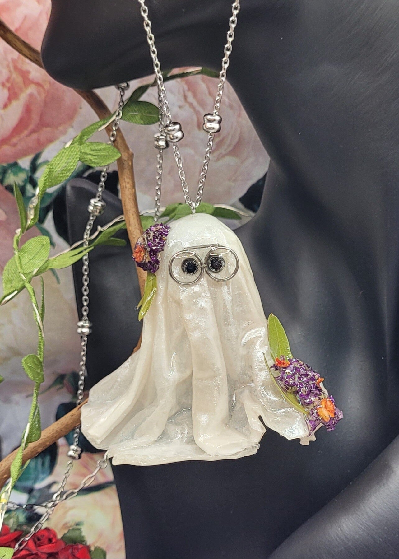 Collier/sautoir composé d'une jolie fantômette fabriquée avec un mouchoir en papier . Formée par mes soins et scellée dans la résine pour garder la forme . Elle est teintée de blanc nacré pour un meilleur rendu