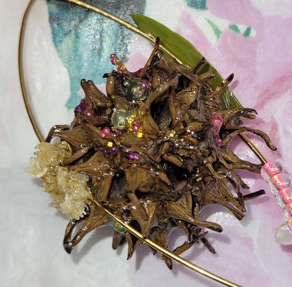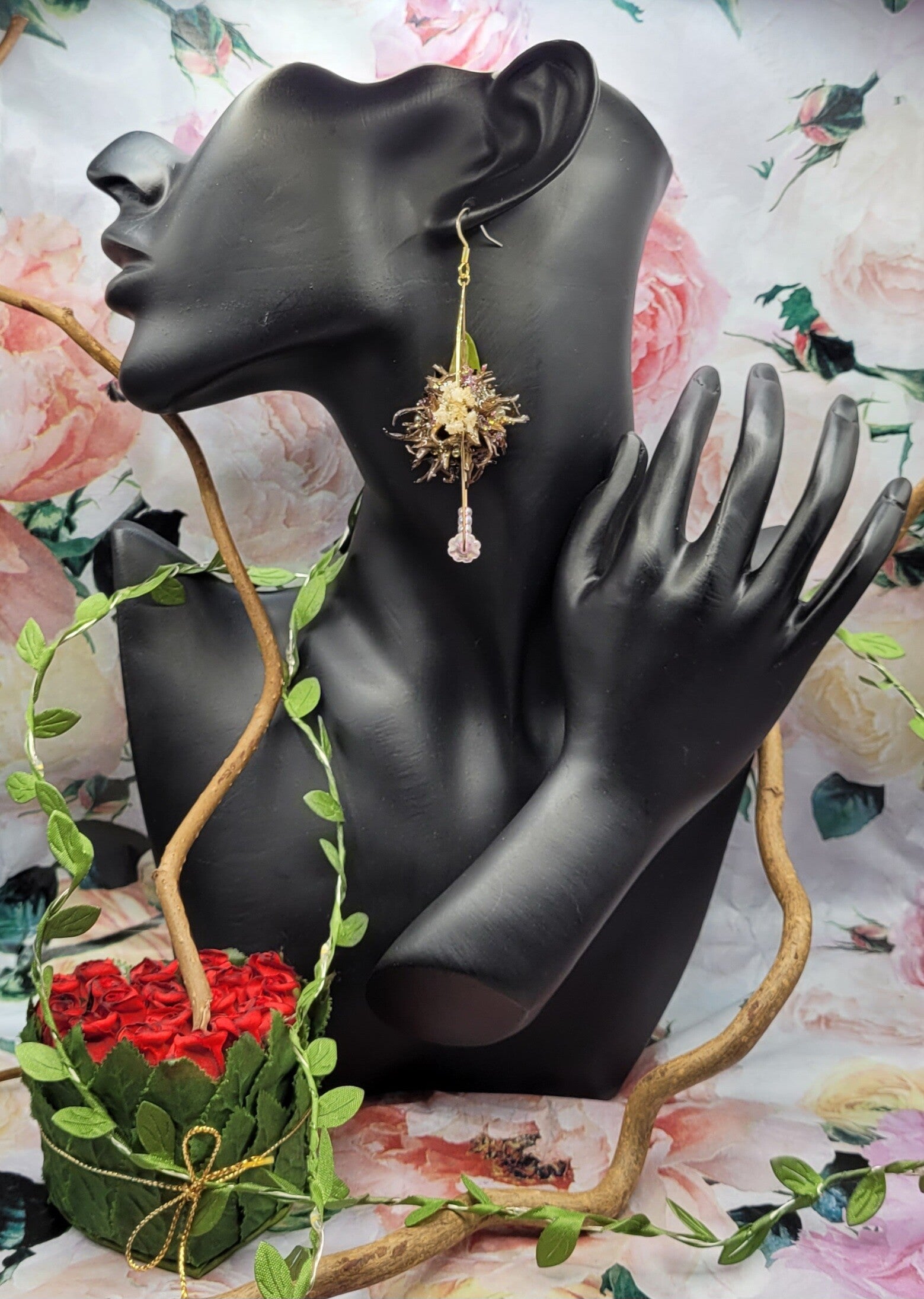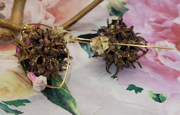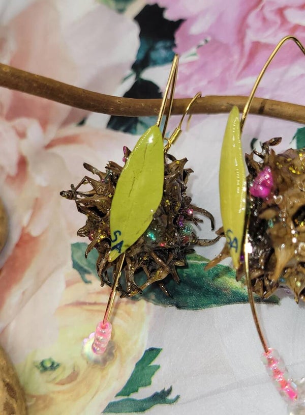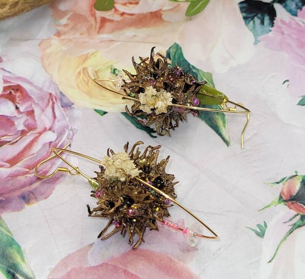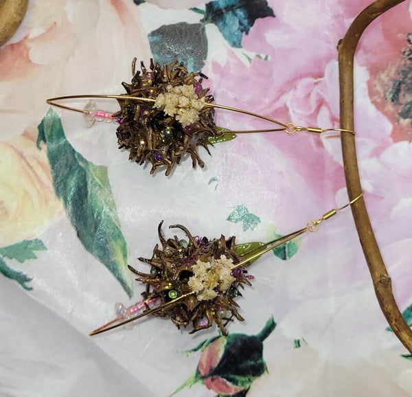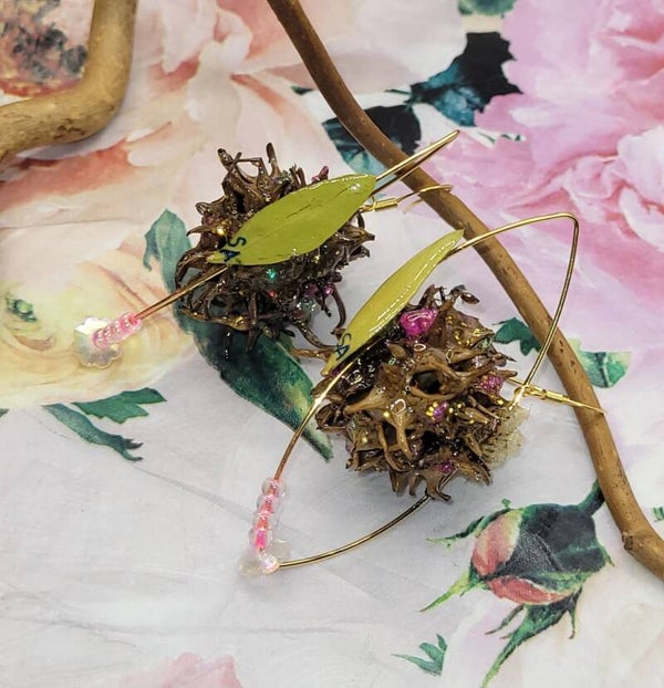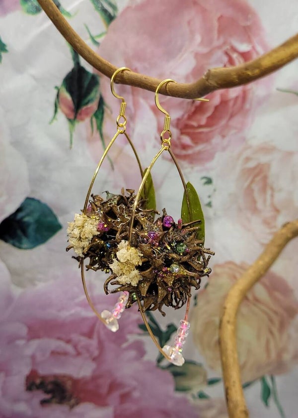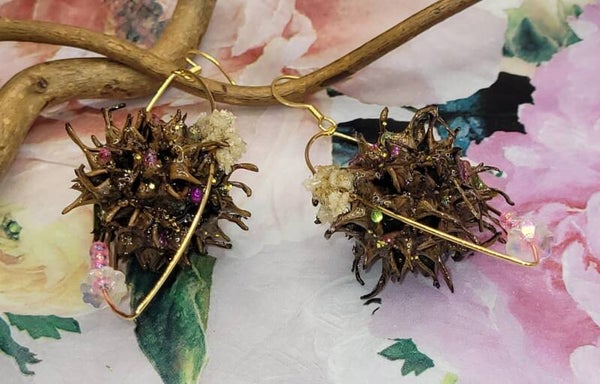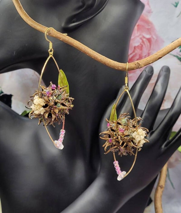 Boucles d'oreilles composées d'un fruit provenant du Liquidambar . Cette jolie boule est placée au centre de la boucle d'oreille , maintenue par des créoles de forme ovale .