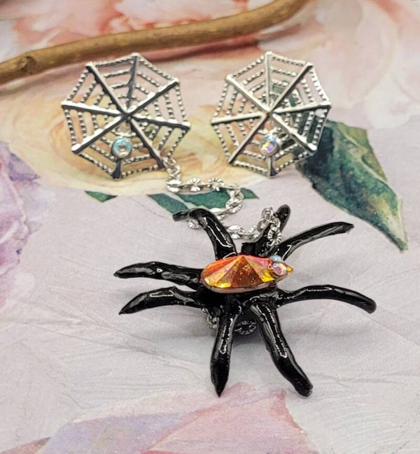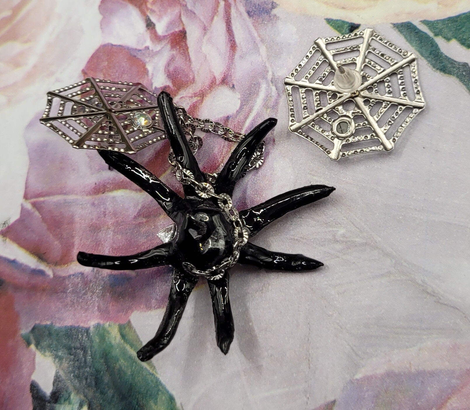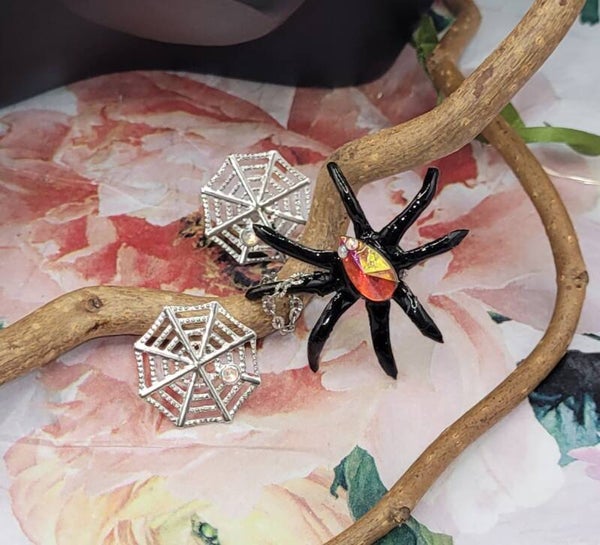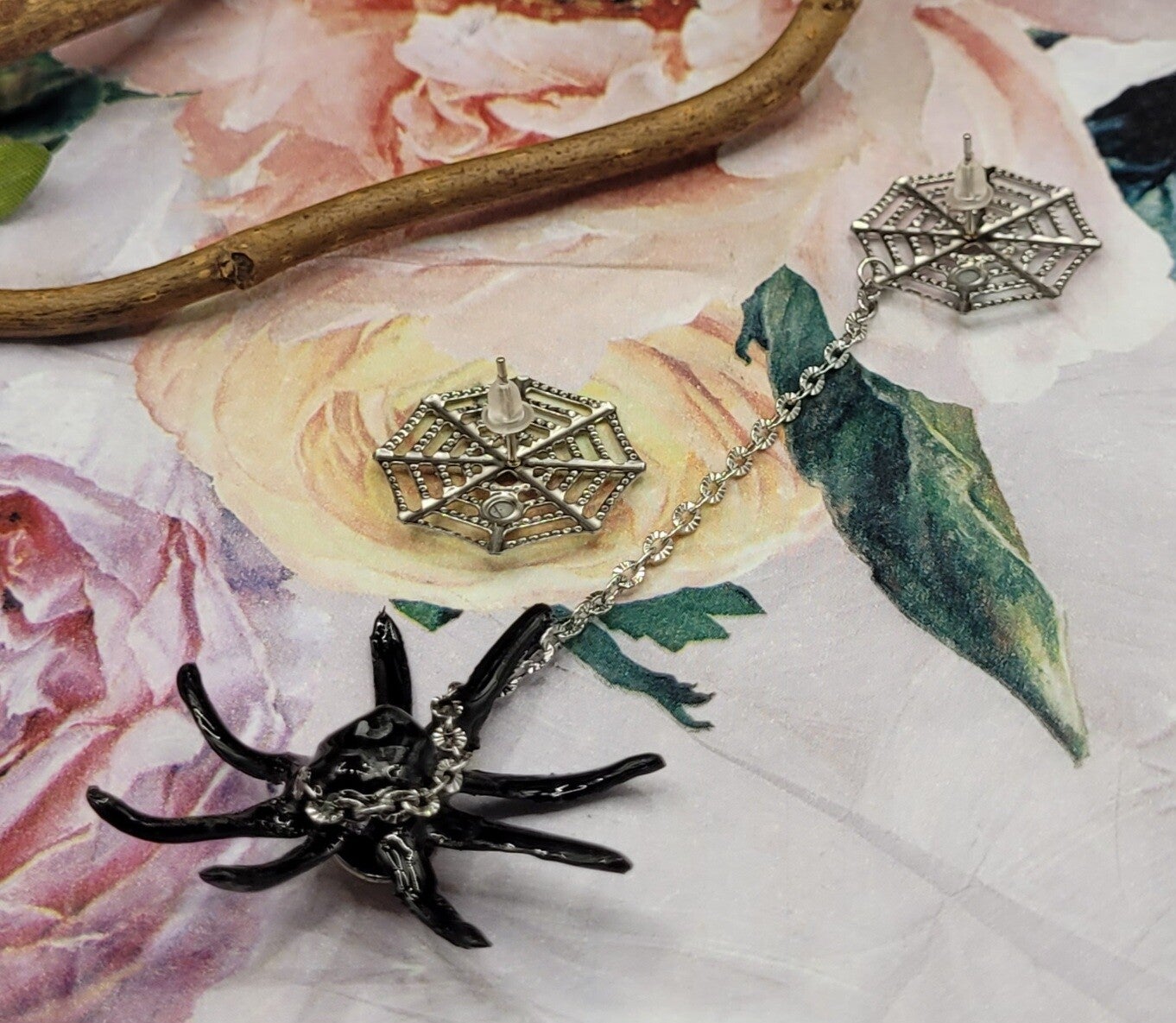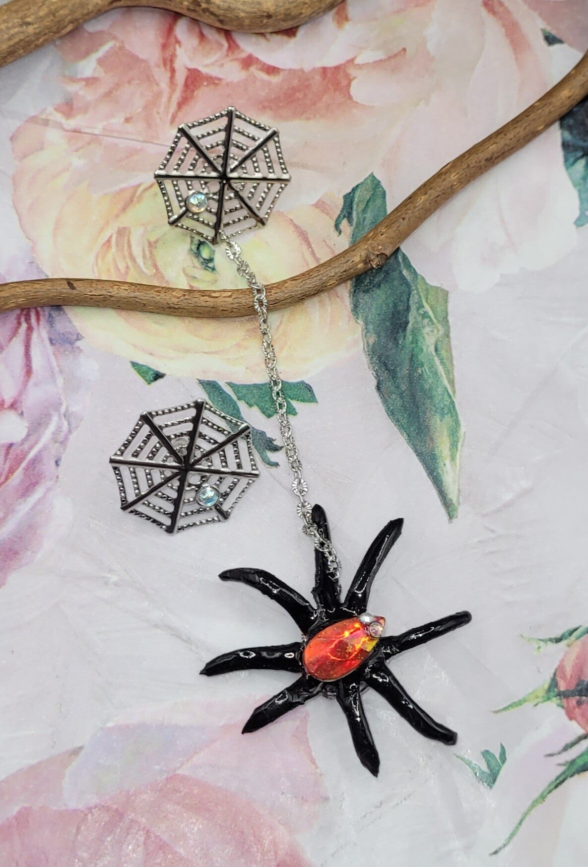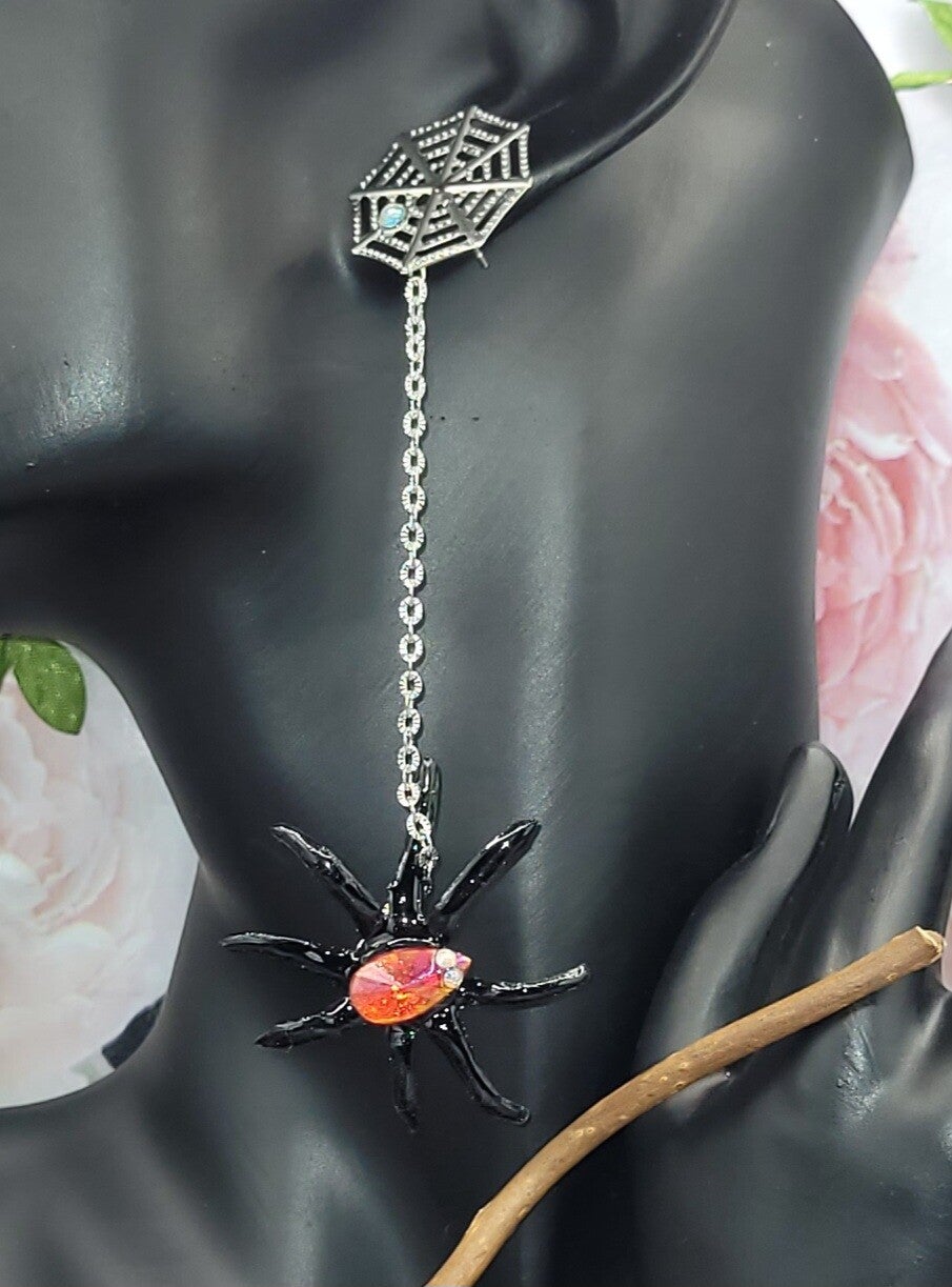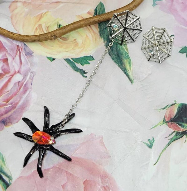 Les boucles d'oreilles sont dépareillées . L'une est courte et ne contient que la toile d'araignée , tanpis que l'autre est pendante .