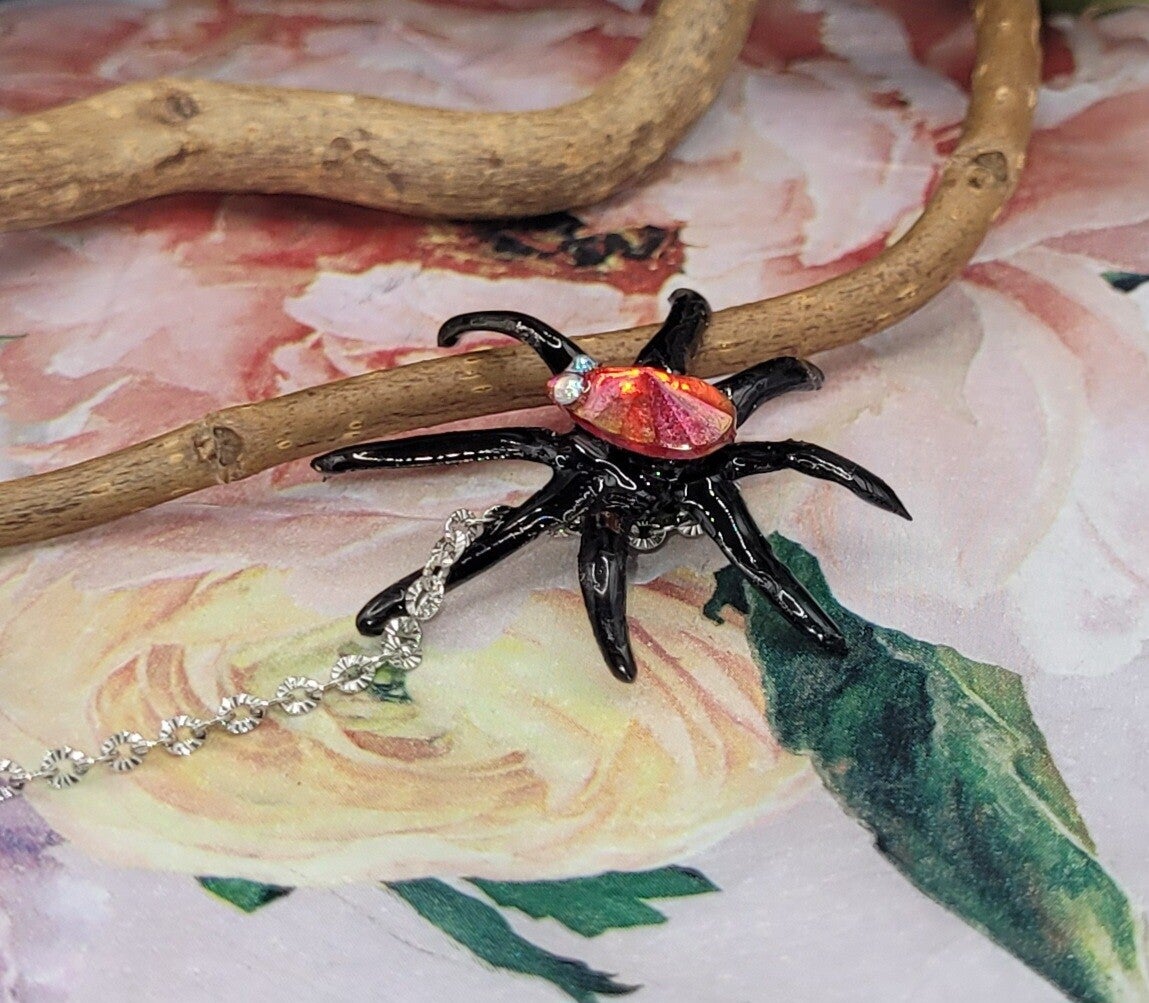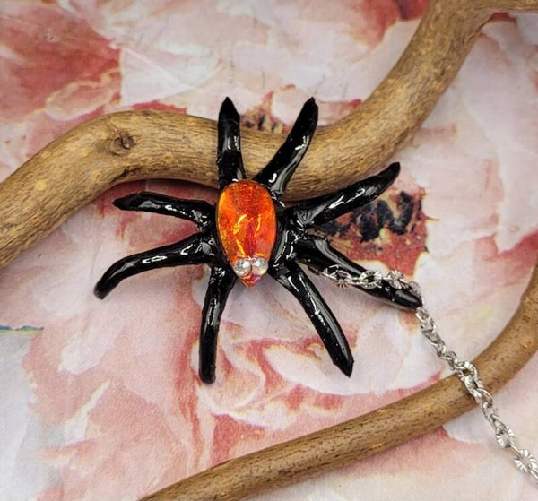 A l'extrémité , une jolie araignée faite avec le pédondule d'une tomate . Teintée en noire , strass rouge et blanc ont été apportés pour le corps et les yeux (Promis elle ne mord pas 😉)