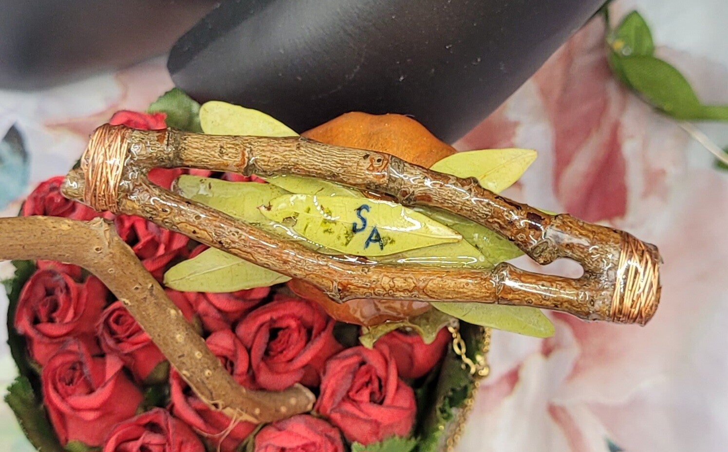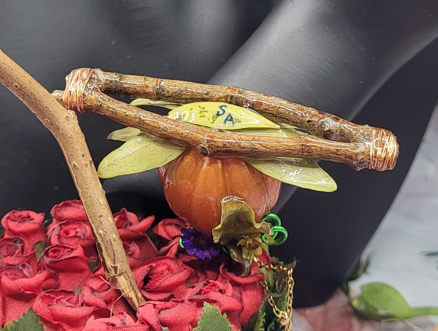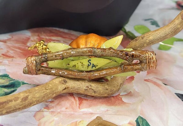 Cette citrouille repose sur 6 petites feuilles vertes et 2 branches de bois qui ont été scéllé ensemble avec du fil métallique couleur bronze