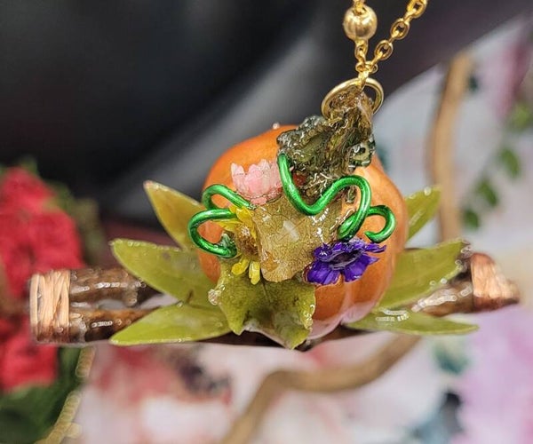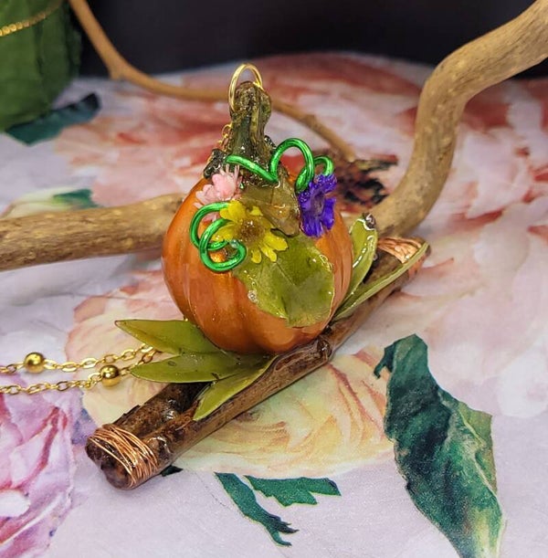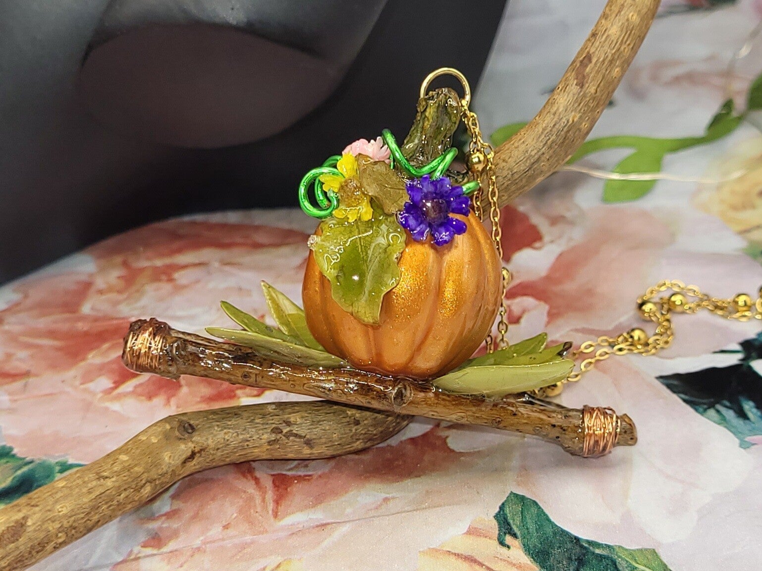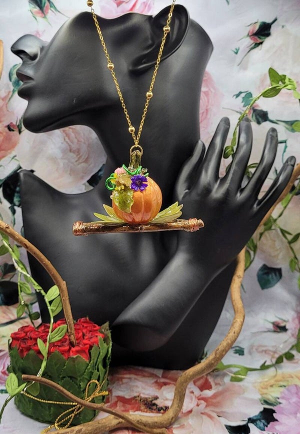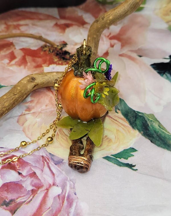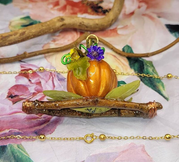 Collier composé d'une jolie citrouille faite avec une grosse perle qui a été teinté en orange . La queue de la citrouille provient d'une tige de courgette .