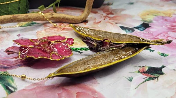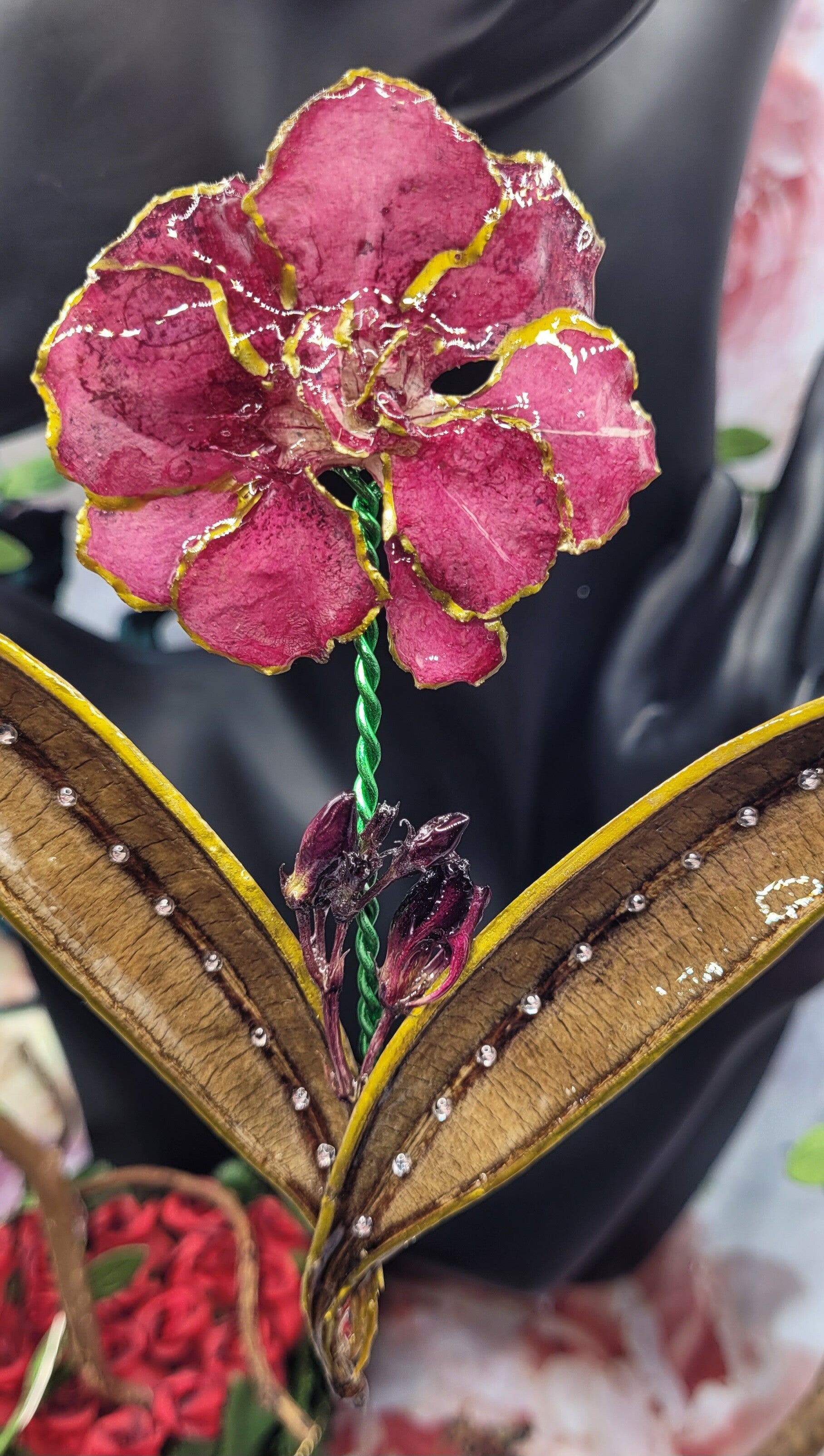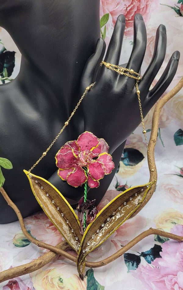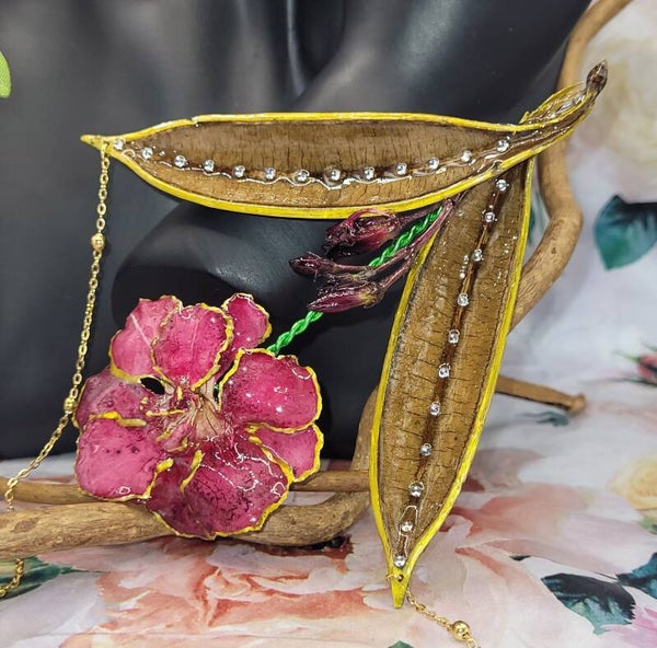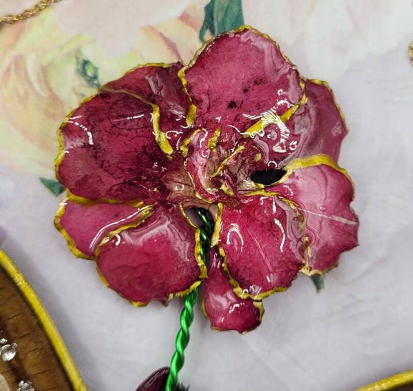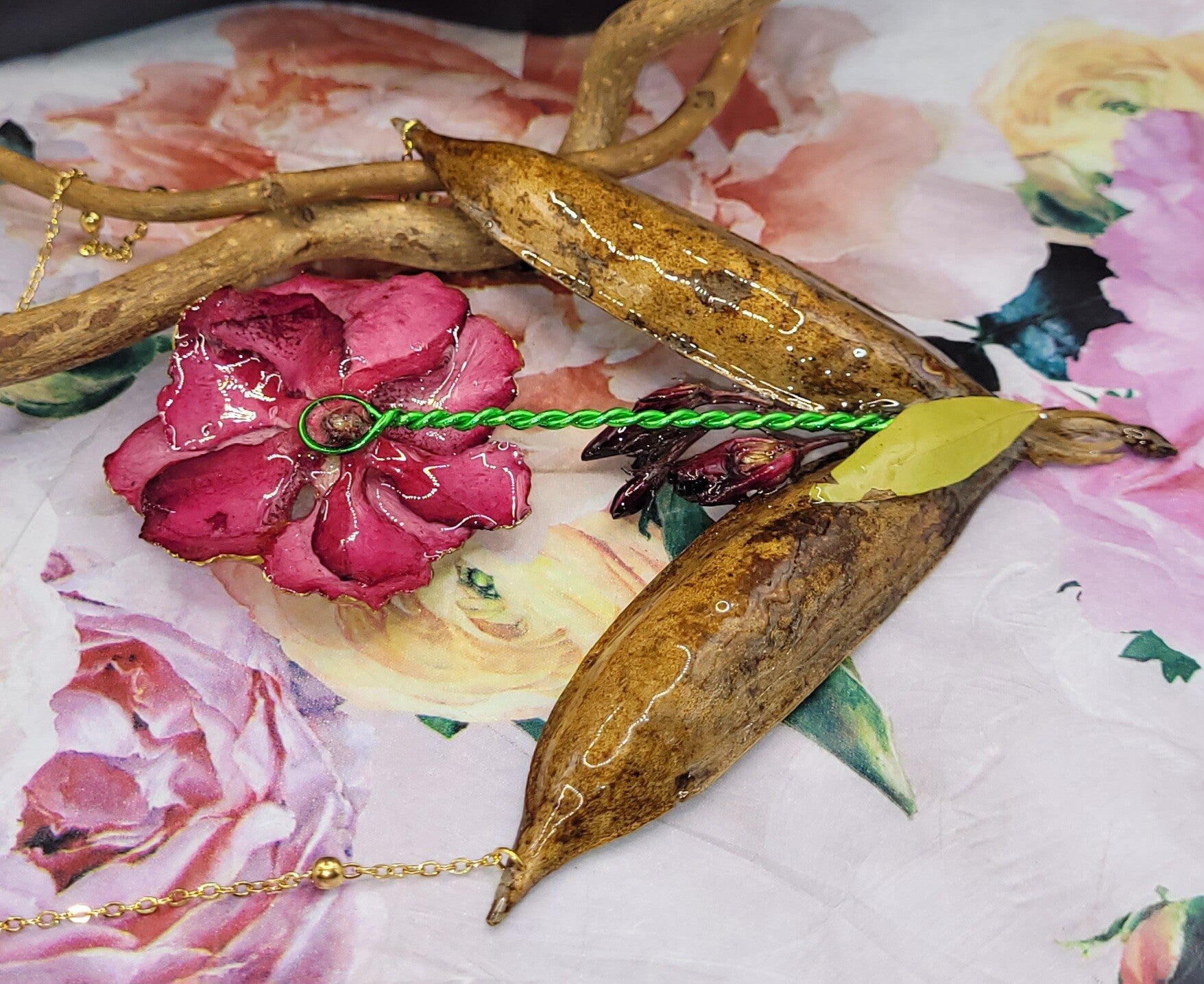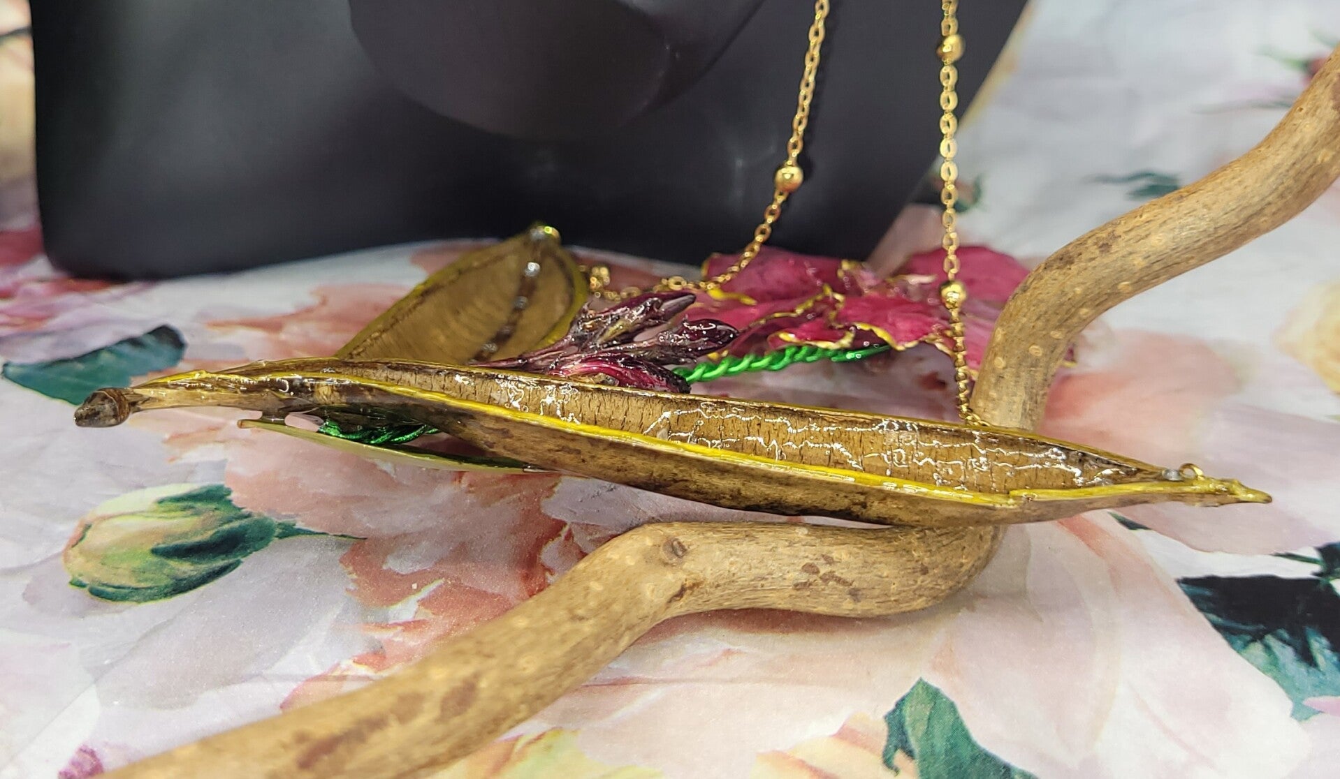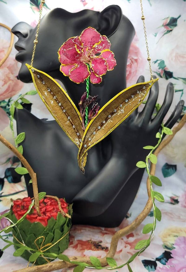 Collier composé d'une belle fleur de laurier rose rouge , aux contours tracés en doré . Maintenue par une tige métallique verte torsadée .