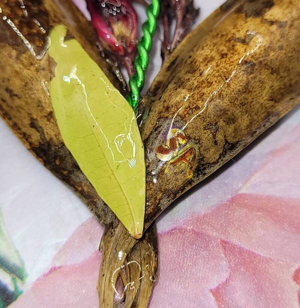 Sur le bas , en guise de feuilles , sont placés , 2 coques de bignone , ressemblantes à des petites barquettes , puiqu'elles sont creuses