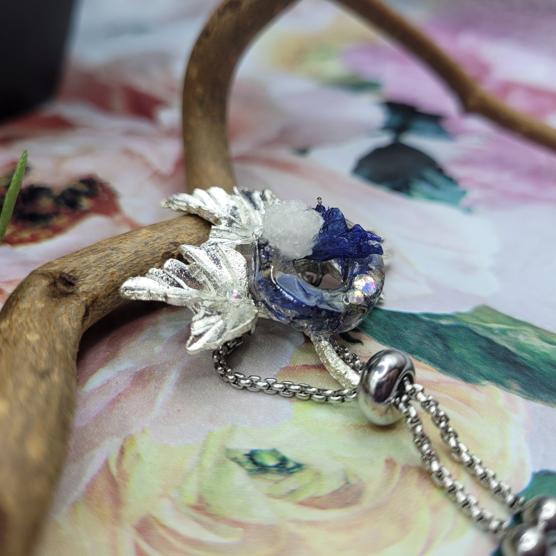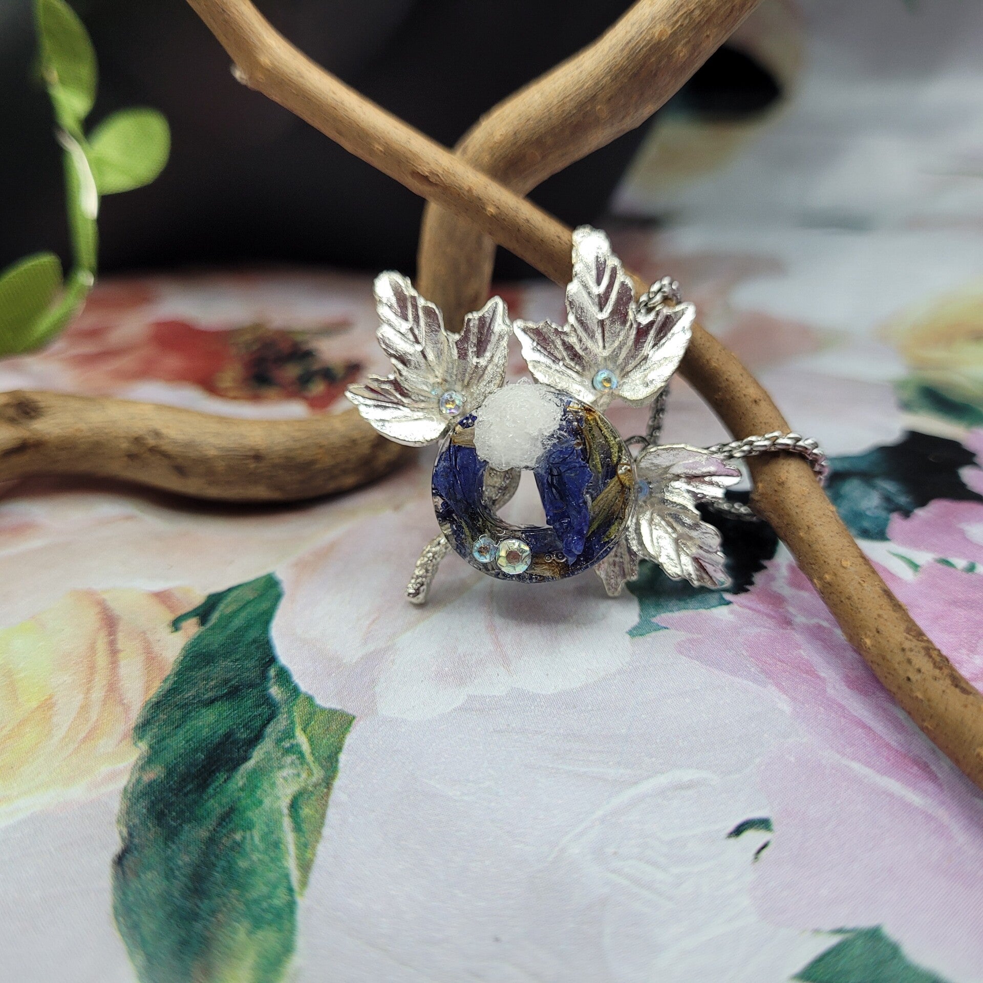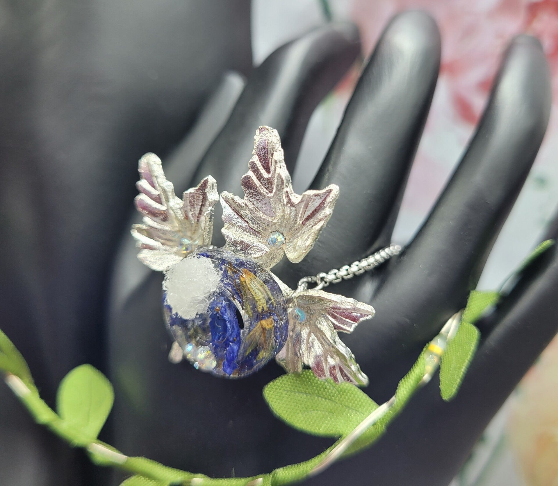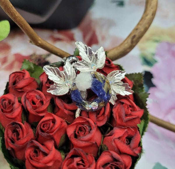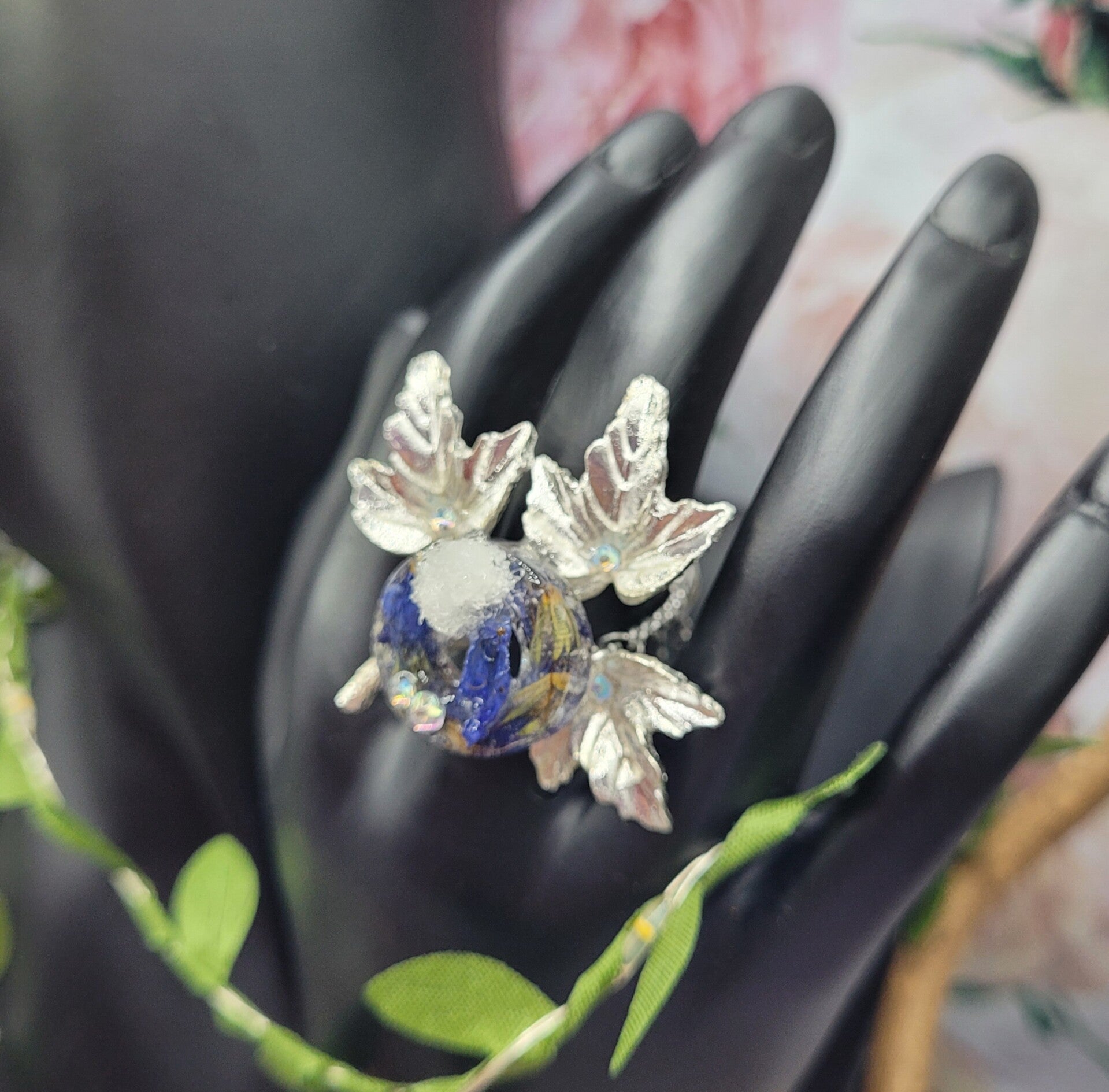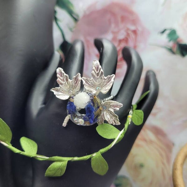 Joli apprêt 3 feuilles ressemblant à de la vigne vierge de couleur argenté , strass , anneau de résine contenant de la fleur bleu appelée Vipérine , une autre vipérine en 3D est posée au dessus de l'anneau , boule de neige formé avec de la ouate