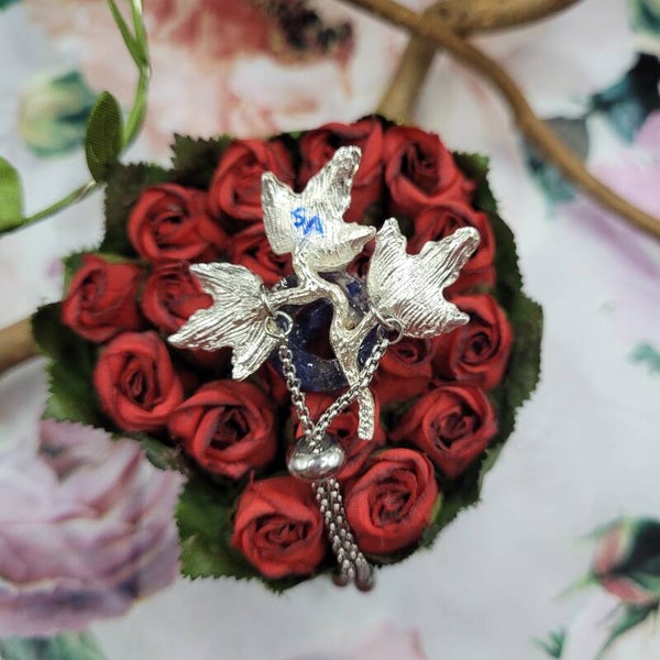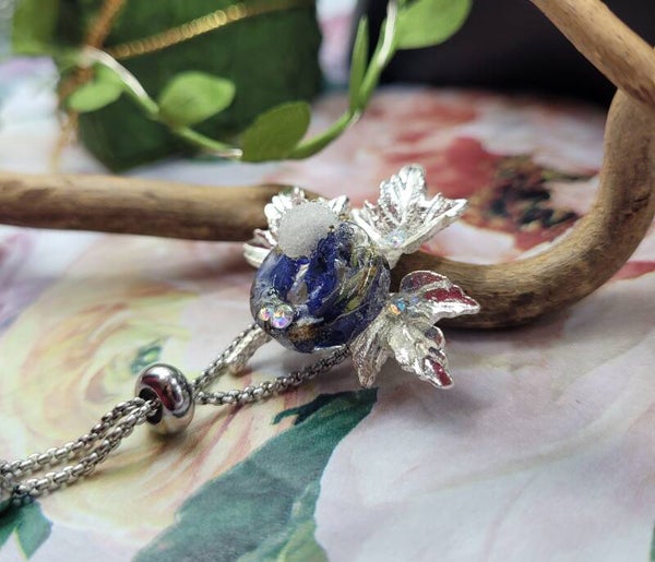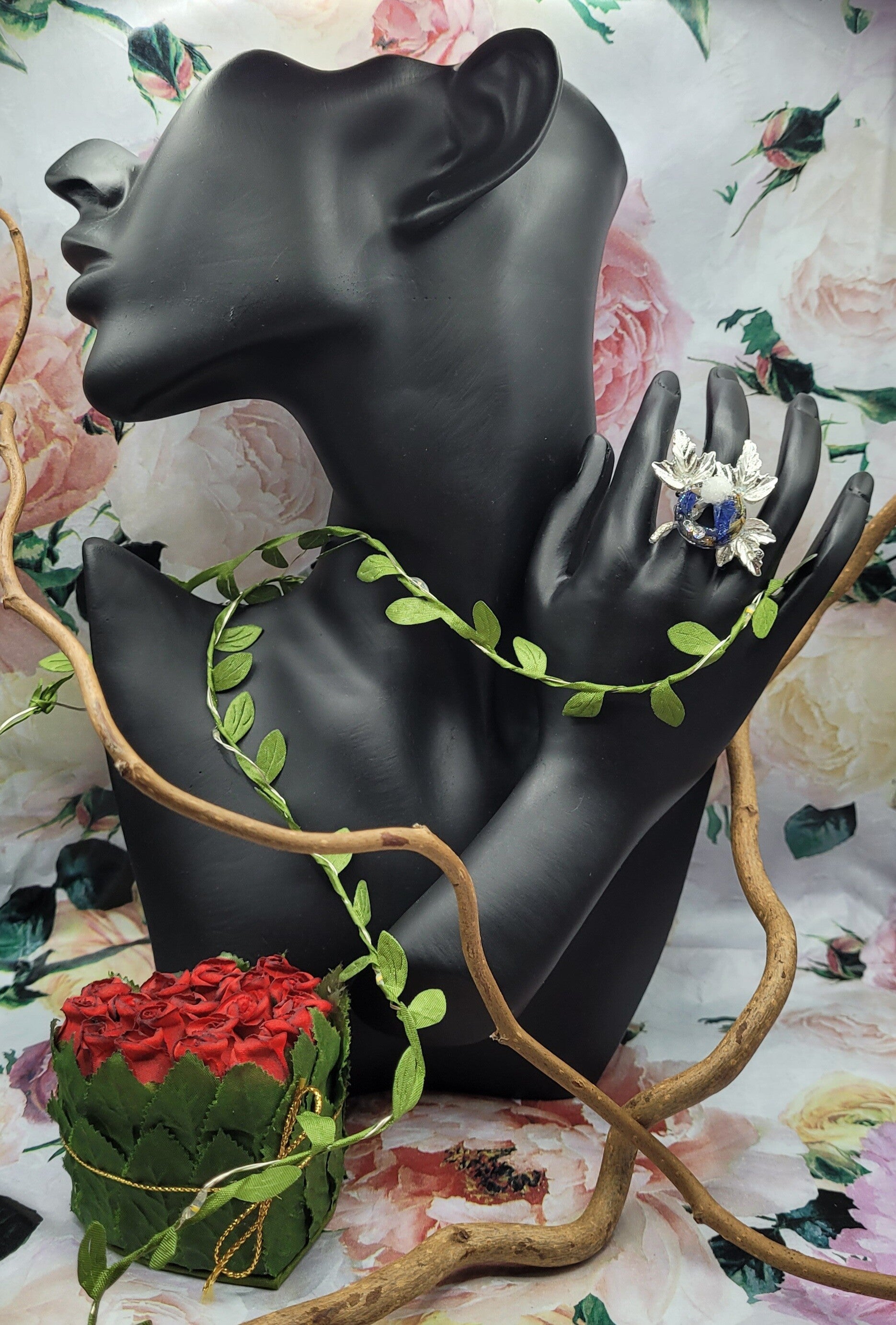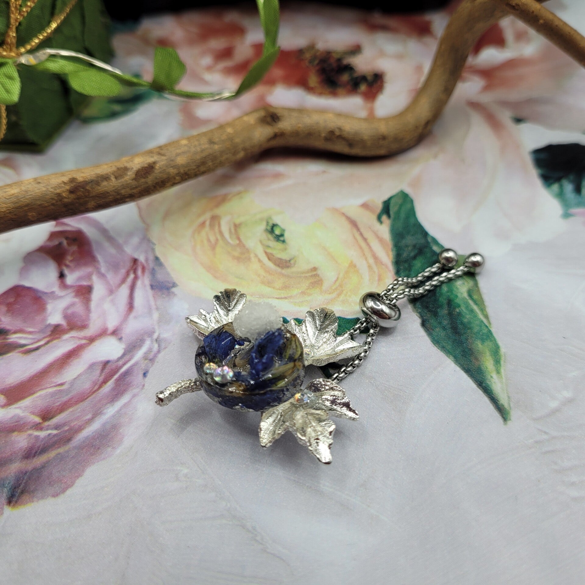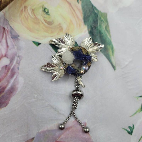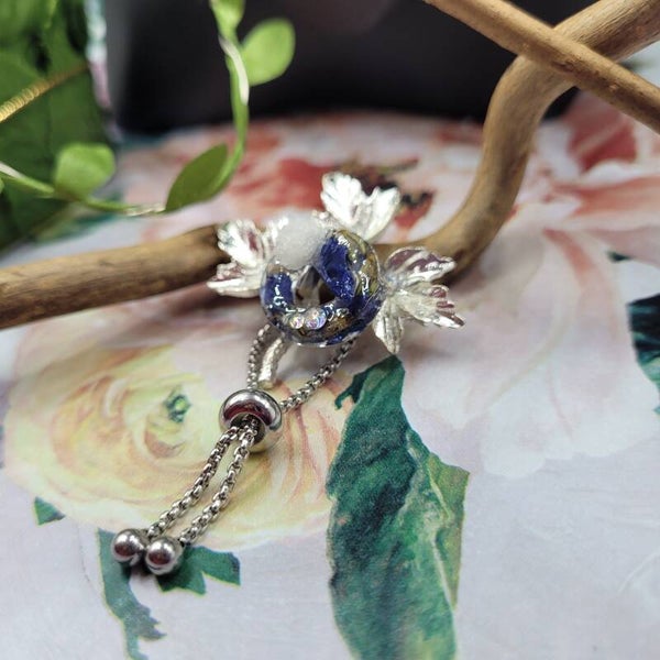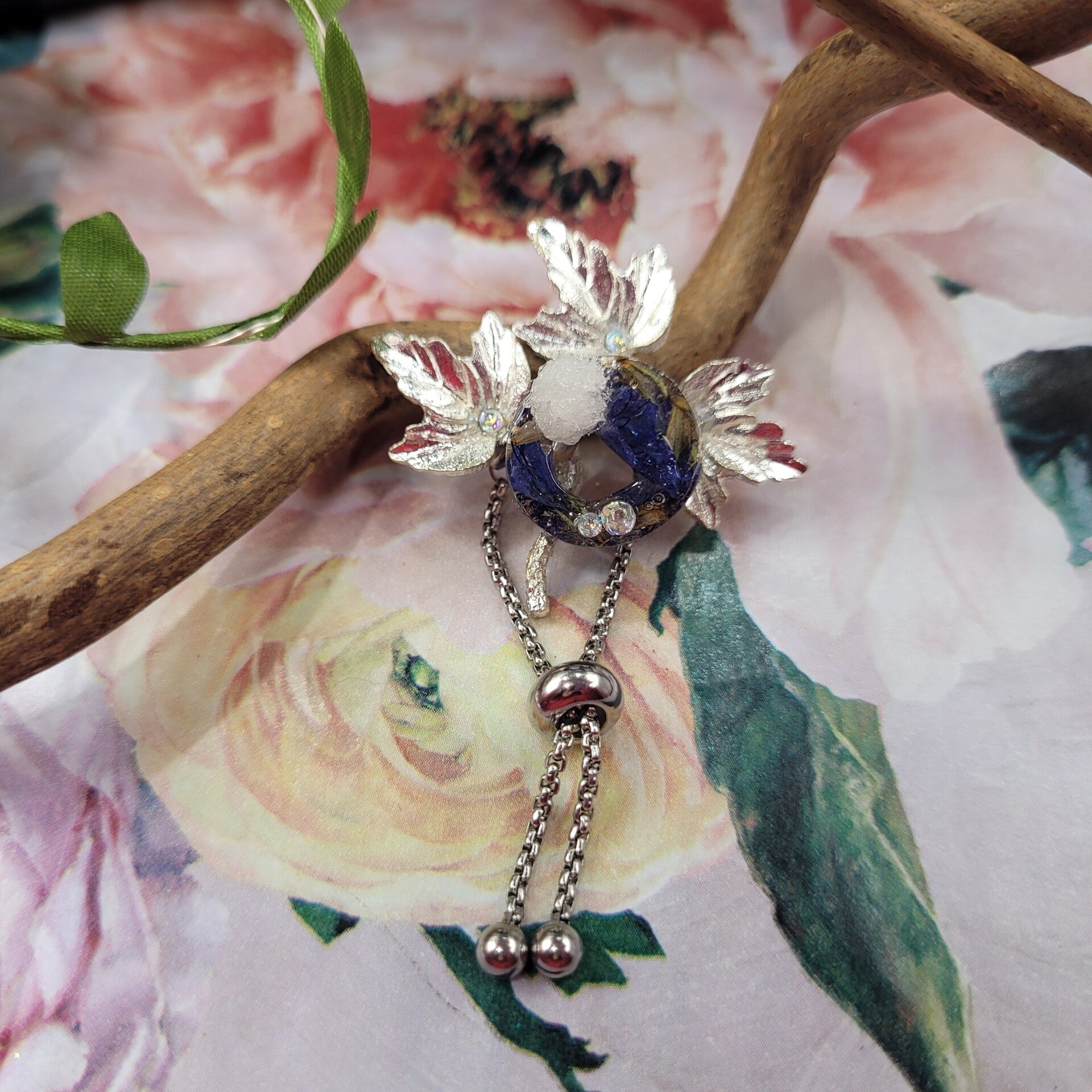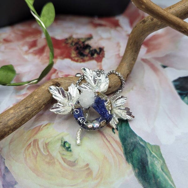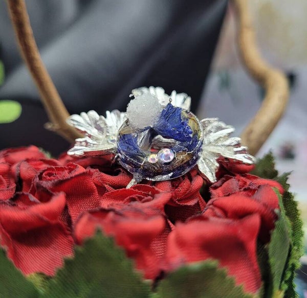 Joli apprêt 3 feuilles ressemblant à de la vigne vierge de couleur argenté , strass , anneau de résine contenant de la fleur bleu appelée Vipérine , une autre vipérine en 3D est posée au dessus de l'anneau , boule de neige formé avec de la ouate